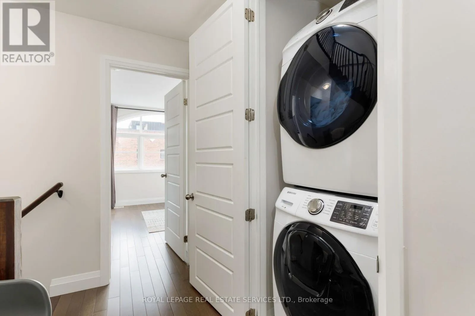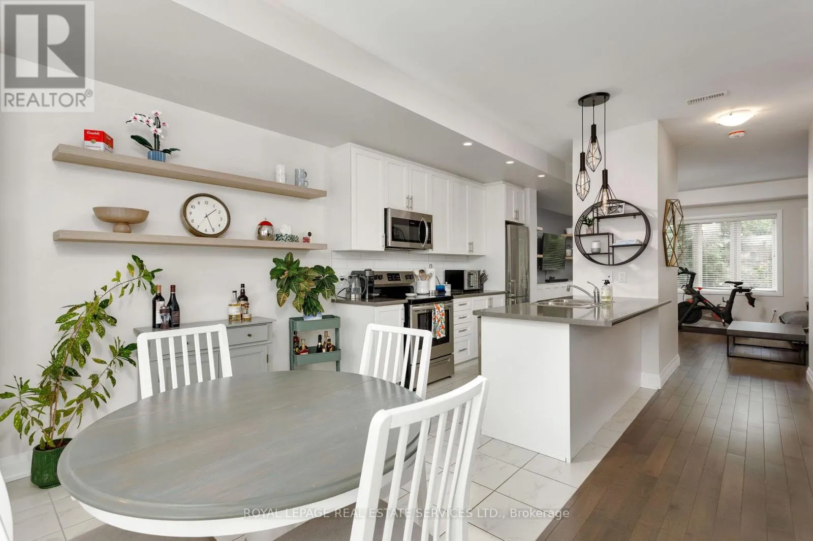 Cross Streets: Plains & Willowbrook. ** Directions: Plains - Willowbrook. Discover stylish, low-maintenance living in this elegant 2-bedroom, 2-bathroom townhome for sale in Burlington's prestigious LaSalle neighbourhood, offering approximately 1,503 sq. ft. of beautifully finished living space plus a private rooftop terrace with treetop views toward Lake Ontario. Ideally located south of the QEW in a quiet enclave, this modern townhome is just minutes from LaSalle Park, & Burlington Golf & Country Club on Lake Ontario, & easy access to schools, shops, restaurants, GO Station & highways. Inside this meticulously maintained one-owner home, enjoy a sophisticated blend of contemporary design & timeless finishes, including engineered hardwood flooring, smooth nine-foot ceilings, a solid oak staircase, new deep baseboards, fresh paint throughout, & large windows with Hunter Douglas blinds. Designed for modern comfort, this home features Bell fibre ultra-high-speed internet, 4 additional Cat5 connections, a Nest thermostat with room sensors, & recently cleaned ducts & dryer vent. You'll also enjoy 2 dedicated parking spaces. The main level offers an expansive living room with a wall of windows, built-in cabinetry, & engineered hardwood flooring, perfect for both entertaining & relaxing. The well-appointed galley kitchen includes beautiful cabinetry, pristine stainless steel appliances, & a large island with a breakfast bar, open to the sunlit dining area. Upstairs, the primary suite features a dramatic Palladian window & a sleek 3-piece ensuite bath with an oversized glass shower. A spacious second bedroom boasts a Juliette balcony & easy access to a 4-piece bathroom with a deep soaker tub/shower combination. Finally, the Zen-inspired rooftop terrace offers the perfect outdoor retreat for morning coffee, barbeques, evening cocktails, & enjoying the peaceful surroundings. (id:27476)