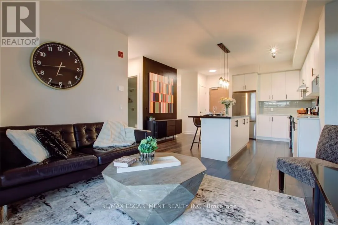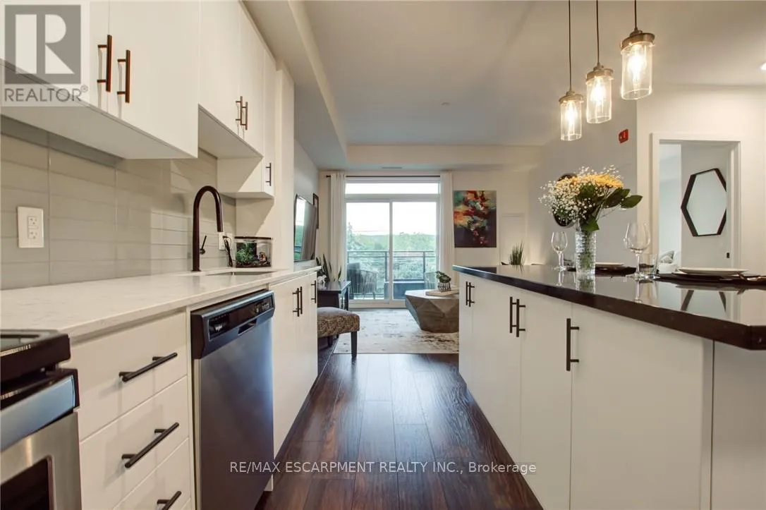 QEW W. - Plains Road E Check out this amazing unit in the Trendy Affinity Condos! Living room, bedroom and terrace offer amazing sunset views of the Escarpment! Upgrades in this lovely high ceiling 1bdrm w den/workspace and 3pc bathroom. In suite laundry, master bedroom closet organizer. Large designer look kitchen area, loads of counter & cupboard space with adjacent bright living room perfect for entertaining. Newly replaced expanded quartz black island counter top with seating for 4-6 great for cooking and entertaining. Brand new stylish cabinet and door black hardware. Matching new quartz black counter in 3pc bathroom with stand up upgraded shower and tiled bathroom. Brand new fashionable black light fixtures throughout. TWO OWNED side-by-side underground parking spaces!! Loads of building amenities roof top patio with lounge area with fireplaces and barbeques. Work out gym with quality equipment, workout and yoga room. Party/games room, conference room, lots of visitor parking with an electric car charger station available. Unit locker is owned and located on the same level, convenient for storage. Providing modern living in the vibrant Aldershot neighbourhood! Located near GO Station, major highways, the downtown core, shopping and more! Lock and-leave lifestyle perfect for busy professionals or empty-nesters. (Investors welcome too...A+++ tenant offering to stay on for additional years). (id:27476)