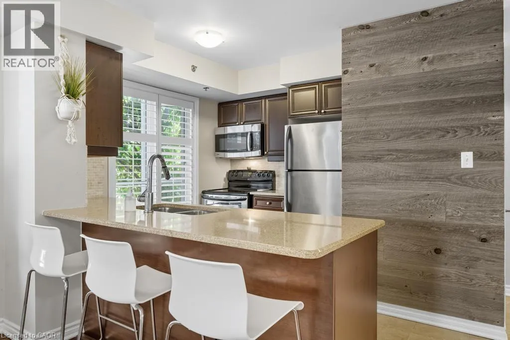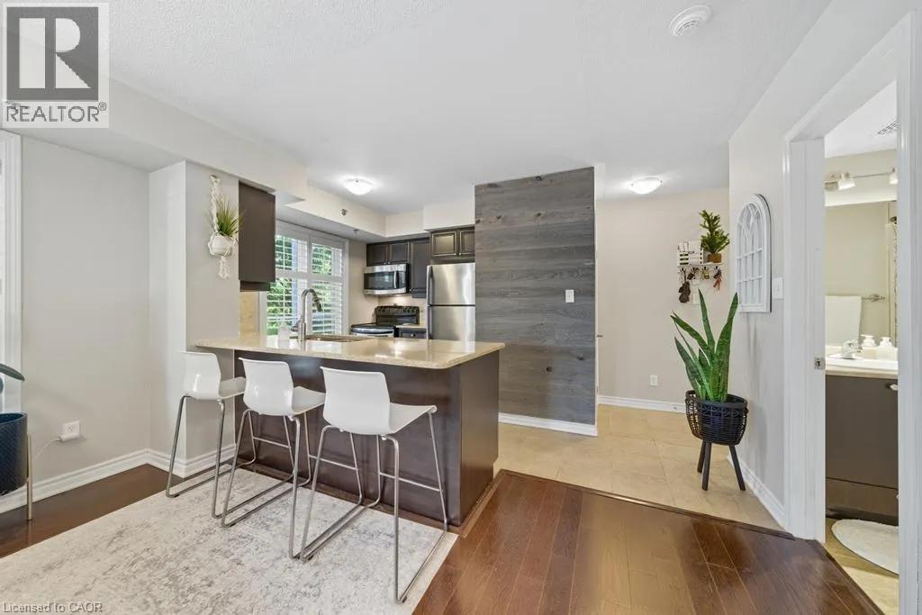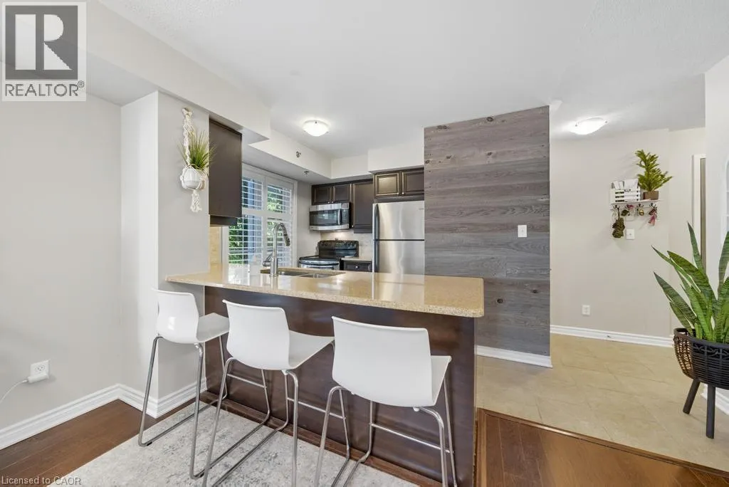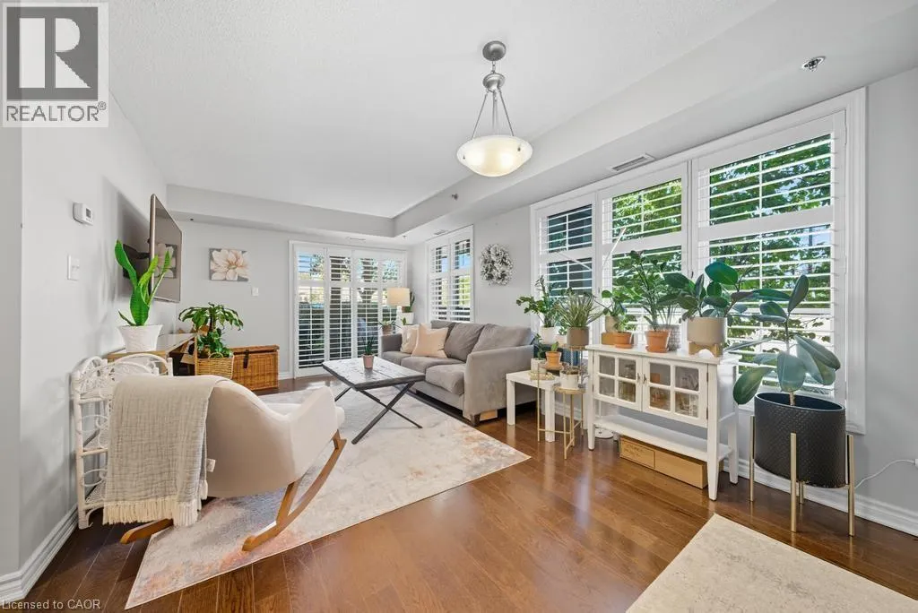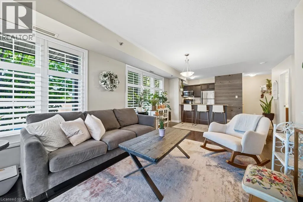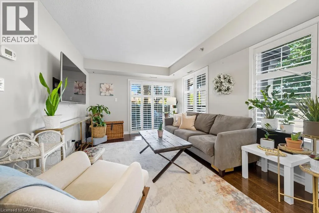 Walkers Line to Dundas Street to Rotary Welcome to this bright and spacious 1 bedroom + den, 1 bathroom corner unit offering 720 sq.ft. of open-concept living on the main floor with a wrap-around patio. Featuring hardwood flooring through the main living areas, a kitchen with stainless steel appliances, quartz countertops, and a breakfast bar. The open living and dining area is filled with natural light from a wall of windows with California shutters. The den provides an ideal space for a home office, while the large primary bedroom offers comfort and functionality. Enjoy the convenience of in-suite laundry, underground parking, and a locker. The private patio is perfect for relaxing or entertaining. Ideally located within walking distance to public transit, schools, parks, restaurants, and shopping, with quick access to major highways for easy commuting. (id:27476)