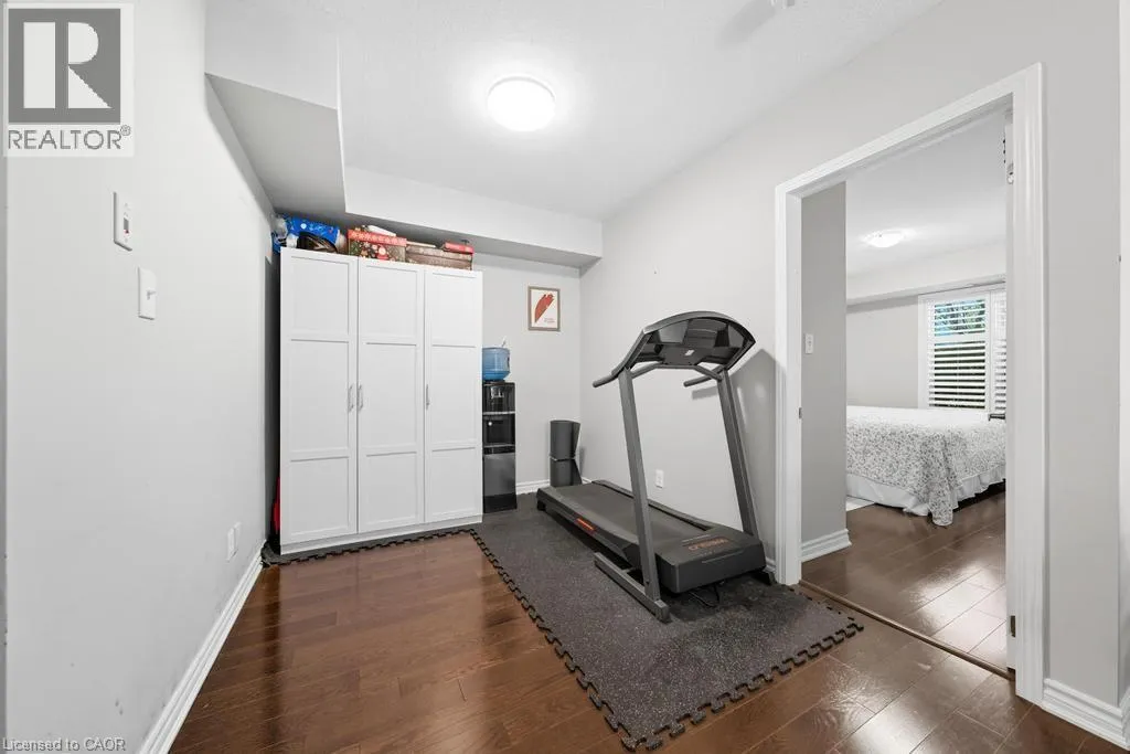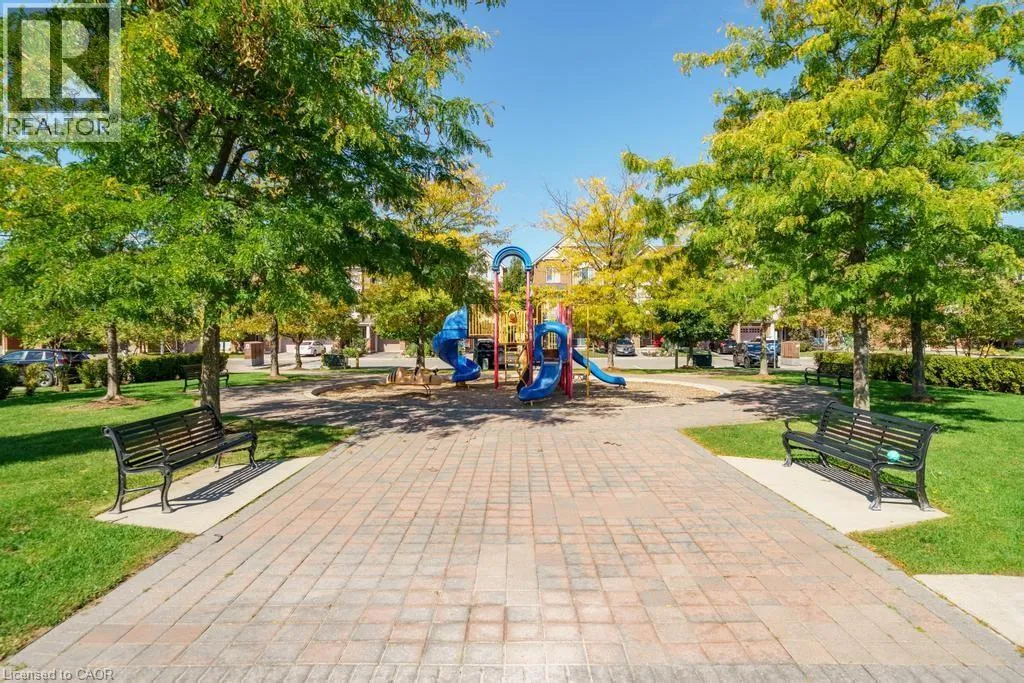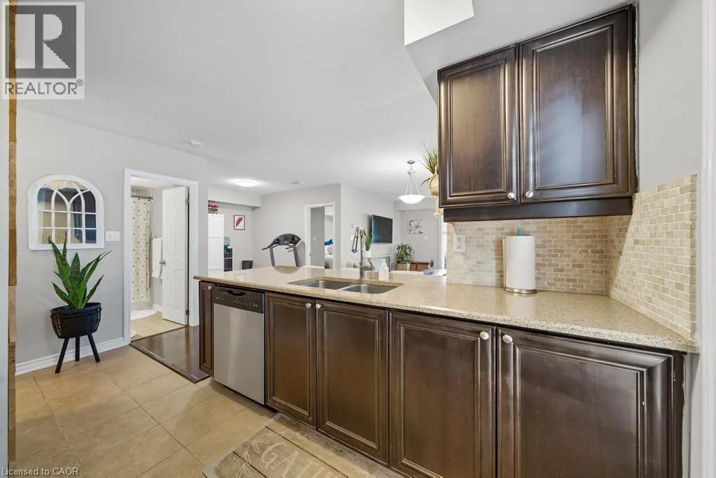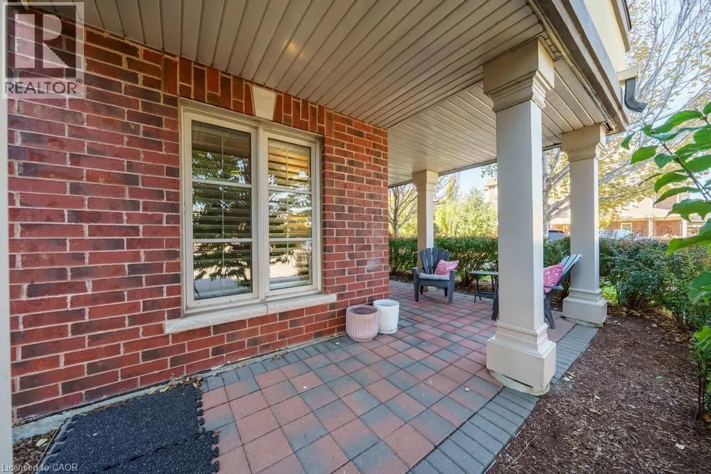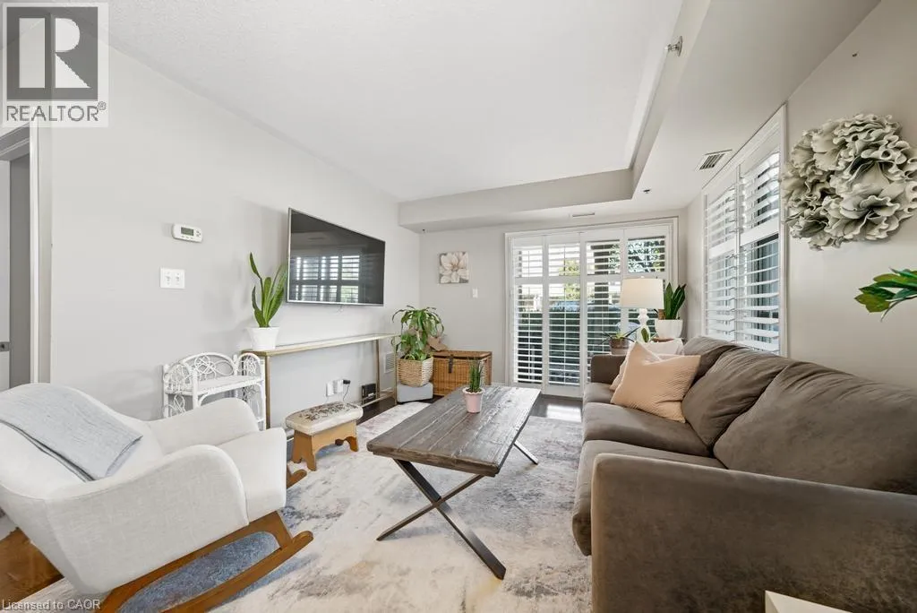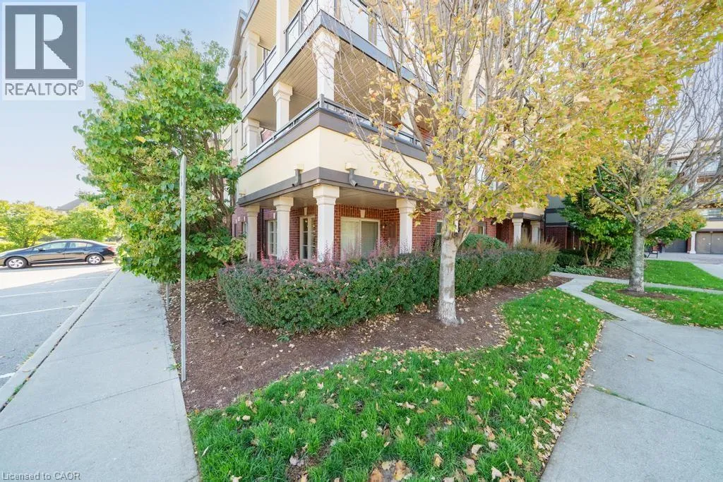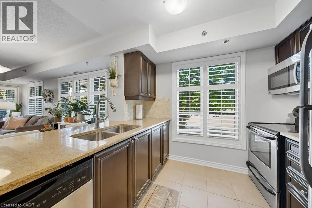 Walkers Line to Dundas Street to Rotary Welcome to this bright and spacious 1 bedroom + den, 1 bathroom corner unit offering 720 sq.ft. of open-concept living on the main floor with a wrap-around patio. Featuring hardwood flooring through the main living areas, a kitchen with stainless steel appliances, quartz countertops, and a breakfast bar. The open living and dining area is filled with natural light from a wall of windows with California shutters. The den provides an ideal space for a home office, while the large primary bedroom offers comfort and functionality. Enjoy the convenience of in-suite laundry, underground parking, and a locker. The private patio is perfect for relaxing or entertaining. Ideally located within walking distance to public transit, schools, parks, restaurants, and shopping, with quick access to major highways for easy commuting. (id:27476)