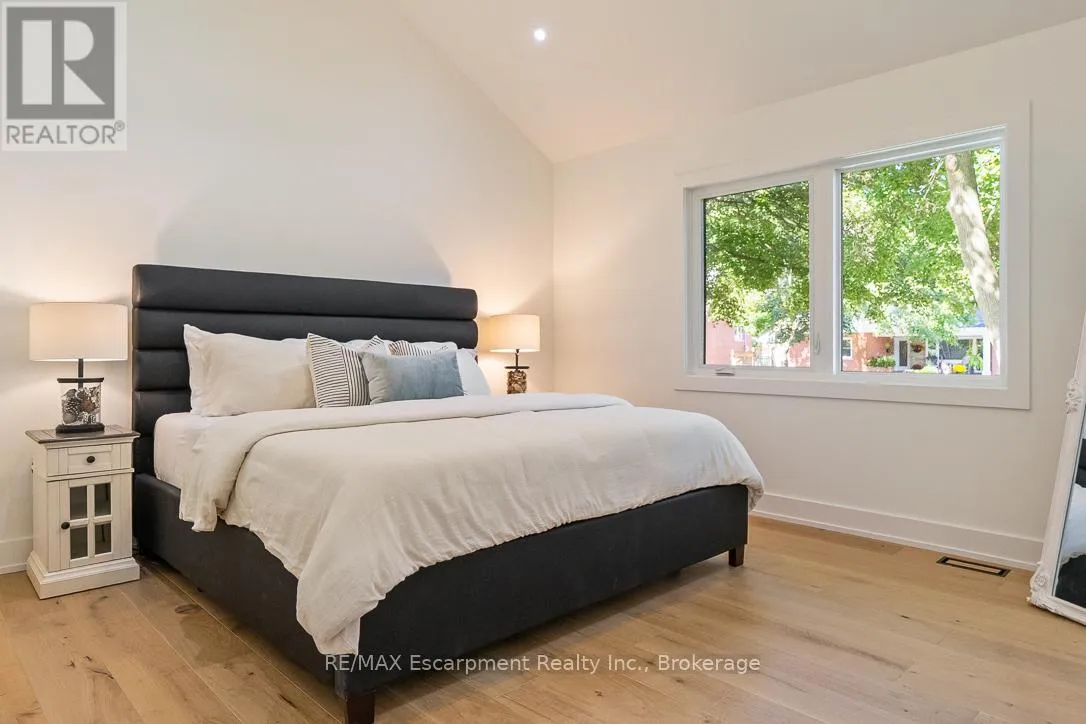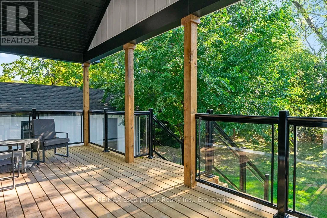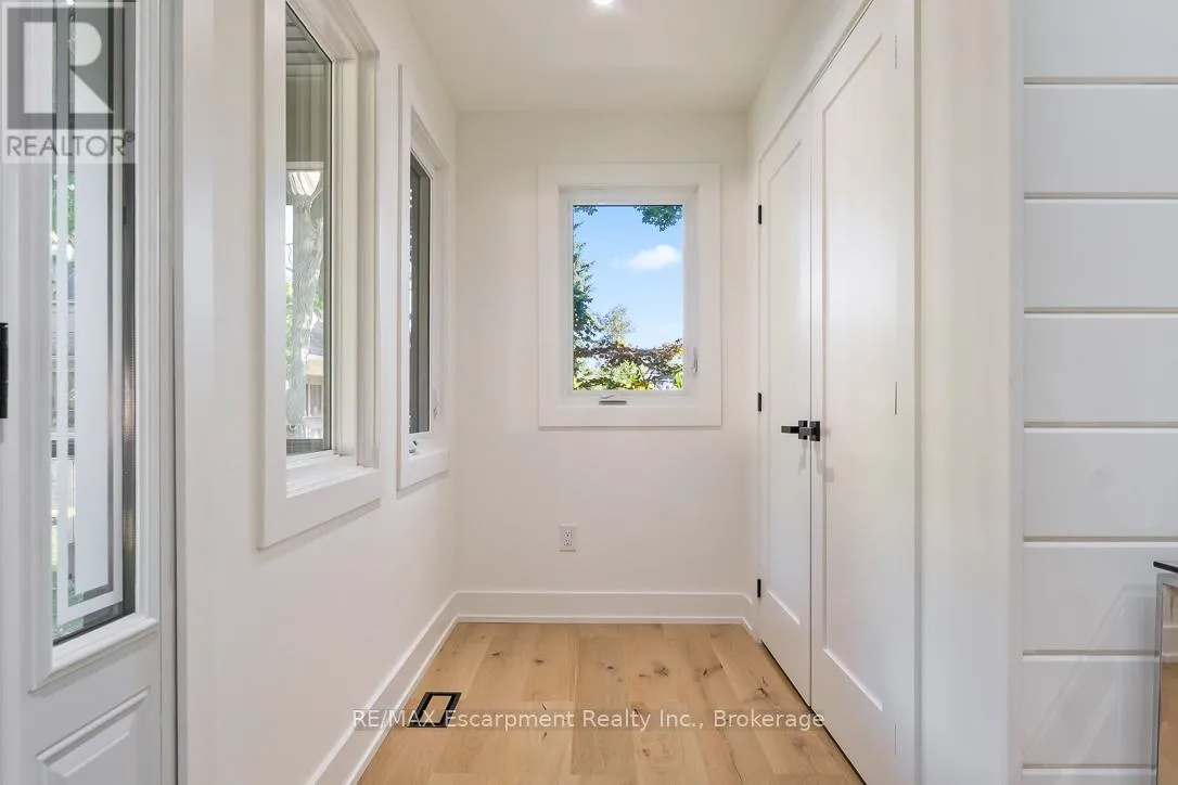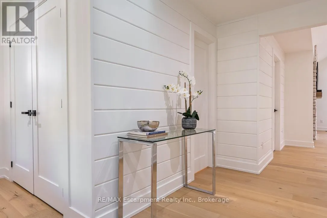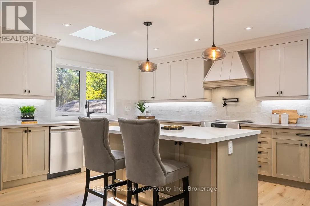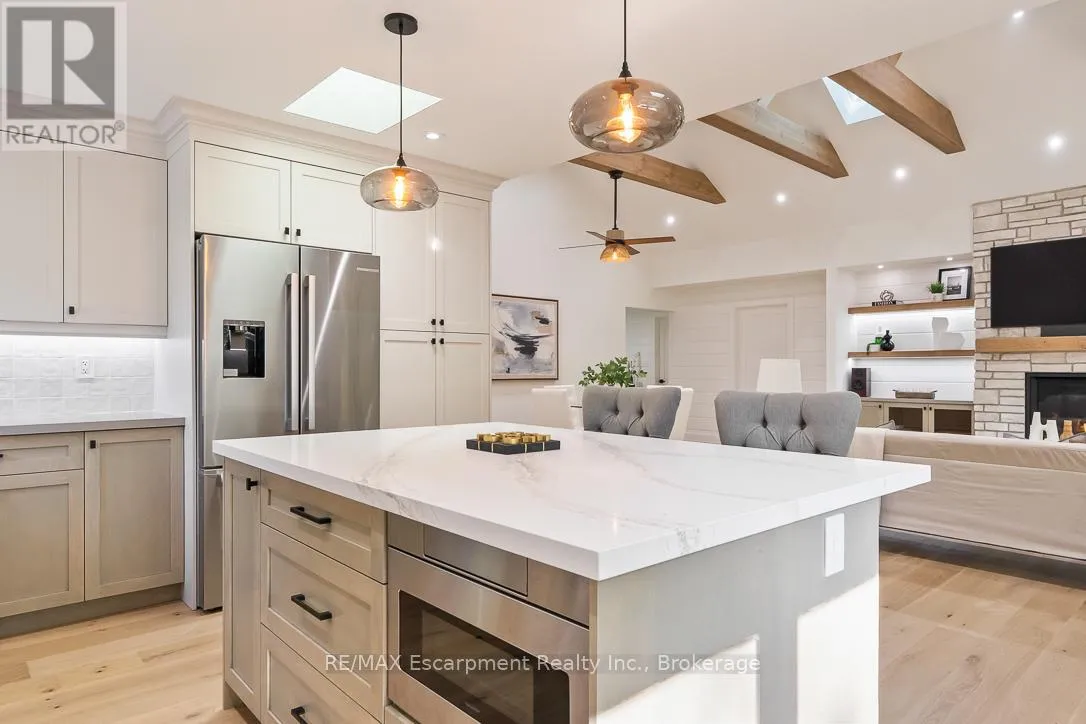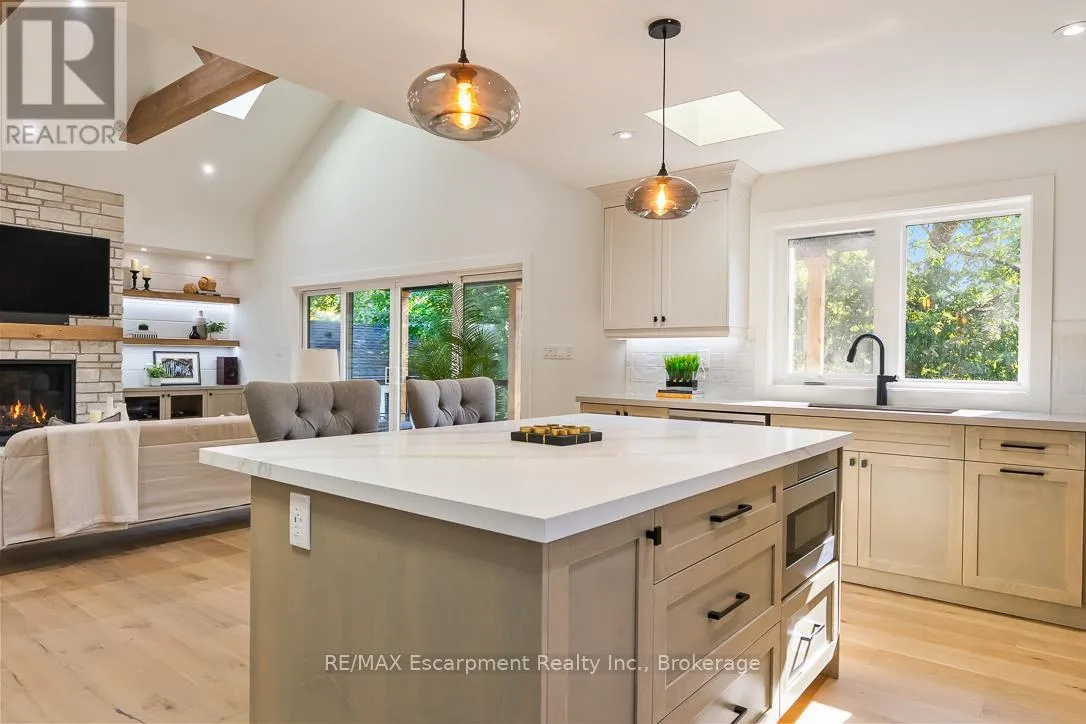 Cross Streets: New St and Guelph Line. ** Directions: New St, south on Stinson, east on Fairleigh. Stunning Brand-New Rebuild in Downtown Burlington. Originally built in 1952,Tucked away on a quiet cul-de-sac, this raised bungalow offers refined living at its best. Perfectly situated backing onto the picturesque Waterfront Trail, its just a short stroll to downtown Burlington, with its charming shops, restaurants, and the sparkling shores of Lake Ontario. Never been lived in, this home is ideal for downsizers or professionals seeking a luxurious, low-maintenance lifestyle where style and comfort abound. Step inside to discover a magnificent open-concept design, featuring engineered hardwood floors, pot lights, and integrated speakers throughout. The great room captivates with its cathedral, beam accented ceiling, skylights, and a stone-framed gas fireplace flanked by illuminated custom shelving and cabinetry. Sliding doors create a seamless transition to the covered porch, wired for sound and complete with glass railings overlooking a private backyard oasis. The professionally designed kitchen is a showpiece featuring Bosch appliances, sleek finishes, and a large island perfect for entertaining. Just off the great room, the main floor laundry is bright and functional, with ample cabinetry, heated floors, and direct access to the garage and backyard. The primary suite offers a serene retreat with a vaulted ceiling, numerous custom built-ins, and a spa-like ensuite boasting a soaker tub and heated floors. The lower level is equally impressive, with a spacious, light-filled family room featuring a walkout to the garden and custom built-ins for extra storage. Three generous bedrooms, each large enough for a king bed, share a beautiful 3-piece bath again with heated floors. Even the mechanical room has been finished with large-format tile for a polished touch. Outside, a detached garage comes EV charger ready, completing this exceptional offering. Every detail has been thoughtfully designed and flawlessly executed. This one-of-a-kind property is truly not to be missed (id:27476)