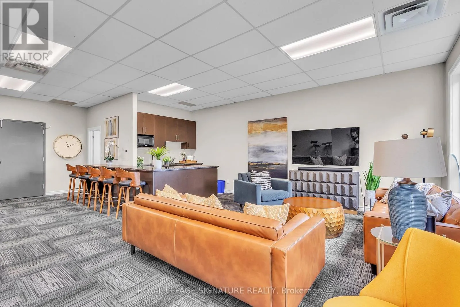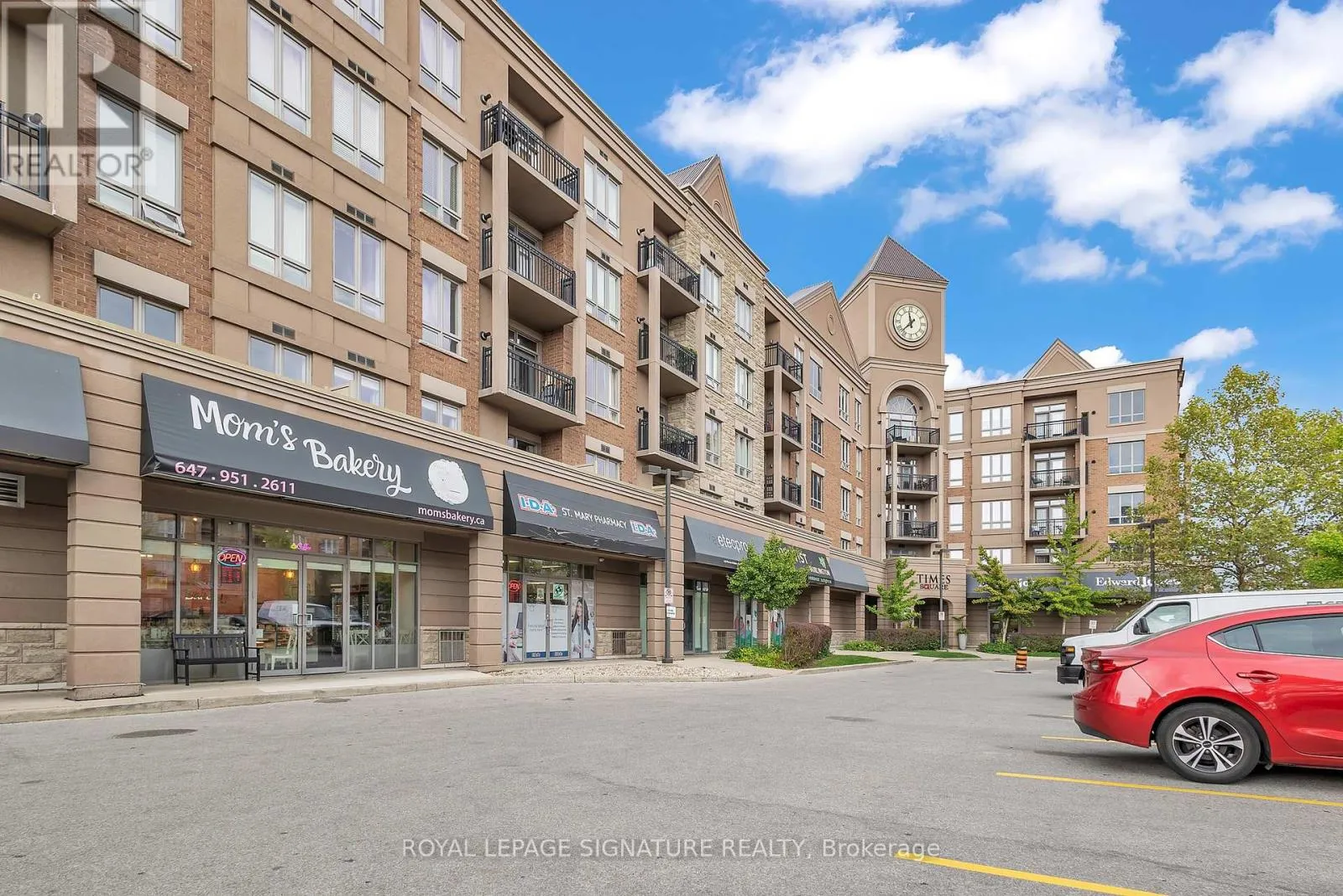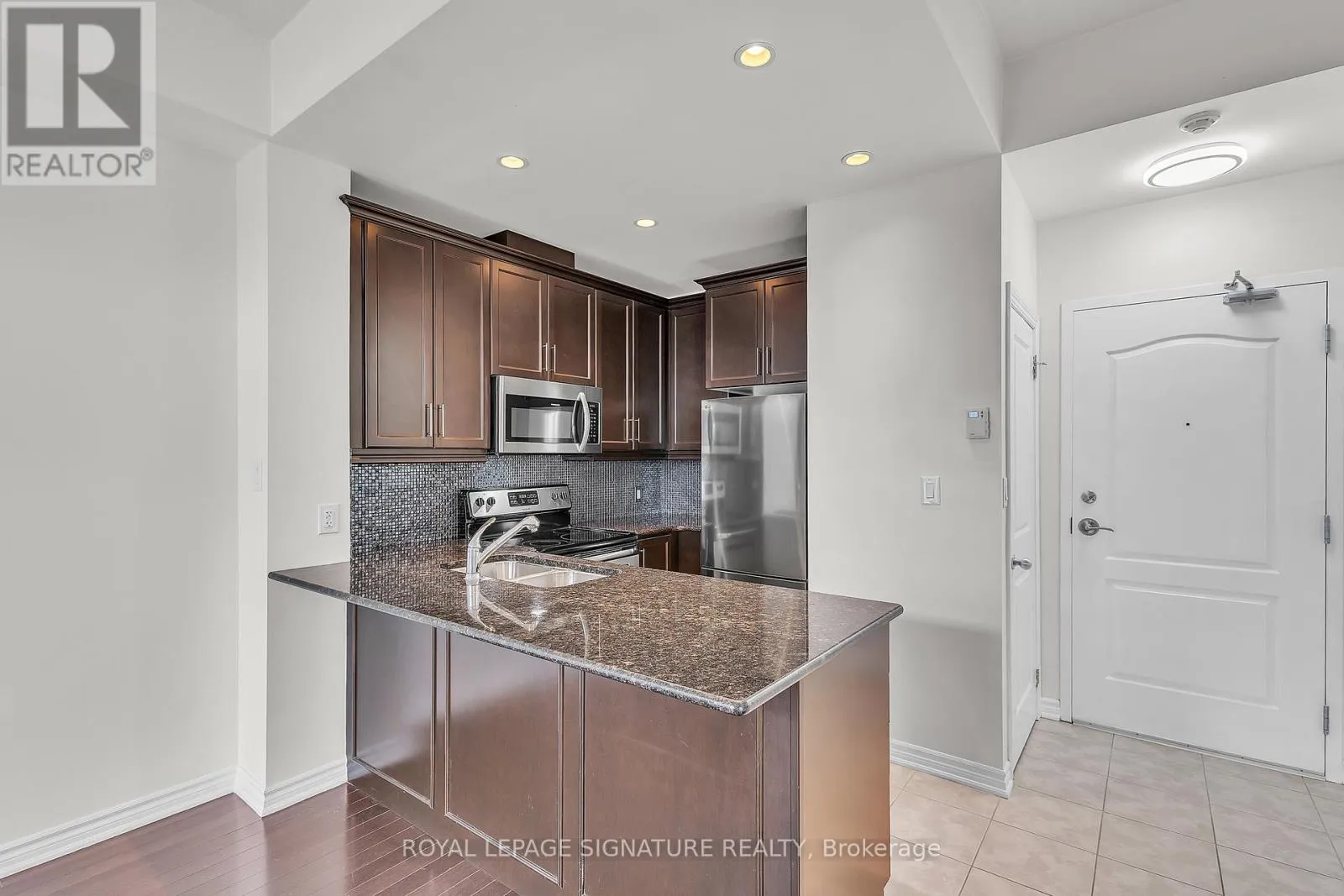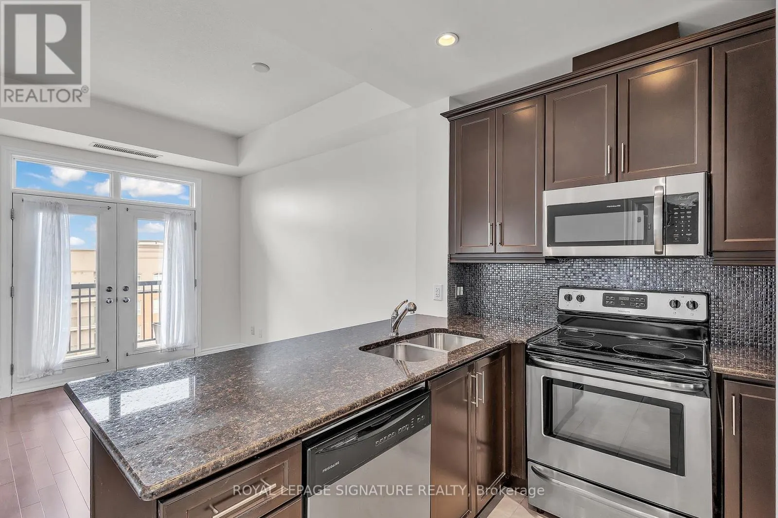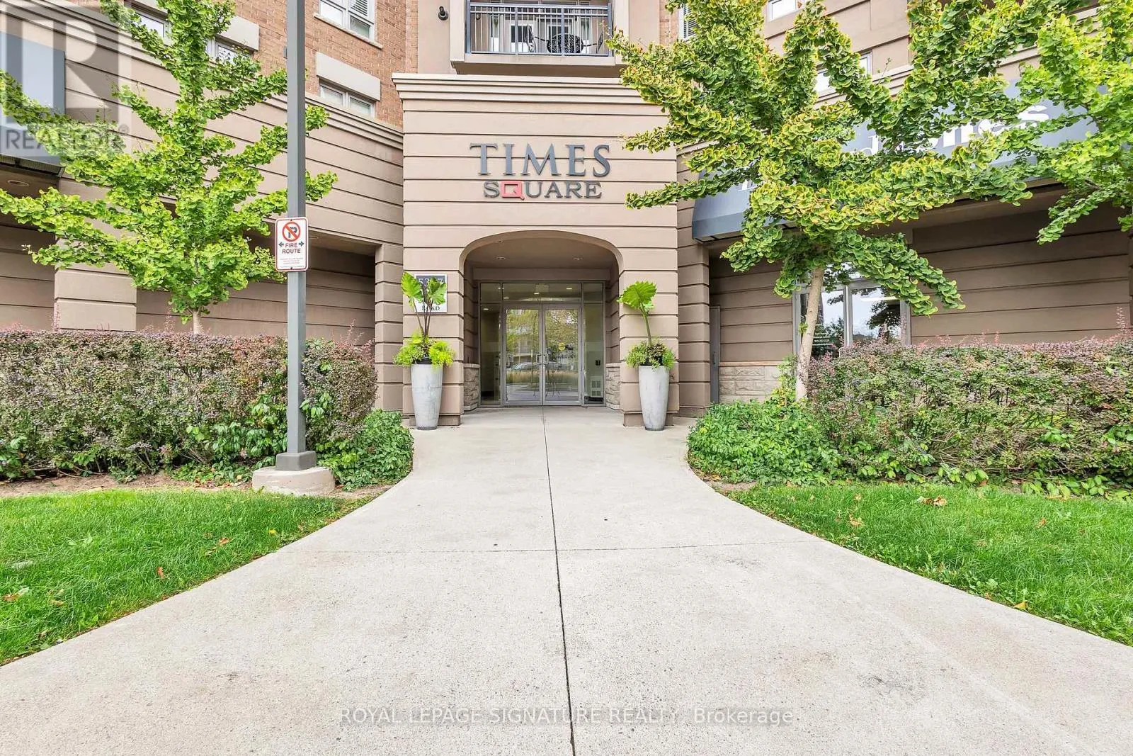 Sutton & Upper Middle Welcome to this stunning top-floor 1-bedroom, 1-bathroom condo in the highly sought-after Orchard community's Times Square Condos, offering 619 square feet of thoughtfully designed living space with soaring 10-foot ceilings. The bright, open-concept main living area features beautiful hardwood flooring and seamless flow between living, kitchen, and dining spaces. Directly off the living room, French doors with upgraded pet-friendly mesh screening lead to your spacious 44-square-foot balcony. The gorgeous kitchen showcases extended-height dark wood cabinetry, sleek granite countertops, ceramic tile flooring, stainless steel appliances, including a new bottom-freezer fridge, potlights, and a double sink with a sprayer feature. The generously sized bedroom features plush carpet, a large walk-in closet with custom shelving, a ceiling fan with light, and direct access to your spacious ensuite bathroom with ceramic tiles, upgraded lighting, a luxurious dual-head shower system, and a convenient full-size front-load washer and dryer. This unit includes prime parking in P1 beside the elevator, plus a large storage locker. Located minutes from the QEW, top-rated schools, shopping, and Bronte Creek Provincial Park. Don't miss this opportunity book your private showing today! (id:27476)