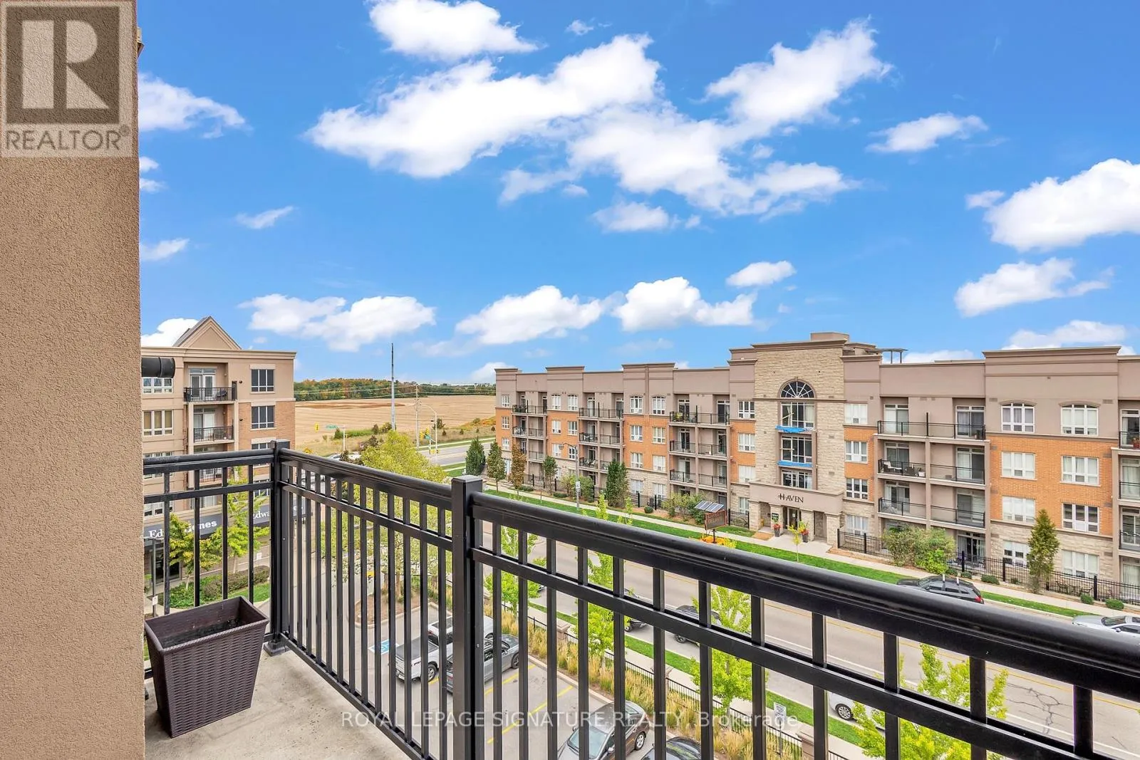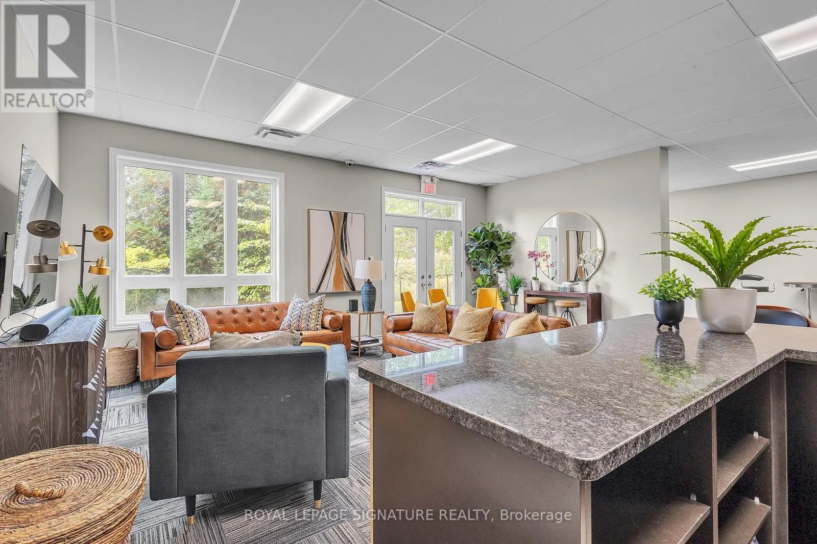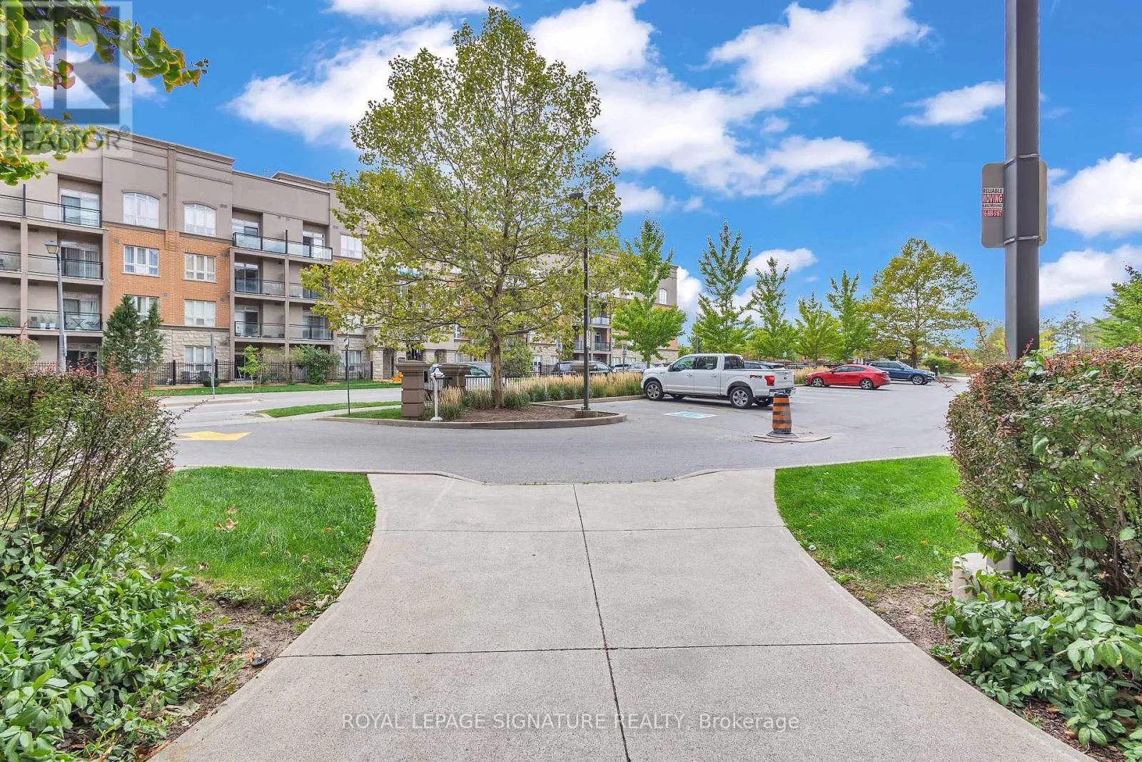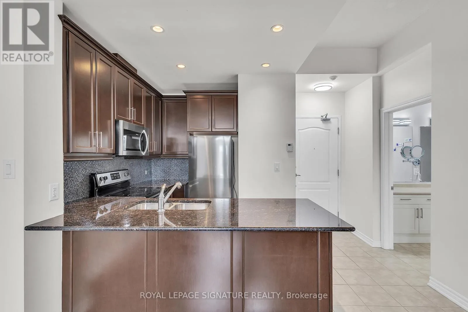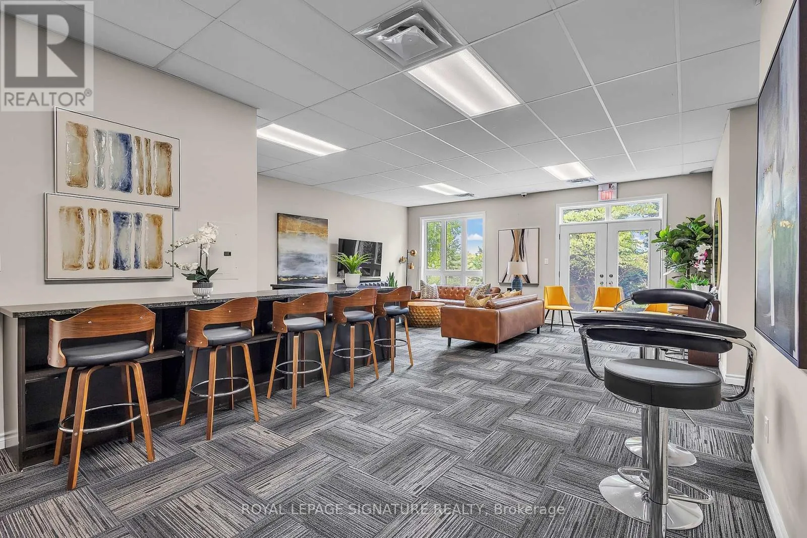 Sutton & Upper Middle Welcome to this stunning top-floor 1-bedroom, 1-bathroom condo in the highly sought-after Orchard community's Times Square Condos, offering 619 square feet of thoughtfully designed living space with soaring 10-foot ceilings. The bright, open-concept main living area features beautiful hardwood flooring and seamless flow between living, kitchen, and dining spaces. Directly off the living room, French doors with upgraded pet-friendly mesh screening lead to your spacious 44-square-foot balcony. The gorgeous kitchen showcases extended-height dark wood cabinetry, sleek granite countertops, ceramic tile flooring, stainless steel appliances, including a new bottom-freezer fridge, potlights, and a double sink with a sprayer feature. The generously sized bedroom features plush carpet, a large walk-in closet with custom shelving, a ceiling fan with light, and direct access to your spacious ensuite bathroom with ceramic tiles, upgraded lighting, a luxurious dual-head shower system, and a convenient full-size front-load washer and dryer. This unit includes prime parking in P1 beside the elevator, plus a large storage locker. Located minutes from the QEW, top-rated schools, shopping, and Bronte Creek Provincial Park. Don't miss this opportunity book your private showing today! (id:27476)