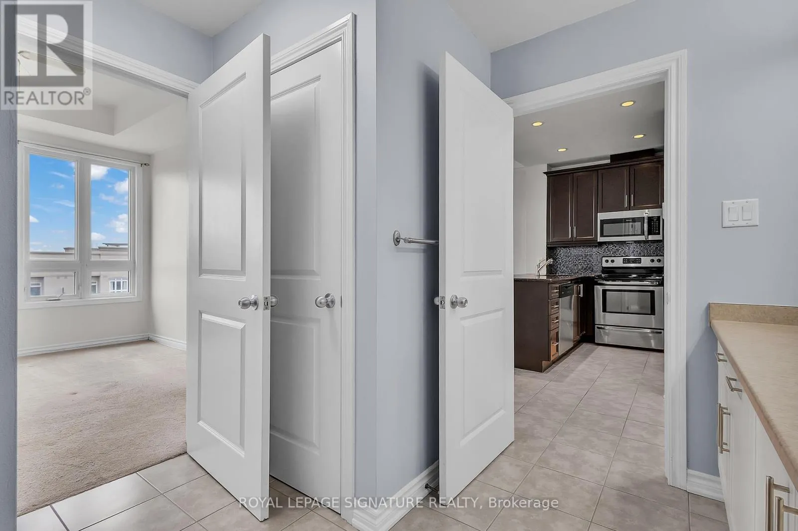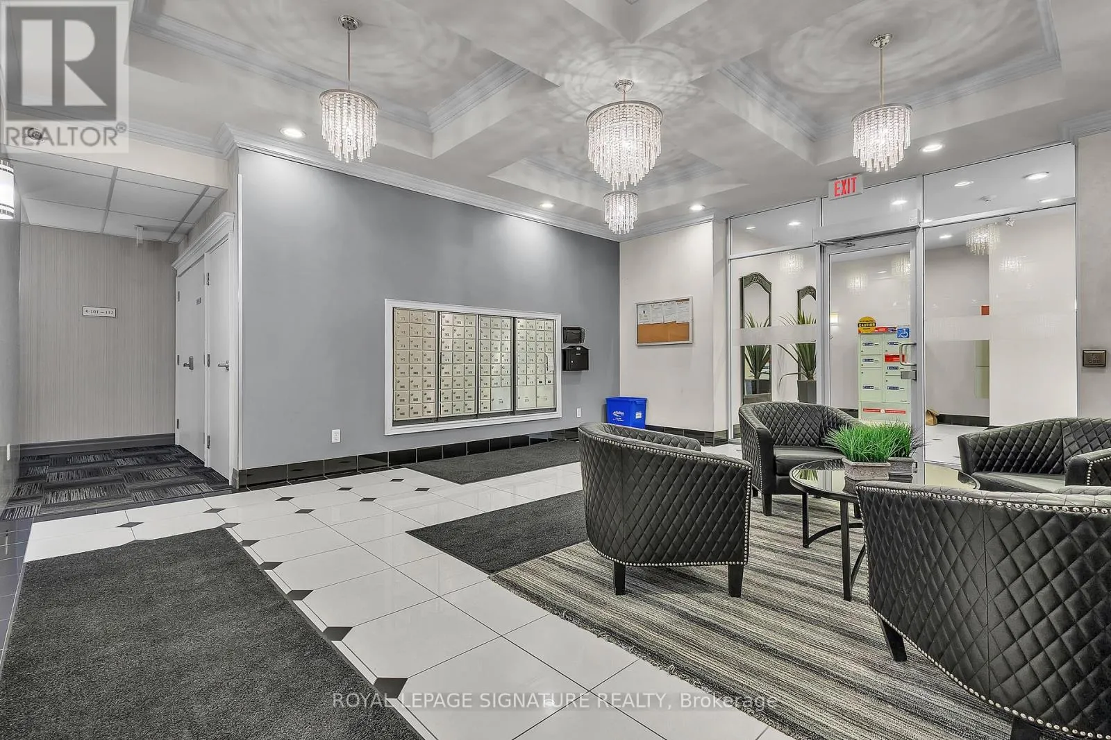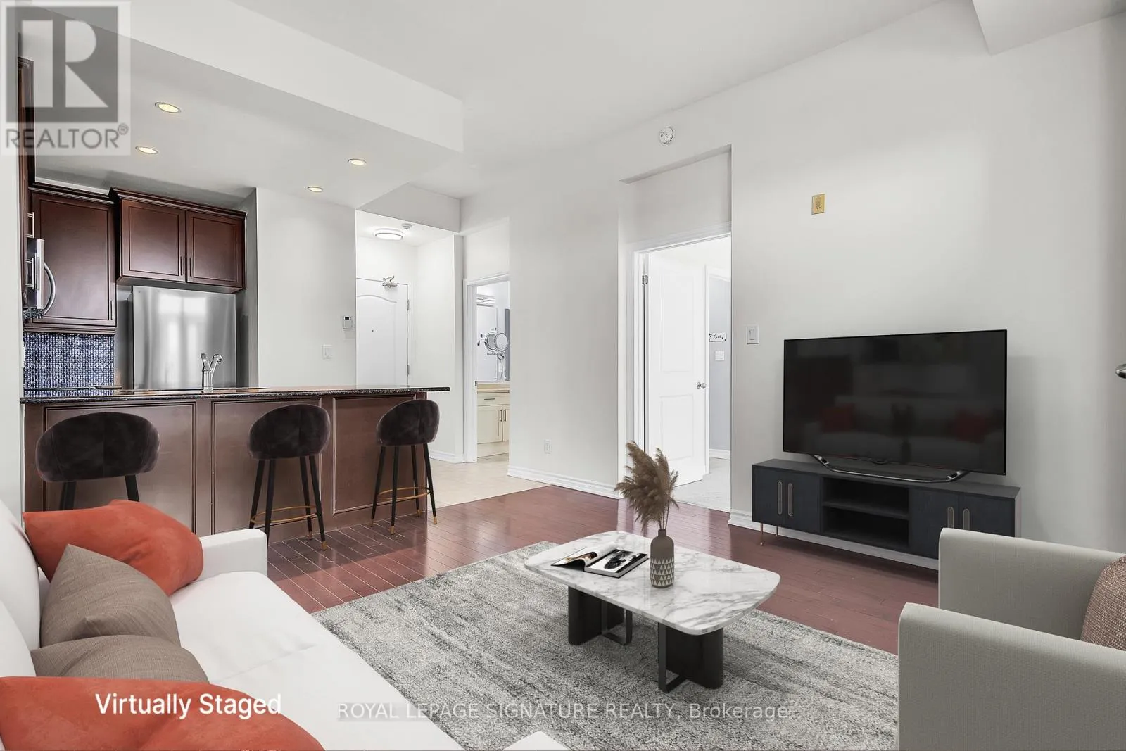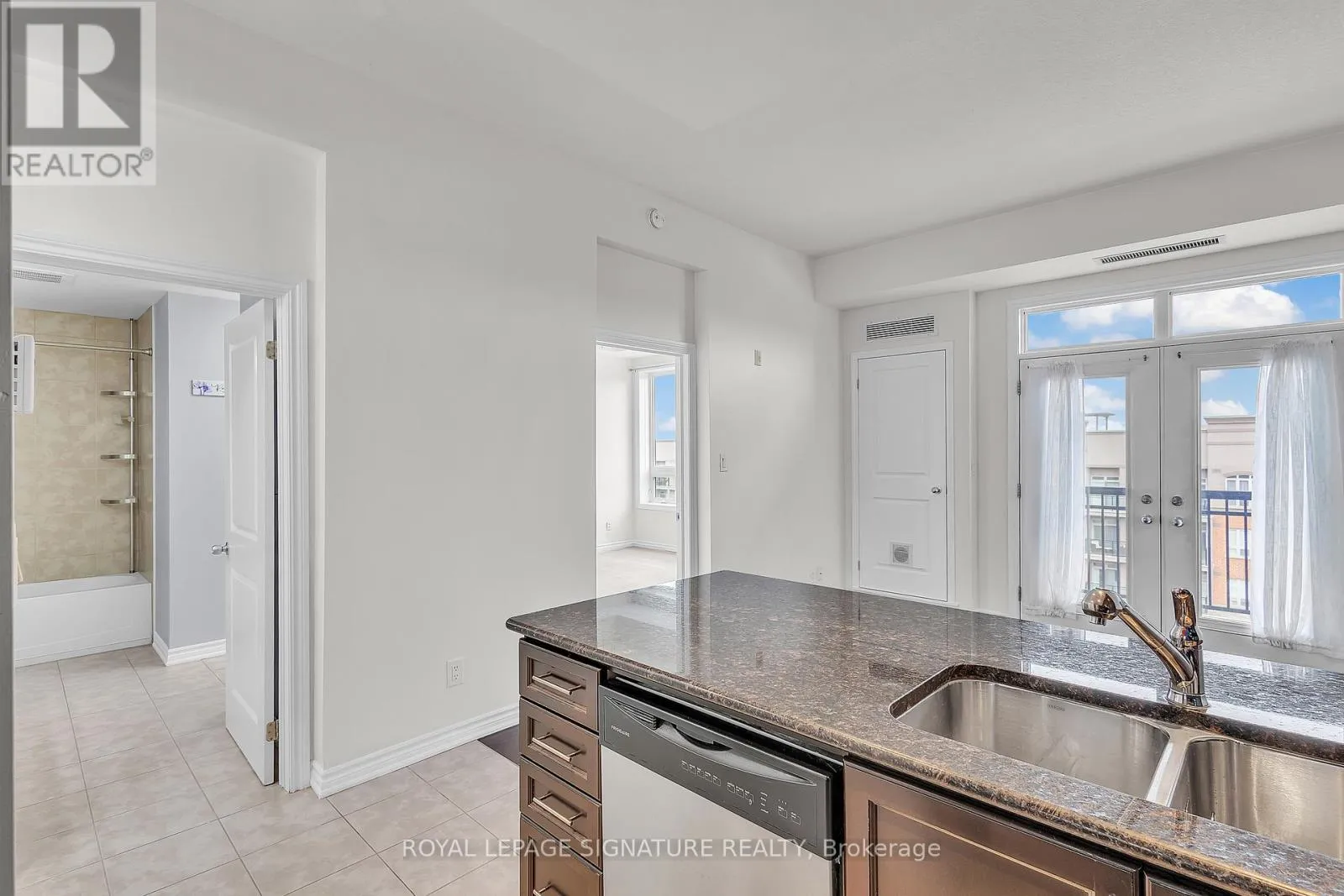 Sutton & Upper Middle Welcome to this stunning top-floor 1-bedroom, 1-bathroom condo in the highly sought-after Orchard community's Times Square Condos, offering 619 square feet of thoughtfully designed living space with soaring 10-foot ceilings. The bright, open-concept main living area features beautiful hardwood flooring and seamless flow between living, kitchen, and dining spaces. Directly off the living room, French doors with upgraded pet-friendly mesh screening lead to your spacious 44-square-foot balcony. The gorgeous kitchen showcases extended-height dark wood cabinetry, sleek granite countertops, ceramic tile flooring, stainless steel appliances, including a new bottom-freezer fridge, potlights, and a double sink with a sprayer feature. The generously sized bedroom features plush carpet, a large walk-in closet with custom shelving, a ceiling fan with light, and direct access to your spacious ensuite bathroom with ceramic tiles, upgraded lighting, a luxurious dual-head shower system, and a convenient full-size front-load washer and dryer. This unit includes prime parking in P1 beside the elevator, plus a large storage locker. Located minutes from the QEW, top-rated schools, shopping, and Bronte Creek Provincial Park. Don't miss this opportunity book your private showing today! (id:27476)