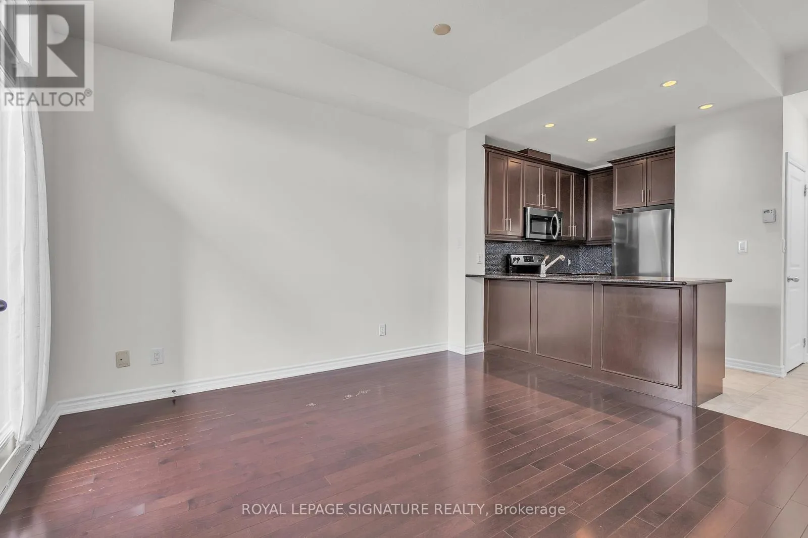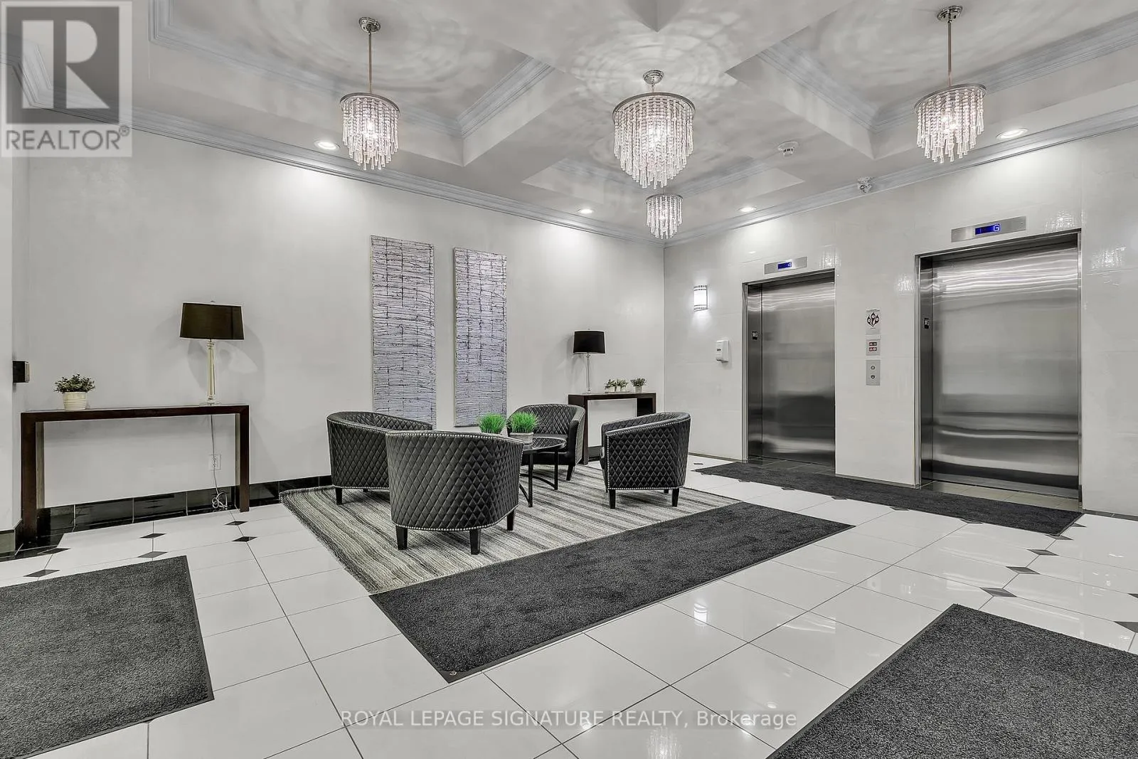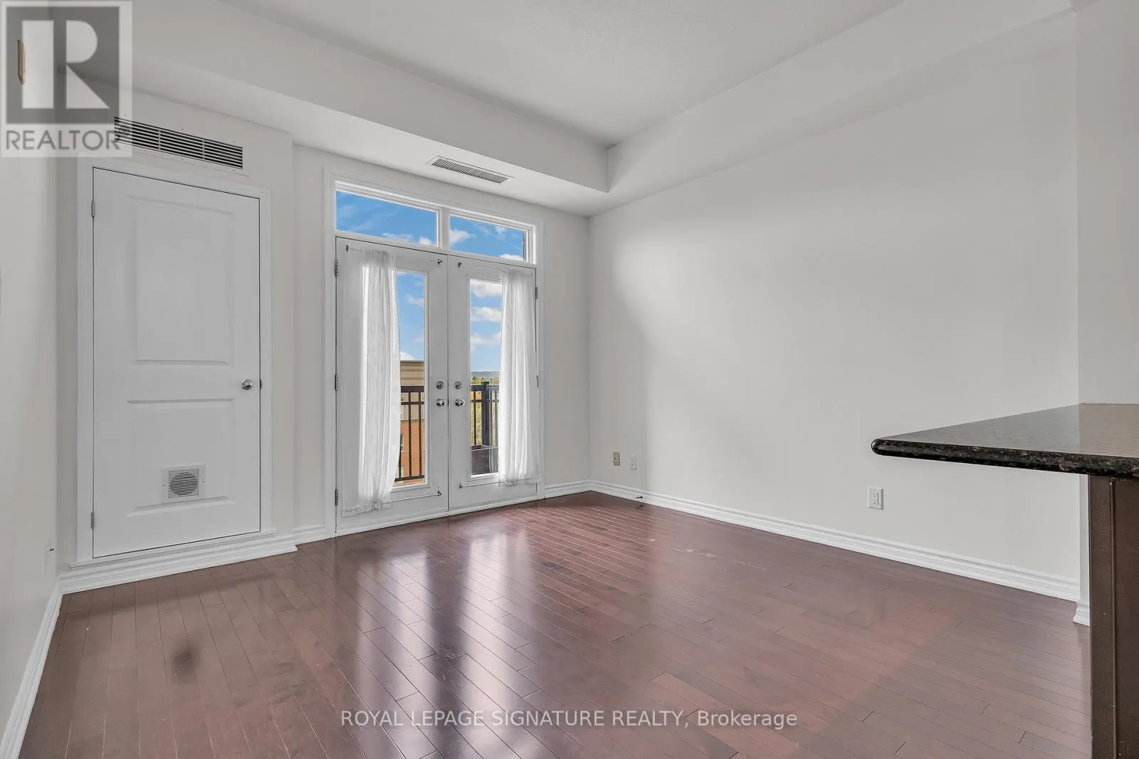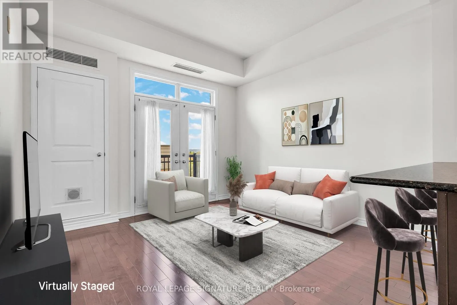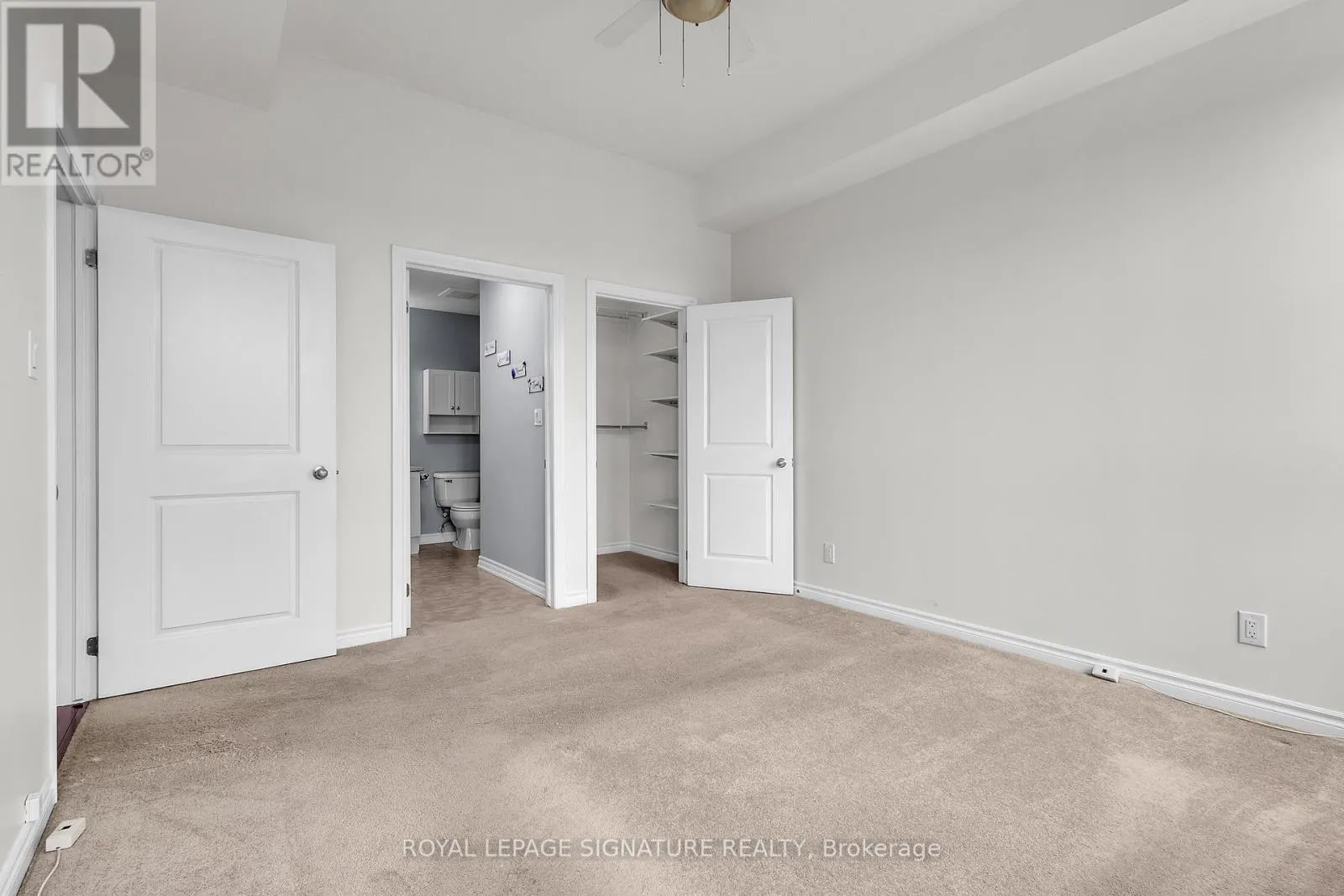 Sutton & Upper Middle Welcome to this stunning top-floor 1-bedroom, 1-bathroom condo in the highly sought-after Orchard community's Times Square Condos, offering 619 square feet of thoughtfully designed living space with soaring 10-foot ceilings. The bright, open-concept main living area features beautiful hardwood flooring and seamless flow between living, kitchen, and dining spaces. Directly off the living room, French doors with upgraded pet-friendly mesh screening lead to your spacious 44-square-foot balcony. The gorgeous kitchen showcases extended-height dark wood cabinetry, sleek granite countertops, ceramic tile flooring, stainless steel appliances, including a new bottom-freezer fridge, potlights, and a double sink with a sprayer feature. The generously sized bedroom features plush carpet, a large walk-in closet with custom shelving, a ceiling fan with light, and direct access to your spacious ensuite bathroom with ceramic tiles, upgraded lighting, a luxurious dual-head shower system, and a convenient full-size front-load washer and dryer. This unit includes prime parking in P1 beside the elevator, plus a large storage locker. Located minutes from the QEW, top-rated schools, shopping, and Bronte Creek Provincial Park. Don't miss this opportunity book your private showing today! (id:27476)