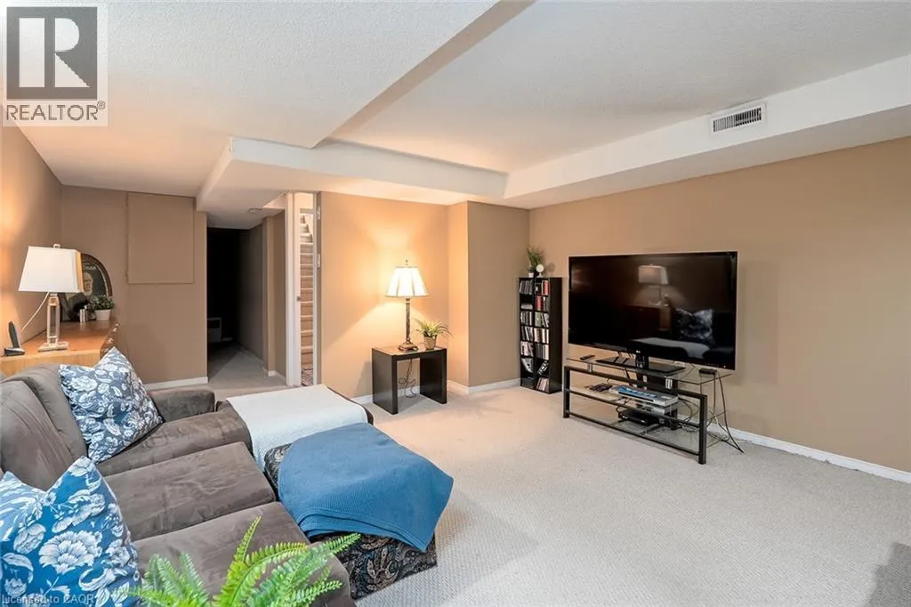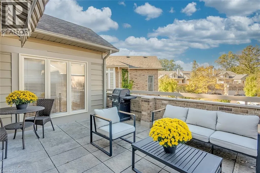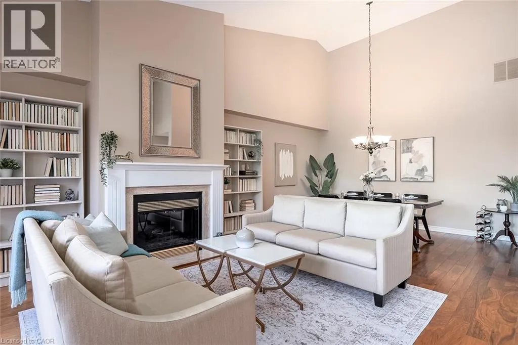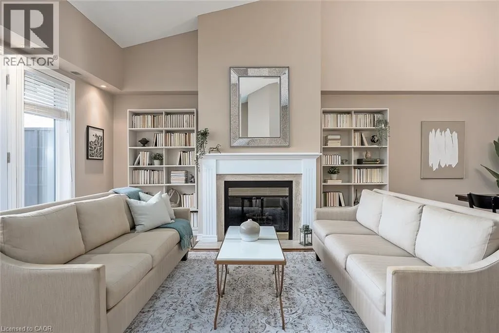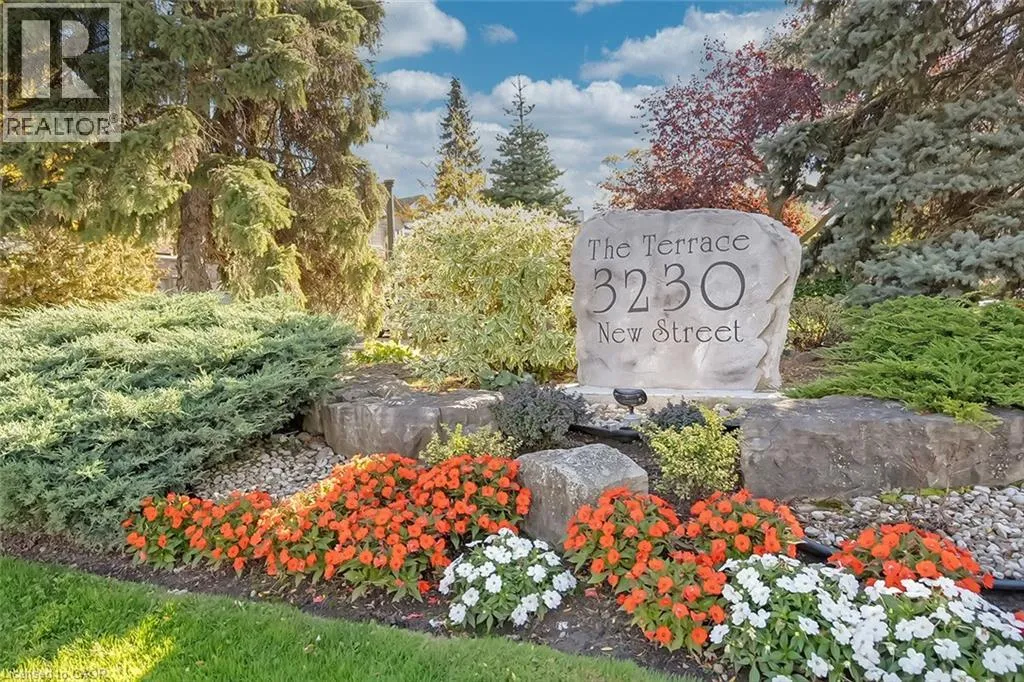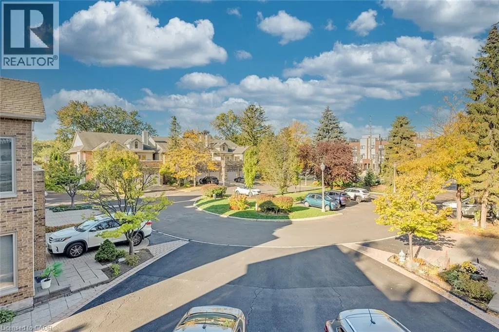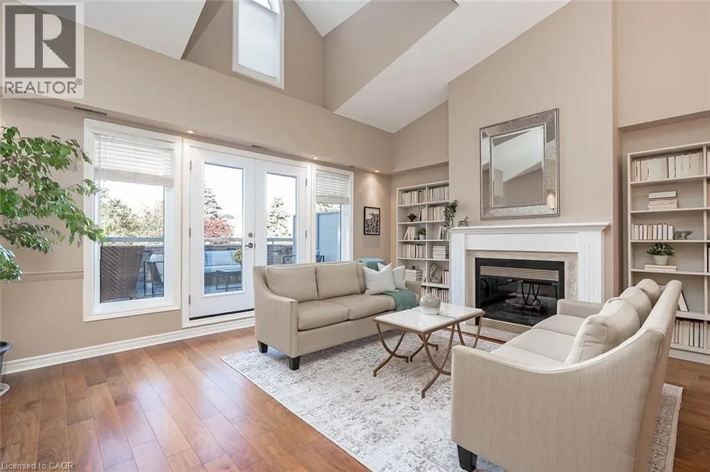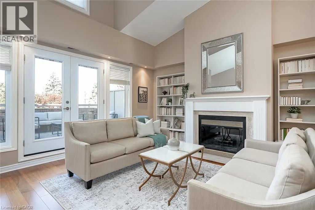 Lakeshore Road to Pine Cove Road to New Street Welcome to The Terraces, an exclusive enclave in South Burlingtonâs desirable Roseland neighbourhood. This rarely available, light-filled end-unit townhome offers 1,656 sq. ft. above grade with 2 bedrooms, 2 bathrooms, and a thoughtfully designed open-concept layout that combines comfort and sophistication. The expansive living and dining area showcases vaulted ceilings, gleaming walnut floors, and a gas fireplace, creating a warm and inviting atmosphere. French doors open to a private terrace with an awning, perfect for morning coffee or evening relaxation. The bright kitchen provides generous counter and storage space, while the main floor primary suite features a 4-piece ensuite and his-and-hers closets. A second bedroom with a walk-in closet offers ensuite privileges to the 3-piece main bath. Convenient main floor laundry adds to the ease of one-level living. The fully finished basement extends your space with a recreation room, den, and rough-in for an additional bathroom. Enjoy inside entry from the attached garage plus ample visitor parking. Maintenance is effortless â snow removal for the driveway and steps, landscaping, and all exterior upkeep are fully managed, allowing you to enjoy a carefree, lock-and-leave lifestyle. Ideal for snowbirds or those seeking a low-maintenance home without compromise. Perfectly situated near downtown Burlington, the waterfront, parks and trails, shopping, and highway access, this immaculate home offers the best in comfort, convenience, and community. (id:27476)
