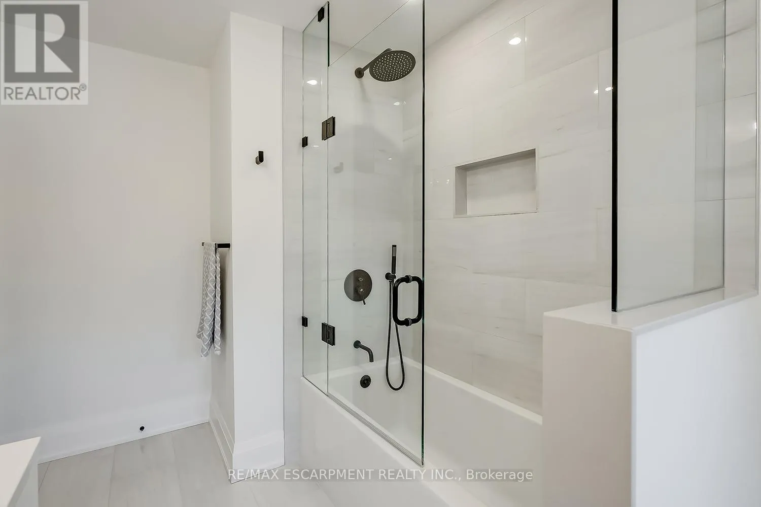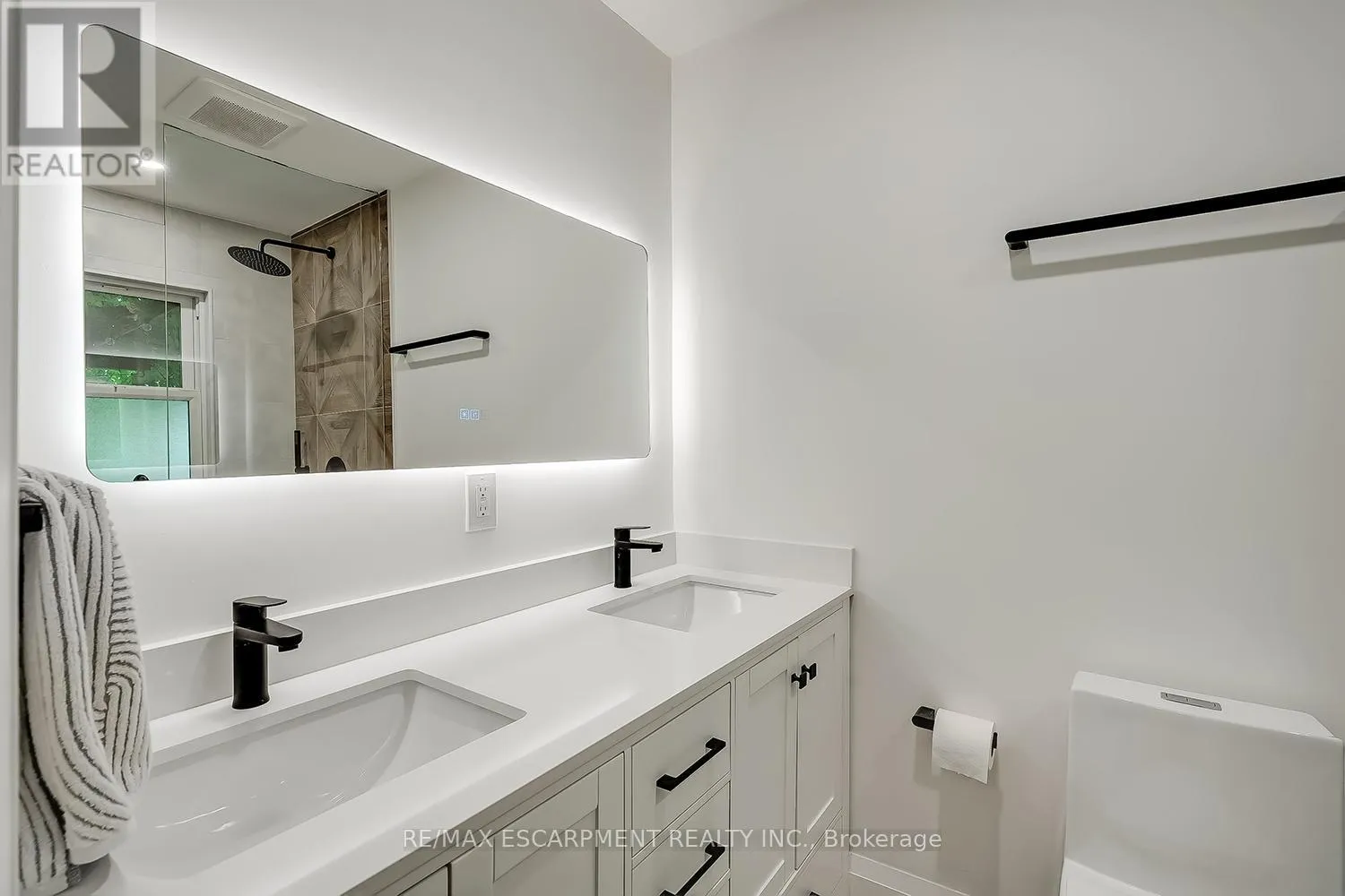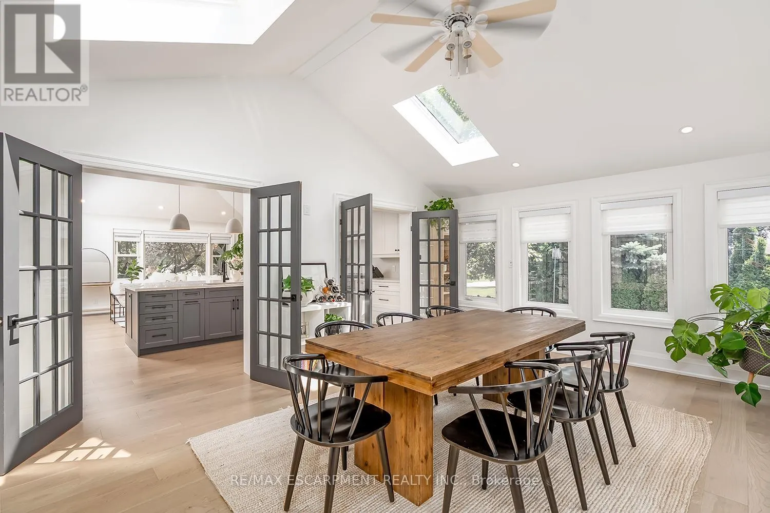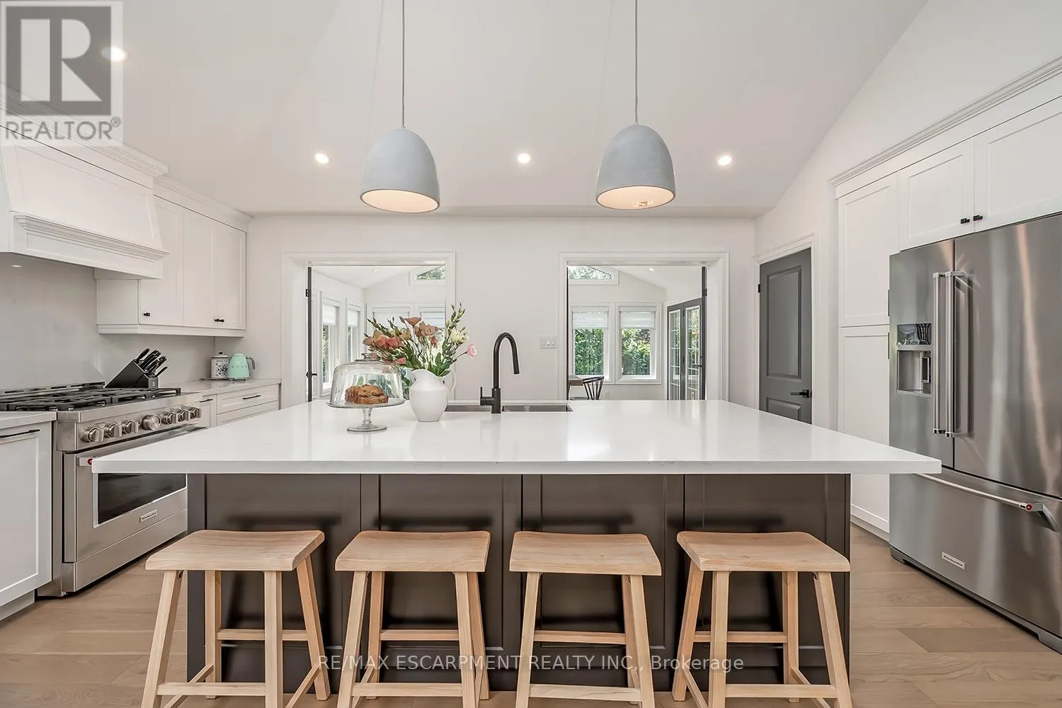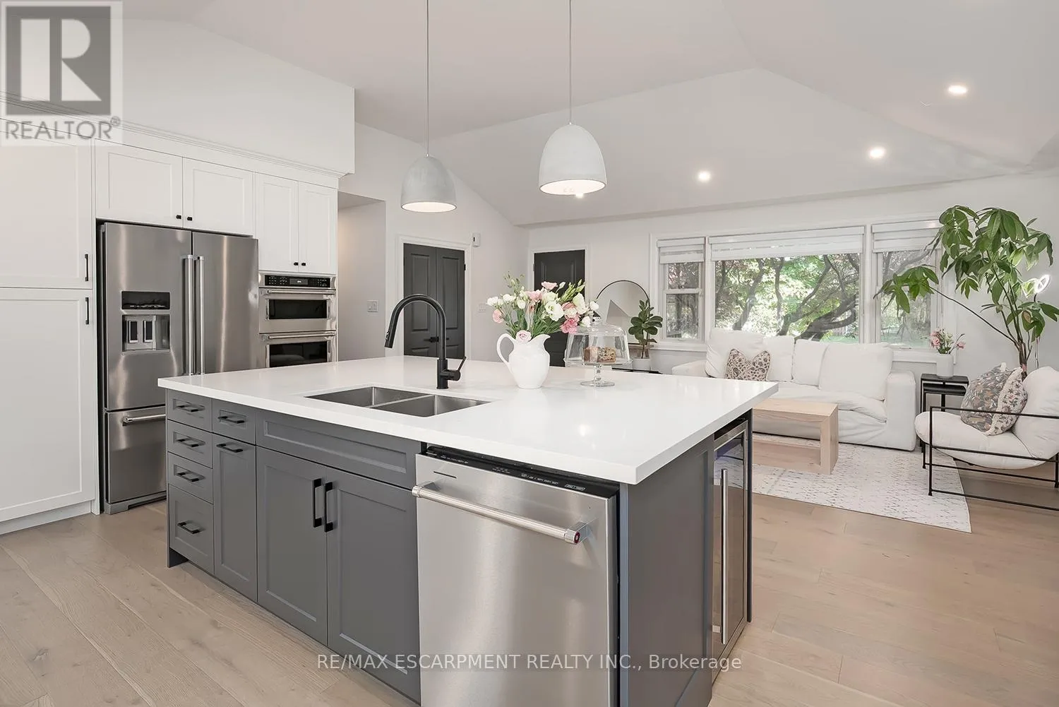 Dynes Rd to Oakhurst Rd. East to Maplehill Dr. This incredible BUNGALOW in south Burlington has been extensively renovated and is move-in ready. Boasting top quality finishes and situatedon a private lot, this home features 2+2 bedrooms, 3 full bathrooms and a double car garage! This home is located on a quiet street and isperfect for young families or empty nesters/retirees alike. Featuring a stunning open-concept floor plan, the main floor has smooth vaultedceilings with pot lights and wide plank engineered hardwood flooring throughout. The amazing kitchen / dining room combination has 10.5-footvaulted ceilings. The eat-in kitchen is wide open to the living room and features airy white custom cabinetry, a large accent island, quartzcounters, gourmet stainless steel appliances and access to the large family room addition- with 11- foot vaulted ceilings and plenty of naturallight. There are also 2 bedrooms, 2 fully renovated bathrooms and main floor laundry! The primary bedroom has a 4-piece ensuite with dualvanities, a walk-in shower and heated flooring. The finished lower level includes a large rec room, 3-piece bathroom with heated flooring, abedroom, 2nd smaller bedroom, den and plenty of storage space! The exterior of the home has a private back / side yard with plenty ofpotential. There is a stone patio, pergola, large double car garage and a double driveway with parking for 6 cars! Situated in a quietneighbourhood and close to all amenities- this home is completely move-in ready! (id:27476)