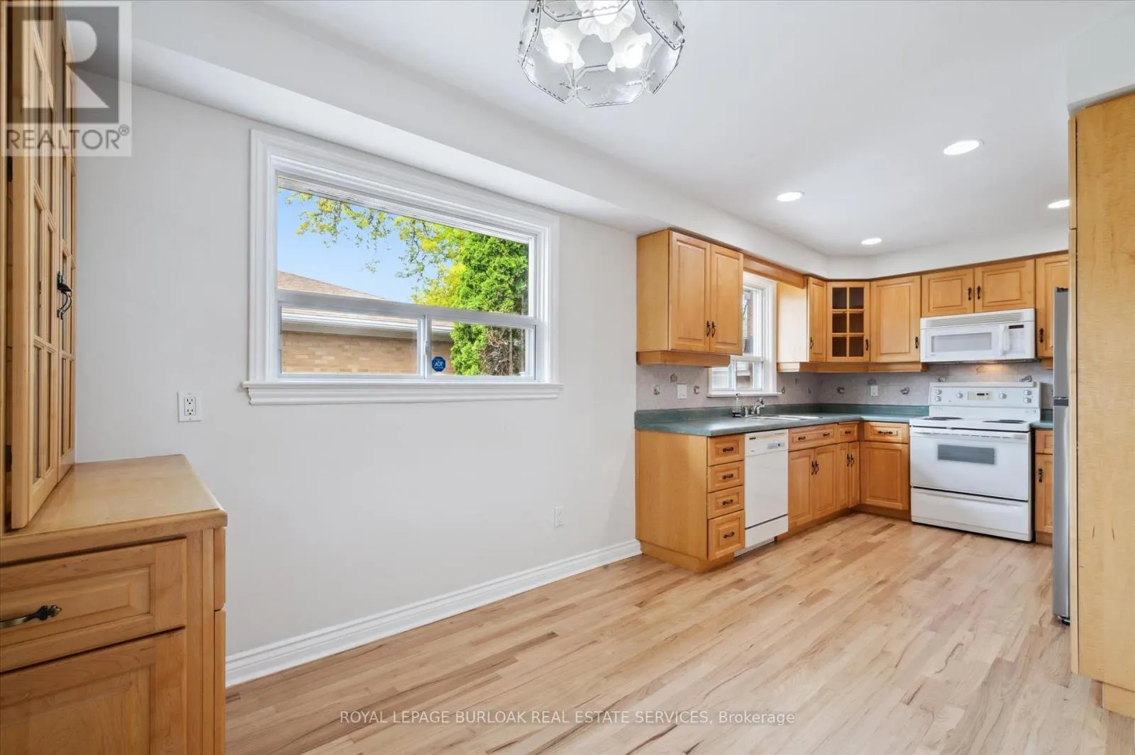 Prospect/Joyce Welcome to 2237 Joyce Street located in a family-friendly quiet neighbourhood. Tremendous value in this bungalow with central core location close to schools, downtown, the Go Station and major highways. The front entrance welcomes you with freshly painted interior and beautifully refinished hardwood floors. The spacious Living Room is flooded with light from oversized windows. The adjoining Kitchen features a separate Dining area perfect for family gatherings. Maple cabinetry and a custom-built-in hutch offer a multitude of storage space. Three spacious Bedrooms are located on the main floor, with one bedroom featuring patio doors overlooking the backyard. The main floor 4 piece bathroom has been recently updated. The separate side entrance leads to the lower level, which has been recently updated with vinyl plank flooring and pot-lights. The family room includes a kitchen area, with gas line for a stove and a connection for a fan hookup. A spacious bedroom includes double closets, and a 4-piece bathroom is just down the hall. This layout offers the potential for an in-law suite, teen hangout, or take a look at financing incentives offered by the City of Burlington to create an Additional Dwelling Unit. The private yard backs onto a field and provides a quiet private space for children to play or adults to relax. The spacious lot includes an oversized driveway with plenty of parking options and a single garage. Quick closing is available to make this your new home, ready to move in! (id:27476)