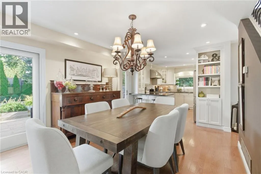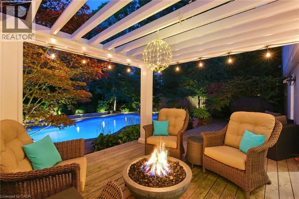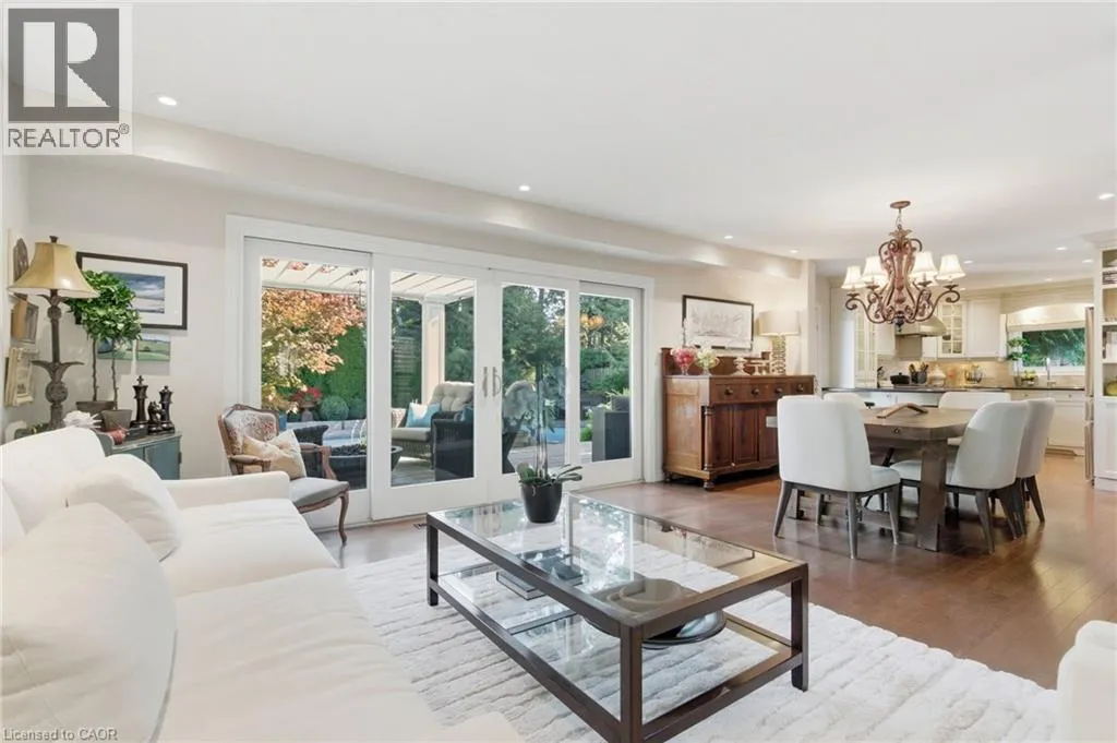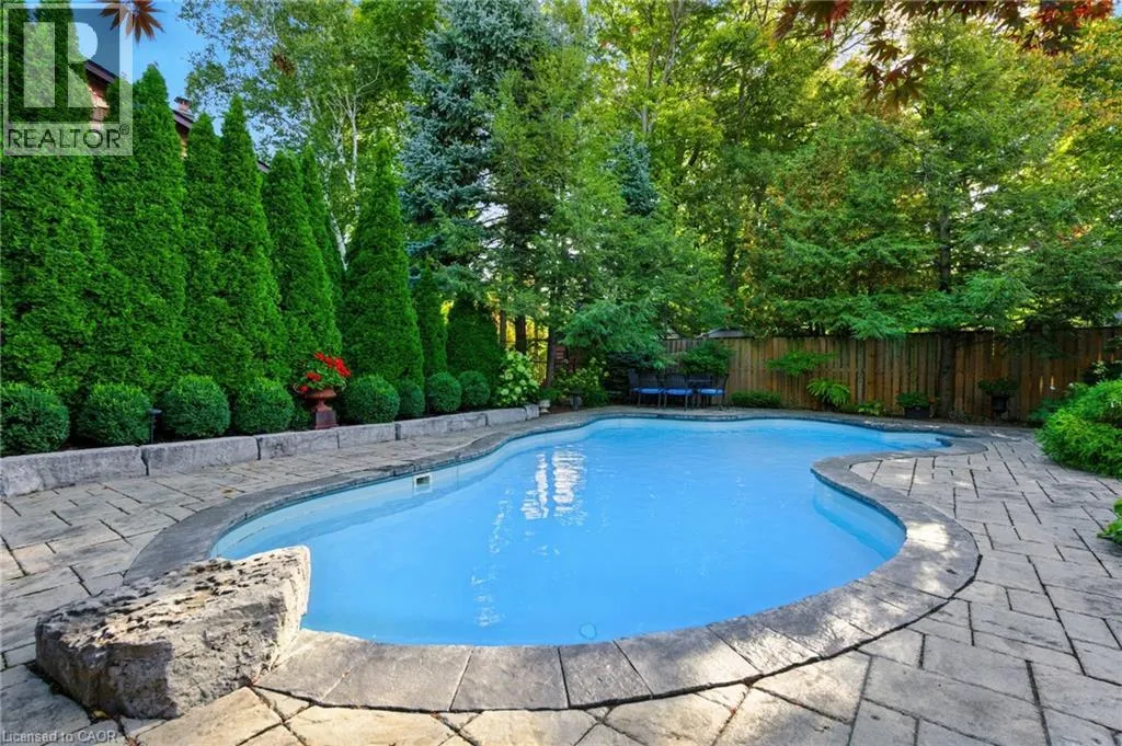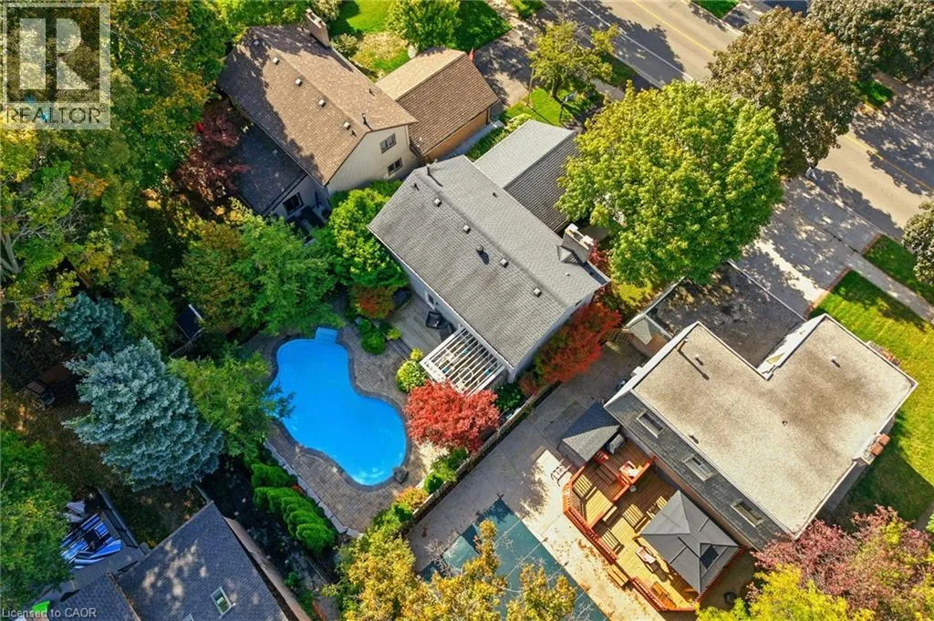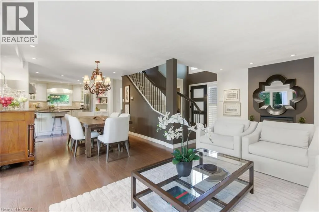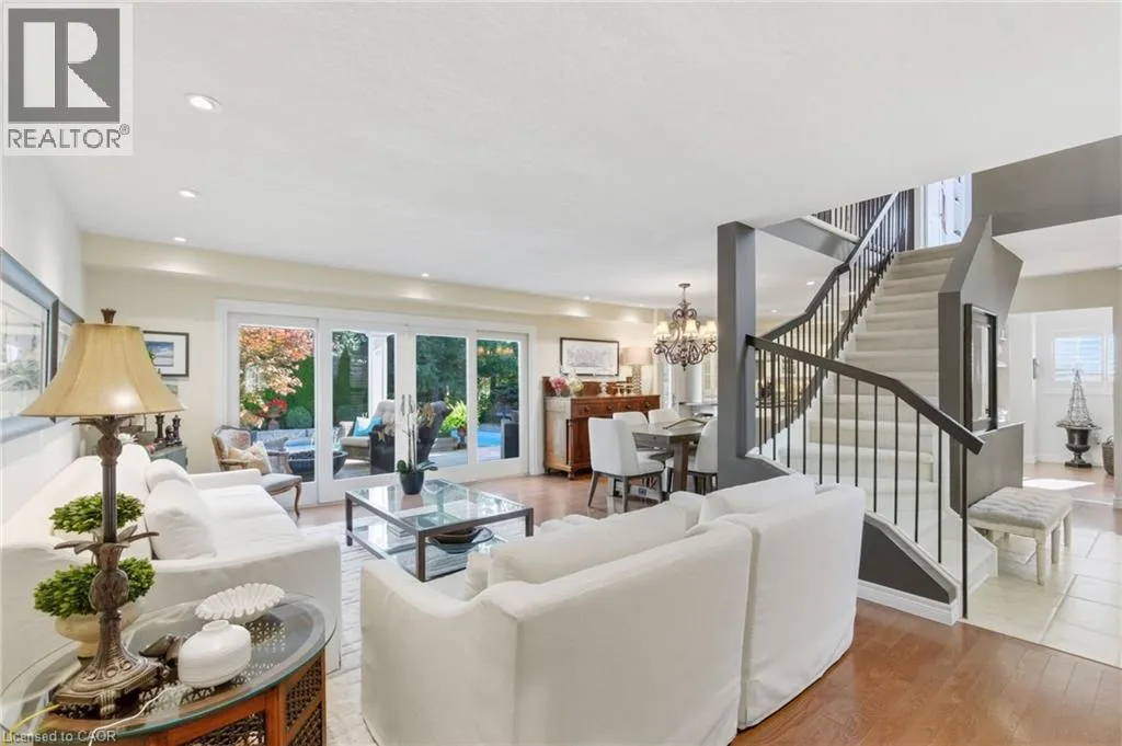 Upper Middle Rd to Cavendish Dr, by Ingersoll Dr Welcome to this beautifully renovated home in one of Burlingtonâs most established and family-friendly neighbourhoods! Ideally located near parks, shopping, and quick highway access, this stunning 2-storey residence has been thoughtfully redesigned with quality finishes and attention to detail. The open-concept main floor showcases a modern kitchen with gas cooktop, double wall oven, large windows, and island seating that flows seamlessly into the dining and living rooms, perfect for everyday living and entertaining. A versatile bonus room on the main level, currently a TV lounge, could serve as a home office, playroom, or even a main-floor bedroom. Upstairs, brand-new carpeting leads to four spacious bedrooms. The primary retreat offers two closets (one walk-in) and a beautifully updated 4-piece ensuite, while the updated main bath features a large glass shower. The fully finished lower level includes new carpeting, a games area with pool table, and a cozy rec room for movie or sports nights. Step outside to your private backyard paradise! The heated inground pool is surrounded by mature trees, lush gardens, and professional landscaping for complete privacy. An expansive deck offers multiple seating areas, a covered lounge with gas fire feature, gas BBQ hookup, and ambient lighting, perfect for day or night enjoyment. This exceptional property combines comfort, style, and outdoor luxury in the heart of Brant Hills. (id:27476)