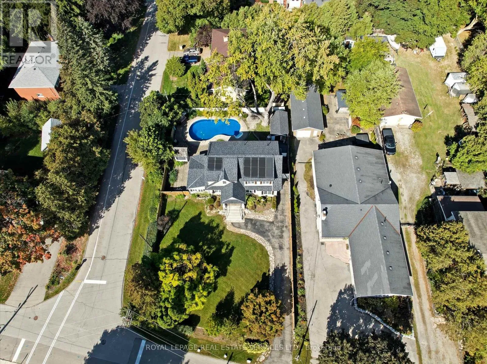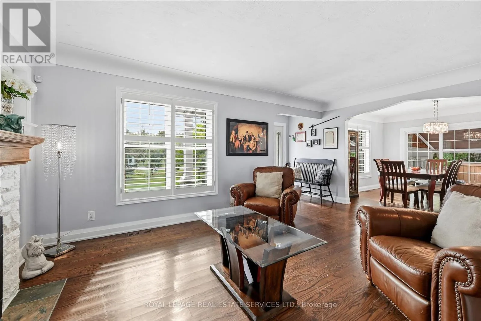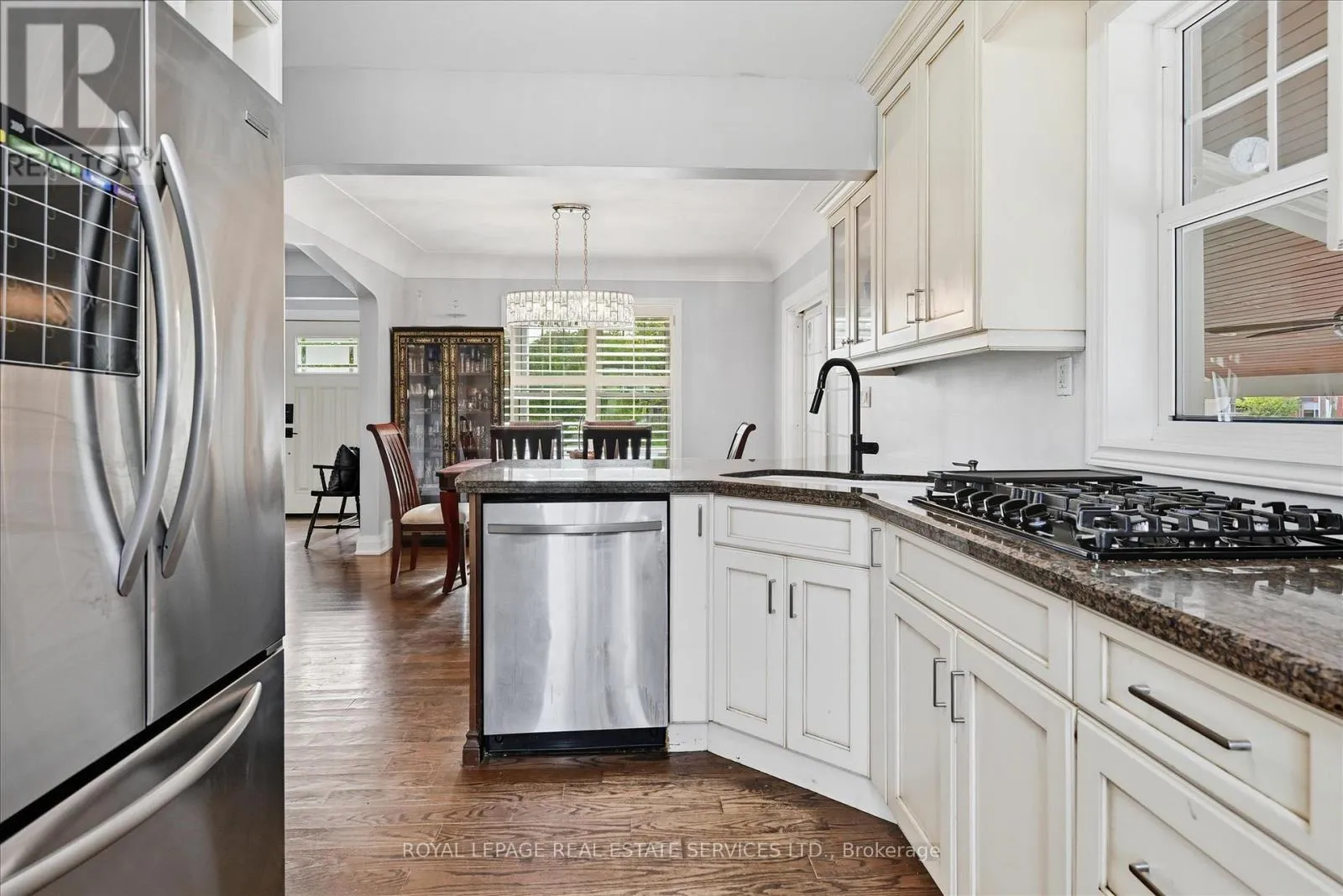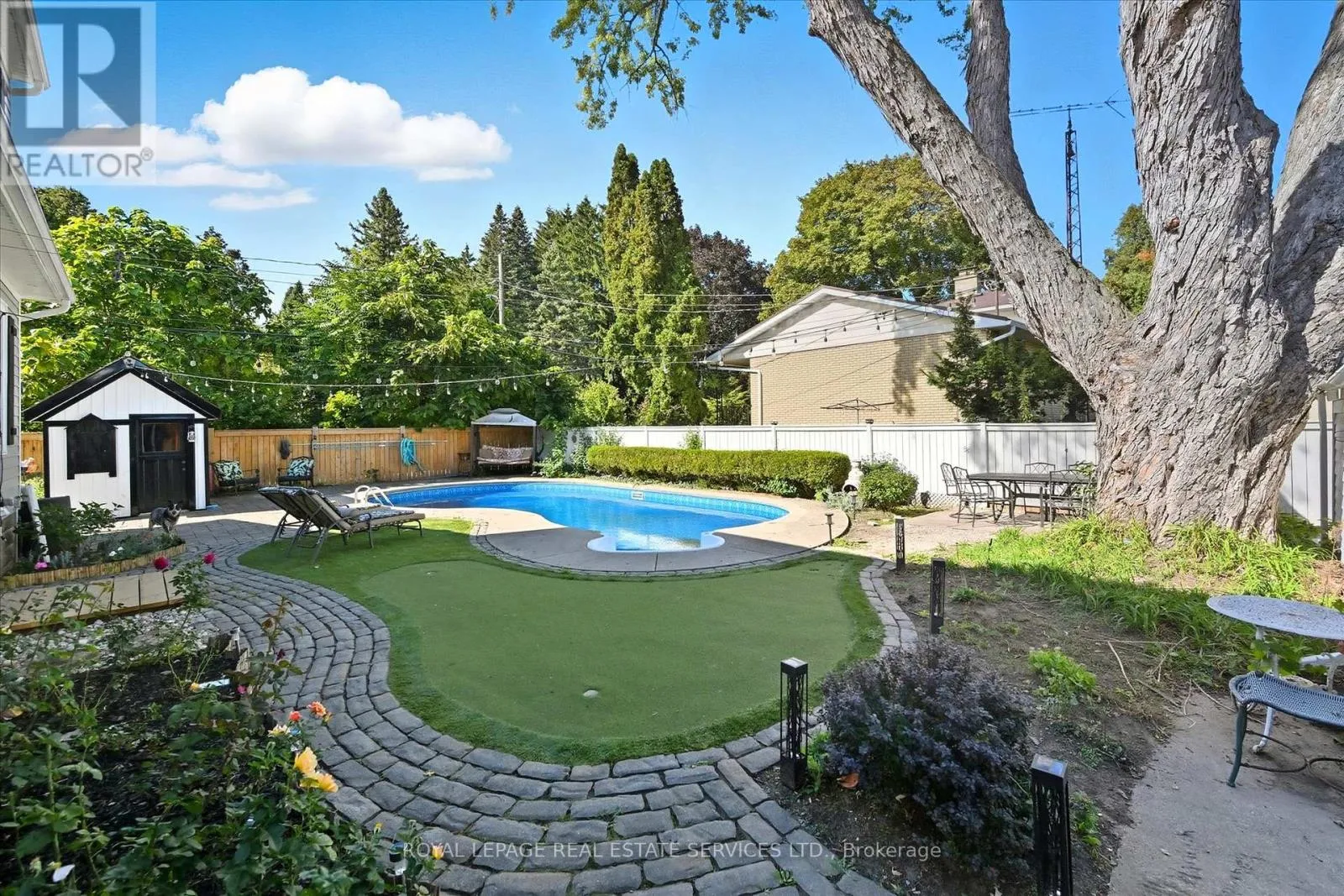 Cross Streets: North Shore Boulevard East and King Road. ** Directions: North Shore Boulevard East / King Road / Greenwood Drive. Rebuilt in 2016, this Craftsman-inspired residence blends timeless character with modern sophistication on an extra-wide 75' x 140' lot (0.229 acres) surrounded by mature trees. The exterior features Hardie Board concrete siding with stone accents, while the interior showcases arched entryways, transom windows, and rich hardwood flooring that create a light-filled, seamless flow. The open concept main level is ideal for family living and entertaining. The living room with an electric fireplace and warm finishes leads to the dining area, which opens to a covered portico with pot lights, ceiling fan, and tongue-and-groove wood ceiling. The family room is bright and inviting, highlighted by a large picture window overlooking the backyard oasis. The kitchen impresses with granite countertops, gas cooktop, KitchenAid wall oven and microwave, and stainless steel appliances. A main floor office/bedroom with a painted brick accent wall provides the perfect work-from-home retreat, while the modern heritage two-piece bath adds vintage charm. Upstairs, vaulted ceilings and transom windows enhance the sense of space and light. The primary bedroom boasts a dramatic lofted ceiling, walk-in closet with built-ins, and hardwood floor. The loft-style bedroom features a ladder, exposed beam, and desk area, while the junior primary offers a metallic accent wall, chandelier, walk-in closet, and three-piece ensuite with body-jet shower and heated floor. The main bath includes a freestanding tub, quartz vanity, and heated floor. The finished lower level adds a three-piece bath and laundry room with LG washer and Kenmore Elite dryer. Outside, enjoy a fully fenced yard with stone patio, turf putting green, rose garden, and kidney-shaped pool (new liner 2024). The standalone garage, reimagined as a British-style pub, provides a one-of-a-kind entertaining space. A warm, timeless, and inviting home - where craftsmanship meets everyday comfort in one of Burlington's most coveted neighbourhoods. (id:27476)