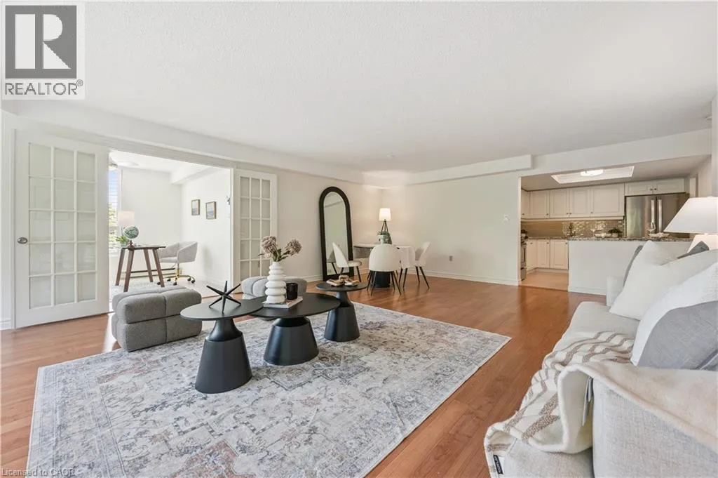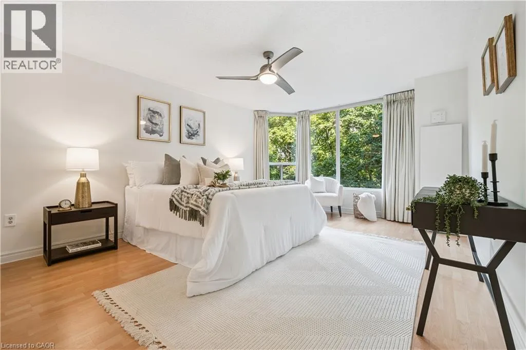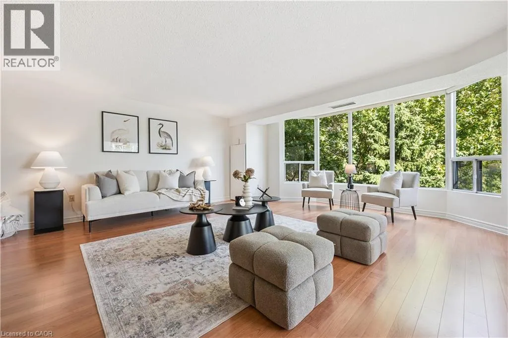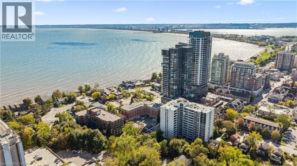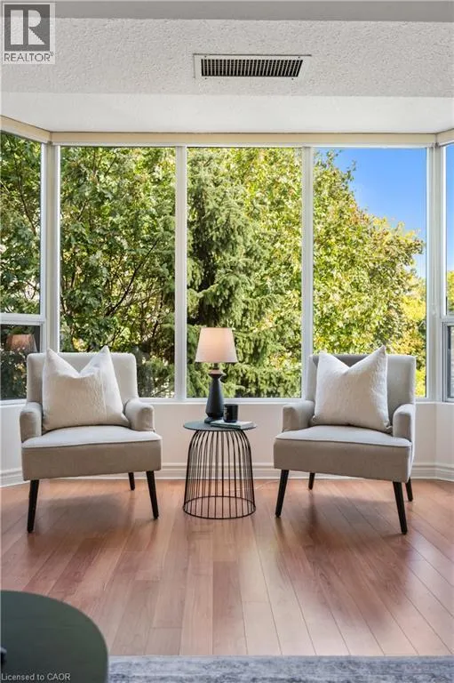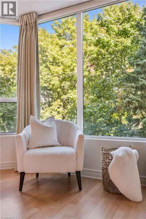 East on Brant, South on Lakeshore Rd Welcome to boutique living at Village Gate, in one of Burlingtonâs most sought-after Lakeshore areas. This 2 bed plus den, 2 bath corner suite offers over 1,500 square feet of thoughtfully planed living space with a quiet treed setting and peaceful views of the manicured grounds, Rambo Creek and Lake Ontario. Designed for style and functionality, the updated kitchen features quartzite counters, stainless-steel appliances, glass subway tile backsplash, under cabinetry lighting, a moulded tray ceiling, pot lights, and a breakfast bar. The open concept living and dining areas enjoy eastern exposure, filling the space with natural light through the tree-lined windows and the generous layout grants enough room for multiple seating areas to entertain comfortably. An adjacent den with French doors, California shutters and glimpses of the lake provides an ideal space for a home office, reading room or dinette. The primary suite is equipped with a large walk-in closet, custom organizers and a 5-piece ensuite with marble vanity, his and her sinks, standalone shower, and tiled jetted tub. Additional highlights include a spacious second bedroom, a 3-piece bath with glass shower, side by side in-suite laundry, a front coat closet, custom walk-in pantry, built-in closet organizers, and a separate storage locker. Residents enjoy the benefits of underground parking, ample visitor parking, and condo fees inclusive of all utilities, cable, and internet. The updated lobby, meticulous grounds, well-managed community and quiet atmosphere from its exclusive 39 suite capacity make living at Village Gate a pleasure. Located within walking distance to downtown shops, cafés, restaurants, Spencer Smith Park, the waterfront trail, hospital, and major highways, this residence offers a refined, low-maintenance lifestyle with every convenience at your doorstep. (id:27476)