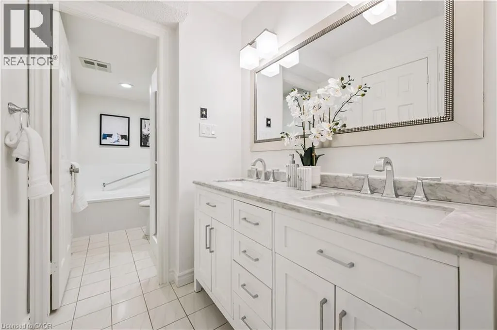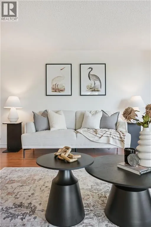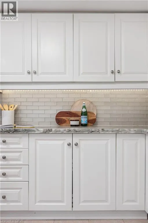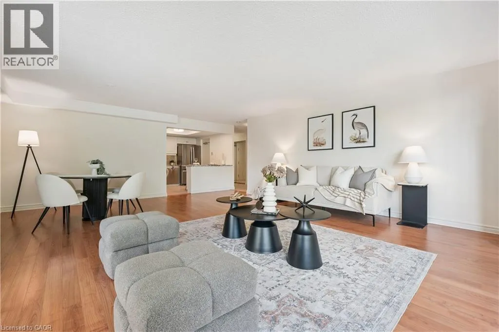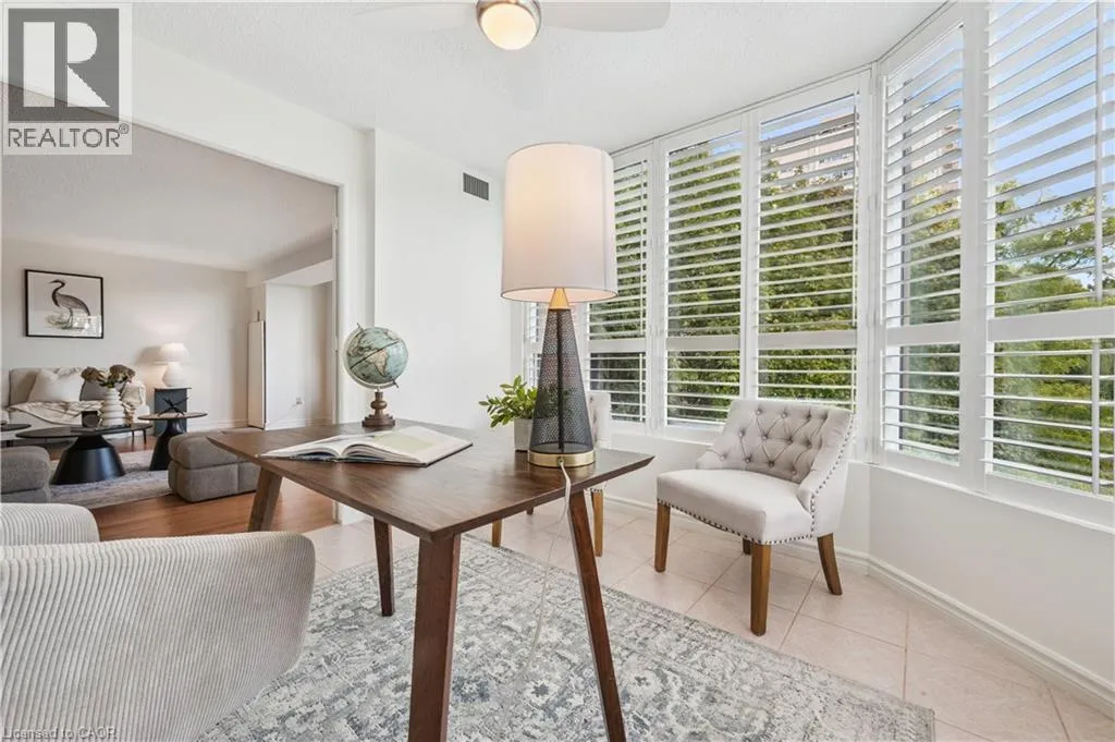 East on Brant, South on Lakeshore Rd Welcome to boutique living at Village Gate, in one of Burlingtonâs most sought-after Lakeshore areas. This 2 bed plus den, 2 bath corner suite offers over 1,500 square feet of thoughtfully planed living space with a quiet treed setting and peaceful views of the manicured grounds, Rambo Creek and Lake Ontario. Designed for style and functionality, the updated kitchen features quartzite counters, stainless-steel appliances, glass subway tile backsplash, under cabinetry lighting, a moulded tray ceiling, pot lights, and a breakfast bar. The open concept living and dining areas enjoy eastern exposure, filling the space with natural light through the tree-lined windows and the generous layout grants enough room for multiple seating areas to entertain comfortably. An adjacent den with French doors, California shutters and glimpses of the lake provides an ideal space for a home office, reading room or dinette. The primary suite is equipped with a large walk-in closet, custom organizers and a 5-piece ensuite with marble vanity, his and her sinks, standalone shower, and tiled jetted tub. Additional highlights include a spacious second bedroom, a 3-piece bath with glass shower, side by side in-suite laundry, a front coat closet, custom walk-in pantry, built-in closet organizers, and a separate storage locker. Residents enjoy the benefits of underground parking, ample visitor parking, and condo fees inclusive of all utilities, cable, and internet. The updated lobby, meticulous grounds, well-managed community and quiet atmosphere from its exclusive 39 suite capacity make living at Village Gate a pleasure. Located within walking distance to downtown shops, cafés, restaurants, Spencer Smith Park, the waterfront trail, hospital, and major highways, this residence offers a refined, low-maintenance lifestyle with every convenience at your doorstep. (id:27476)