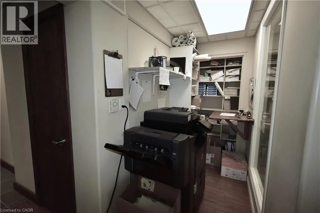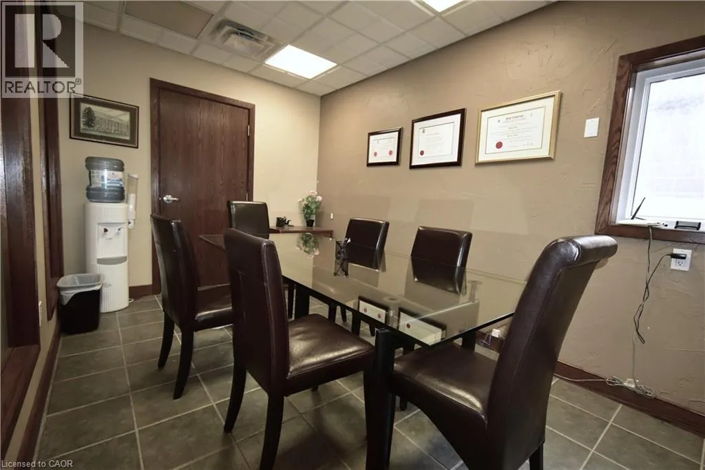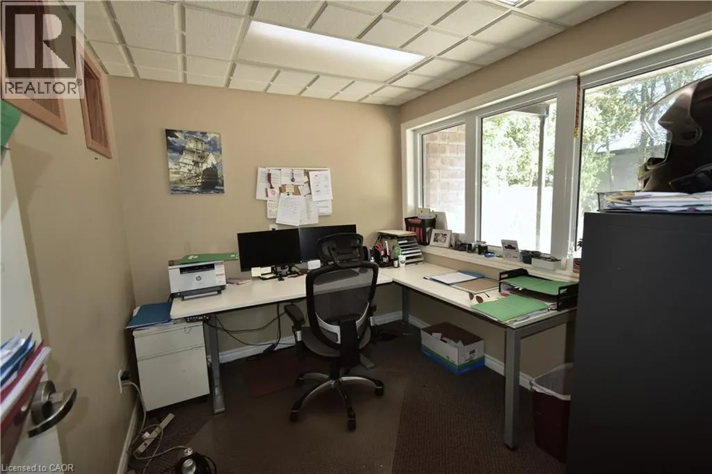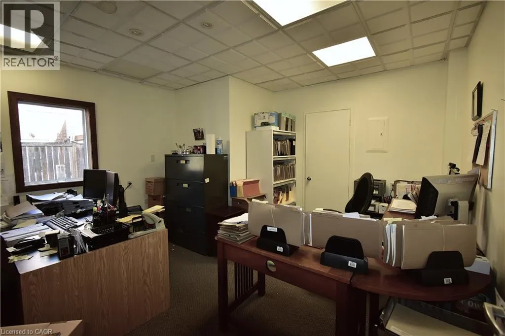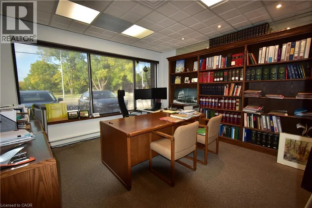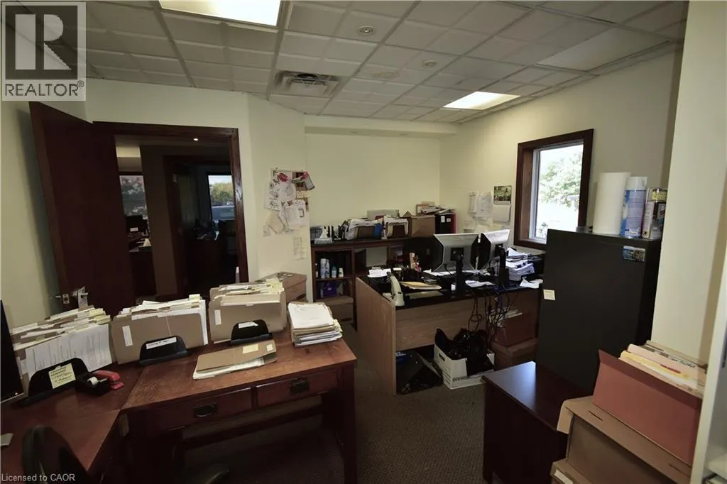 North of Plains Road Current tenant relocating. Highly visible and accessible office space suitable for many uses under the existing MXE Zoning; currently used as a legal office. On-site parking at front (3) and rear (7) of building. Area for lease includes main level only (approx. 1740 sf) but lower level may also be leased at an additional rent if required. Rent is a Gross Lease and includes taxes, building insurance and exterior maintenance. Tenant pays own utilities. Main level includes: Reception area, two private offices and boardroom at the front leading to the back work areas. Mixture of carpet floor covering, ceramic tile, and hardwood in the lobby, boardroom, hallway, and reception area, acoustic tile ceiling and fluorescent lighting. Two 2-piece washrooms, stained wood trim and casings. Owner is registered real estate broker. (id:27476)