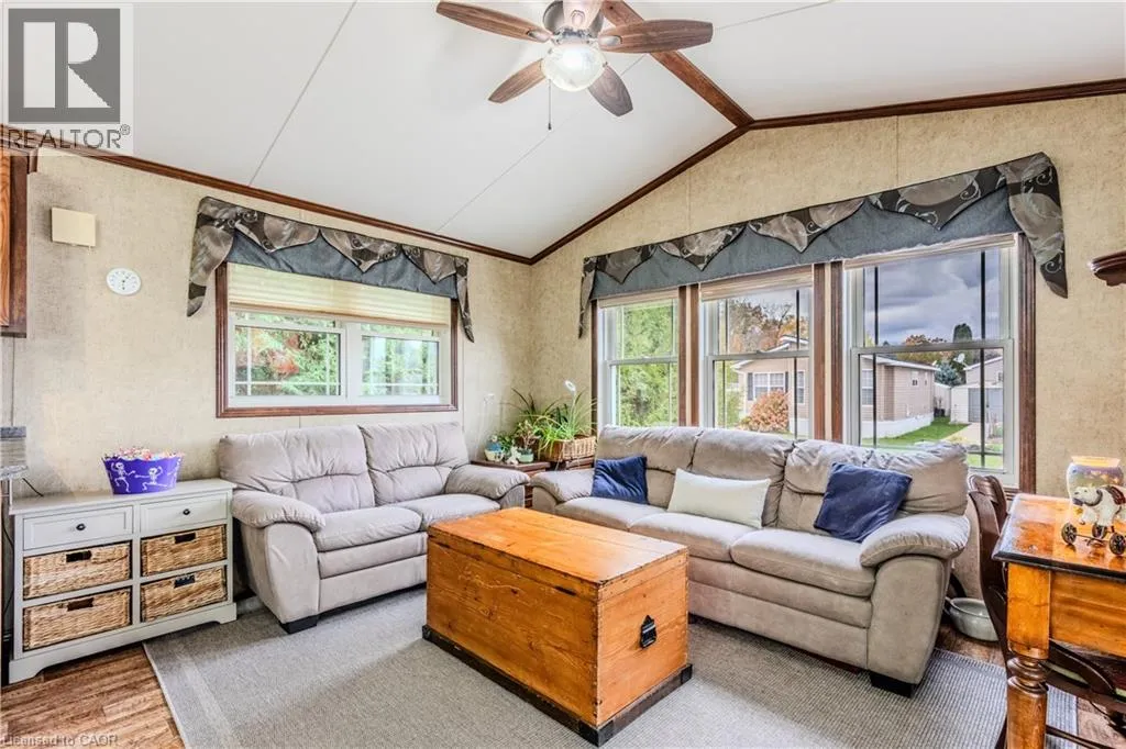 Concession 6 East ending at park entrance, enter code, go thru gate, stay to the right, 4th street to left Tamarack, first house on right by visitors parking Sharp home, move in condition, in Burlingtonâs highly desired Lost Forest Park with secure gated entry. Located just minutes from Memorial Park in the Village of Waterdown. 1 bed, 1 bath, Home features a spacious family room with an abundance of windows. Large eat-in kitchen with quality cabinetry, flooring, appliances, and plenty of room for dining. Off family room and kitchen is a walkout to a huge 36 X 10 covered deck. This is an End Unit, besides visitors parking, great when you have guests!! The monthly fee includes land lease, maintenance of the park and systems and property tax. (id:27476)