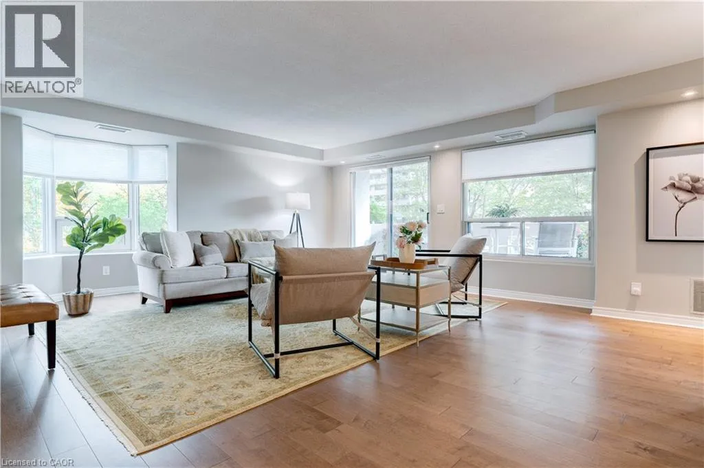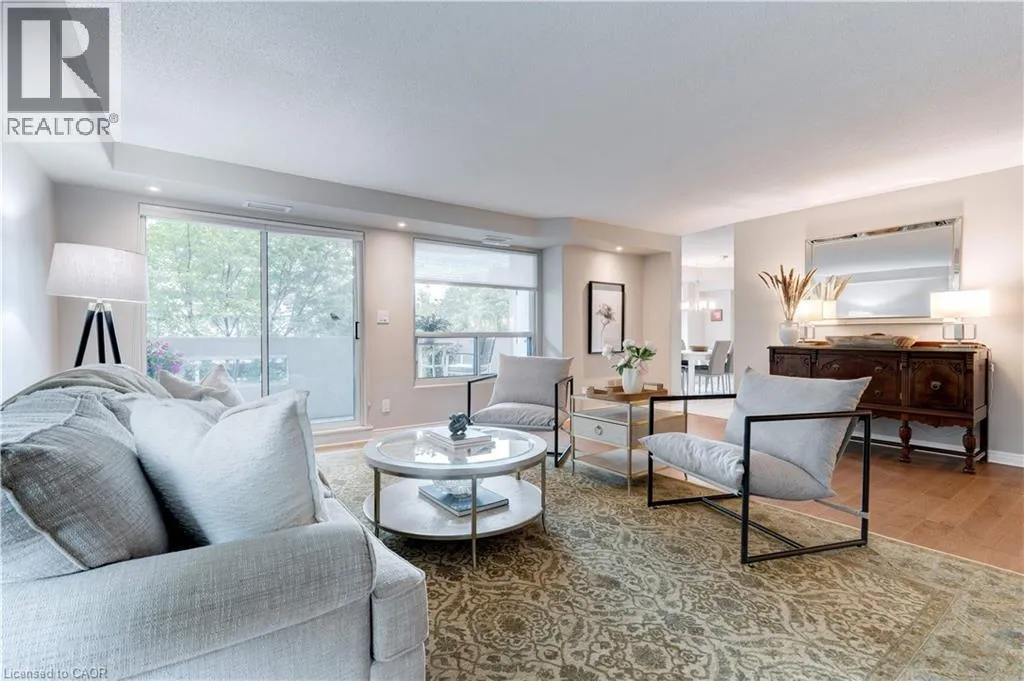 Lakeshore Rd to Maple Avenue to Ontario Street Welcome to The Maples-This beautifully updated 2-bedroom, 2-bathroom corner suite offers 1,430 sq. ft. of bright, open-concept living in one of Burlington's most sought-after downtown buildings. Enjoy a short walk to the lake, Spencer Smith Park, waterfront trail, shops, restaurants, the Art Gallery, and Performing Arts Centre, with quick access to highways. Inside, you'll find a spacious living and dining area updated flooring and baseboards, and a walkout to a large private balcony. The eat-in kitchen features quartz countertops, ample cabinetry, and modern stainless-steel appliances. Both bedrooms are generous in size with newer flooring. Added conveniences include in-suite laundry, plenty of storage, a private locker, and one premium underground parking spot. Building amenities include a top-floor party room with outdoor space and a guest suite. A rare combination of size, comfort, and walkable lifestyle in downtown Burlington! (id:27476)