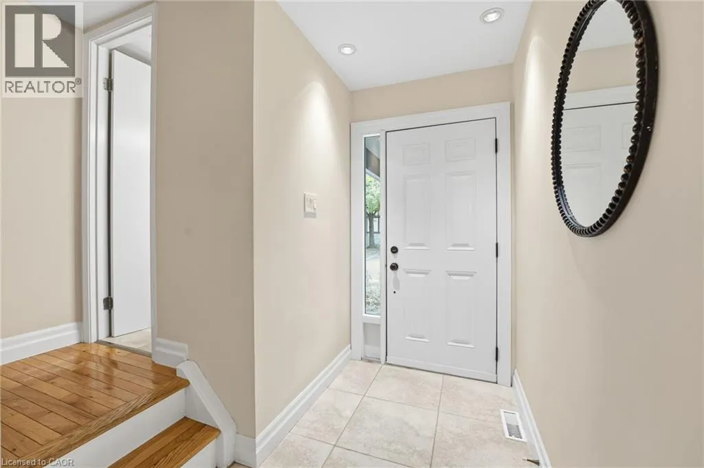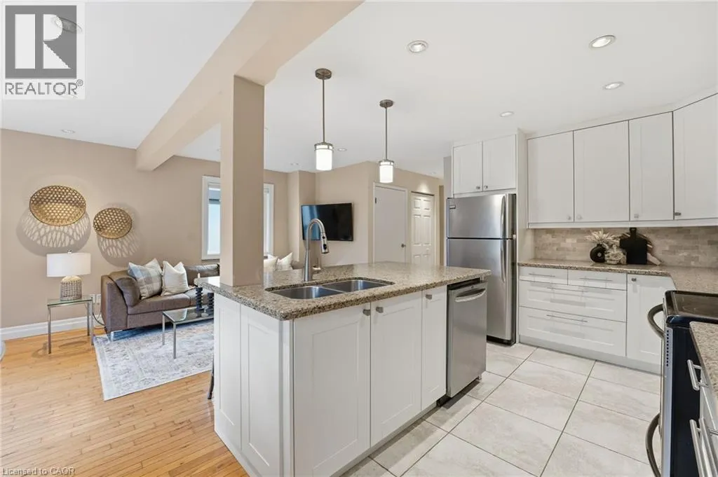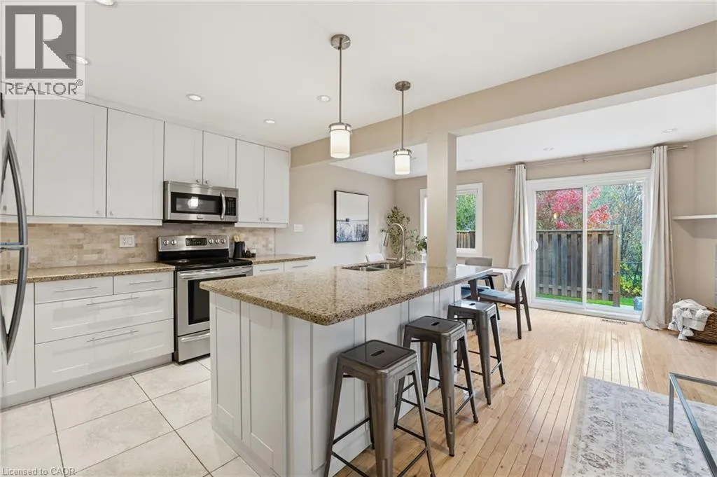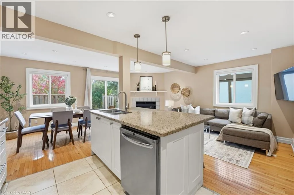 QEW Highway to Guelph Line to Glenwood School Drive This beautifully updated end-unit townhome offers 3 spacious bedrooms, 3 bathrooms, and a private, fully fenced backyard backing onto a quiet creek. Featuring hardwood flooring throughout, an open-concept main floor with a cozy wood-burning fireplace, pot lights and a stylish kitchen with quartz countertops, island, tiled backsplash and under-cabinet lighting, the home is both warm and functional. Upstairs, the primary bedroom includes a walk-in closet, continued hardwood flooring and a beautifully renovated 4-piece bathroom. The partially finished basement adds flexibility with a 3-piece bathroom already in place and a huge rec room. Major updates include a new furnace, A/C, and tankless water heater (2024), new washer/dryer (2024), and a sump pump and backflow valve (2025). Enjoy inside access to the garage, a quiet setting within a private complex park, and easy access to nearby schools, parks, public transit, GO Train, and shopping, all in a move-in-ready, carpet-free home that blends comfort, convenience, and nature. (id:27476)