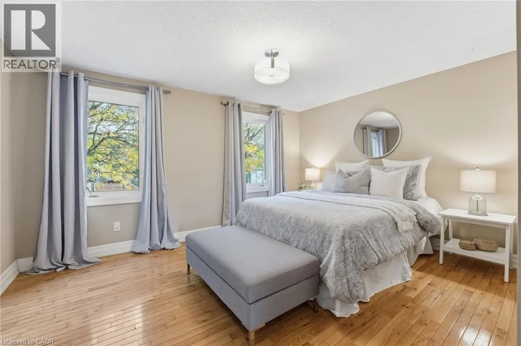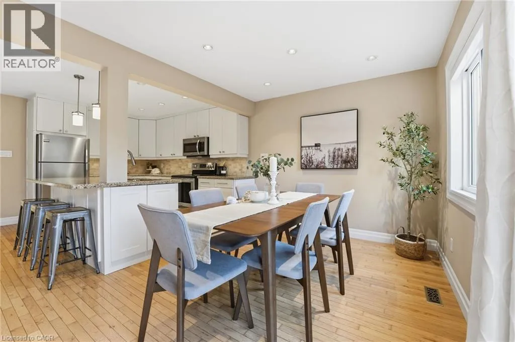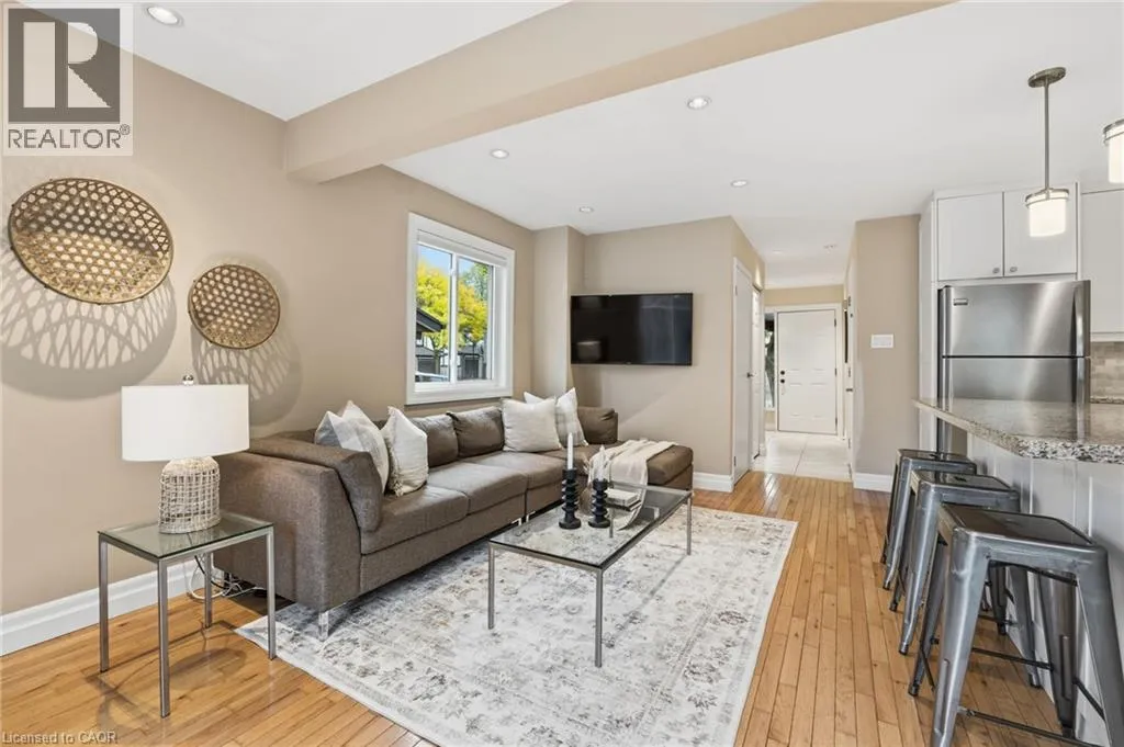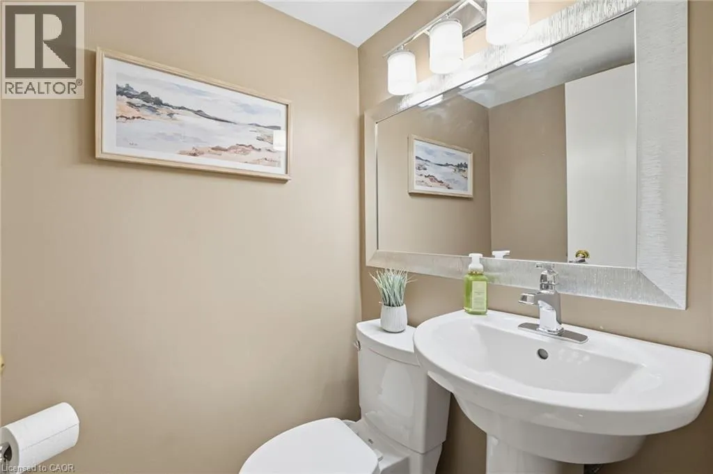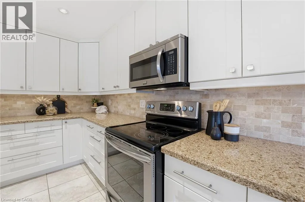 QEW Highway to Guelph Line to Glenwood School Drive This beautifully updated end-unit townhome offers 3 spacious bedrooms, 3 bathrooms, and a private, fully fenced backyard backing onto a quiet creek. Featuring hardwood flooring throughout, an open-concept main floor with a cozy wood-burning fireplace, pot lights and a stylish kitchen with quartz countertops, island, tiled backsplash and under-cabinet lighting, the home is both warm and functional. Upstairs, the primary bedroom includes a walk-in closet, continued hardwood flooring and a beautifully renovated 4-piece bathroom. The partially finished basement adds flexibility with a 3-piece bathroom already in place and a huge rec room. Major updates include a new furnace, A/C, and tankless water heater (2024), new washer/dryer (2024), and a sump pump and backflow valve (2025). Enjoy inside access to the garage, a quiet setting within a private complex park, and easy access to nearby schools, parks, public transit, GO Train, and shopping, all in a move-in-ready, carpet-free home that blends comfort, convenience, and nature. (id:27476)