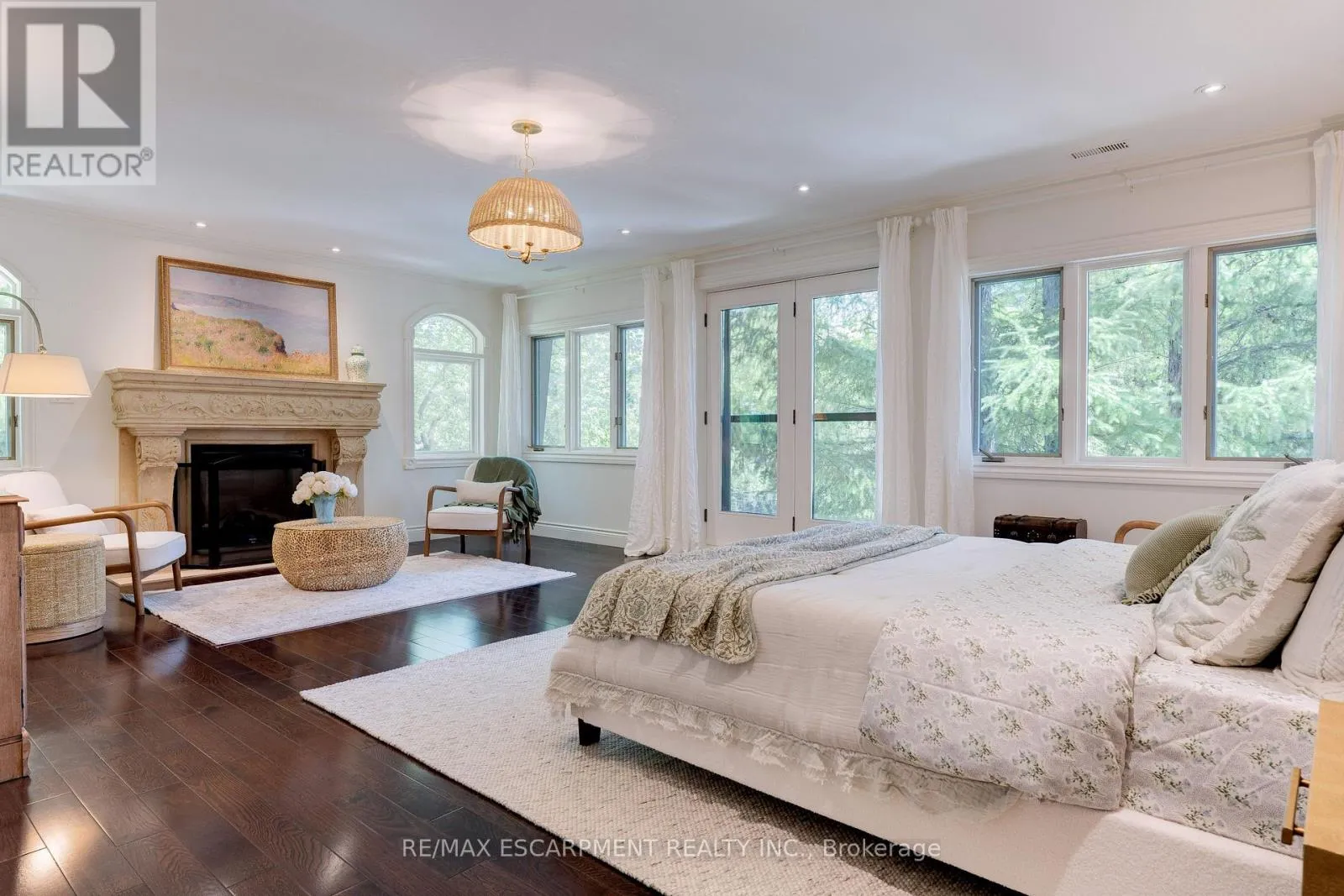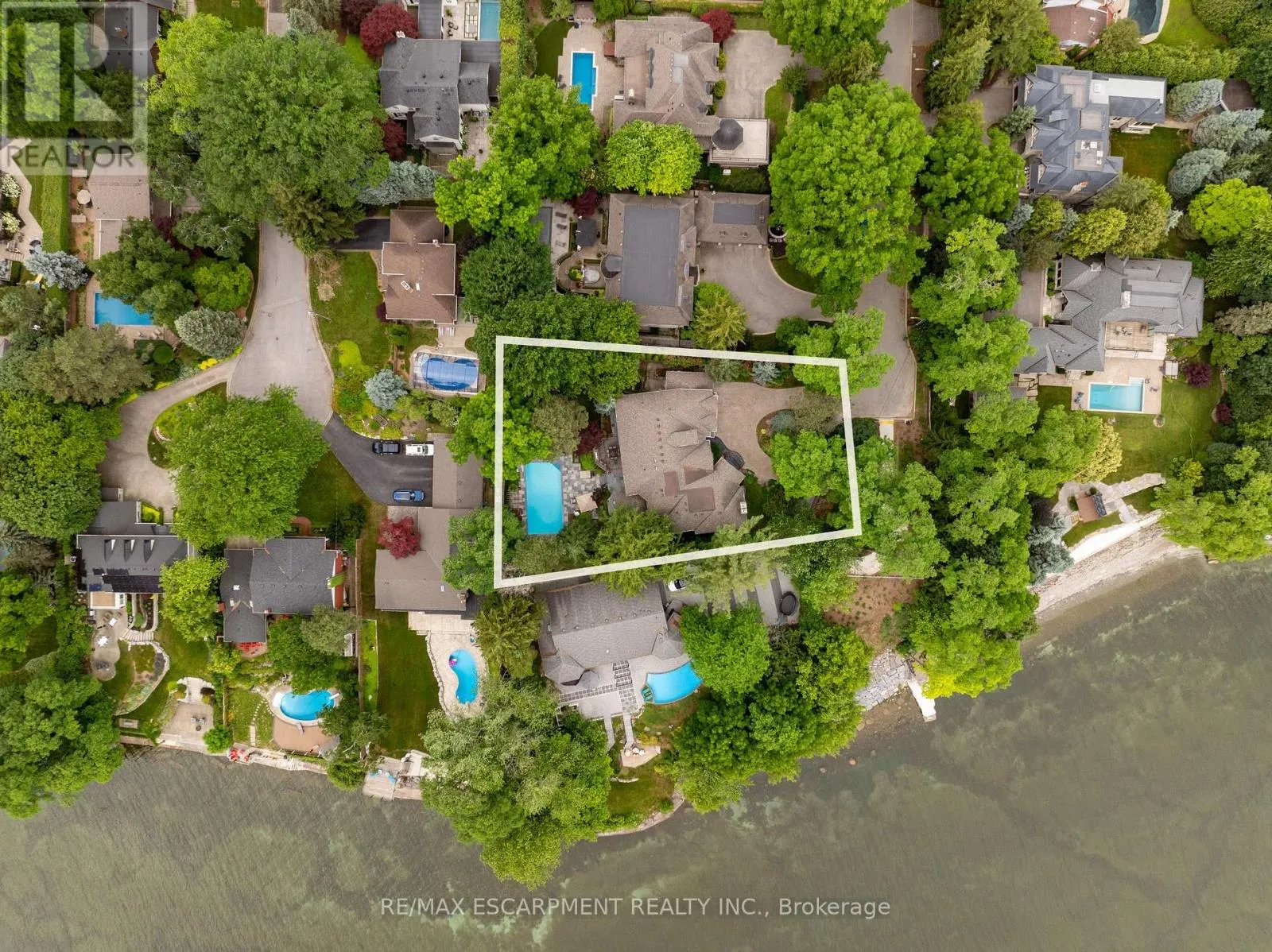 Cross Streets: Appleby/Lakeshore. ** Directions: South on Appleby Place from Lakeshore. Welcome to this exceptional luxury estate in Shoreacres, steps from the lake - offering over 9,000 sqft of beautifully designed living space.Custom built with impressive curb appeal and meticulous attention to detail. Grand entrance and main staircase welcome you to this thoughtfully designed home that blends relaxed elegance w/timeless design through layered millwork and a purposeful layout. The formal living features coffered ceilings, gas fireplace and double sided aquarium. The grand dining room provides ample space for large family gatherings. A sun soaked kitchen opens into a bright sunroom and walkout to the backyard- ideal for morning coffee or hosting poolside gatherings. Chef's kitchen features a large island, gas cooktop, double wall ovens, oversized fridge, pantry and a built-in bar area with sink. The utility wing is tucked away w/mudroom, garage access, secondary stairs and additional rear yard access. The south facing primary retreat has lake views, gas fireplace,generous walk-in and a spa ensuite. Four additional well-appointed bedrooms enjoy their own private ensuite. The fifth bedroom also features its own rec room with second laundry and sink - perfect for a dedicated in-law or nanny suite. The nearly 3,100 sqft finished basement includes a bedroom with ensuite, bar, wine cellar, theatre room, gym, and ample space for entertaining.The professionally landscaped rear yard features multiple flagstone seating areas, a full size heated salt water pool with automatic cover, outdoor kitchen/ BBQ station, and covered cabana with gas fireplace, all bundled in a Muskoka-like tranquil setting. Elegant, timeless, and serene-this is a rare opportunity to live steps from the lakein one of Burlington's most coveted neighbourhoods. Luxury Certified. (id:27476)
