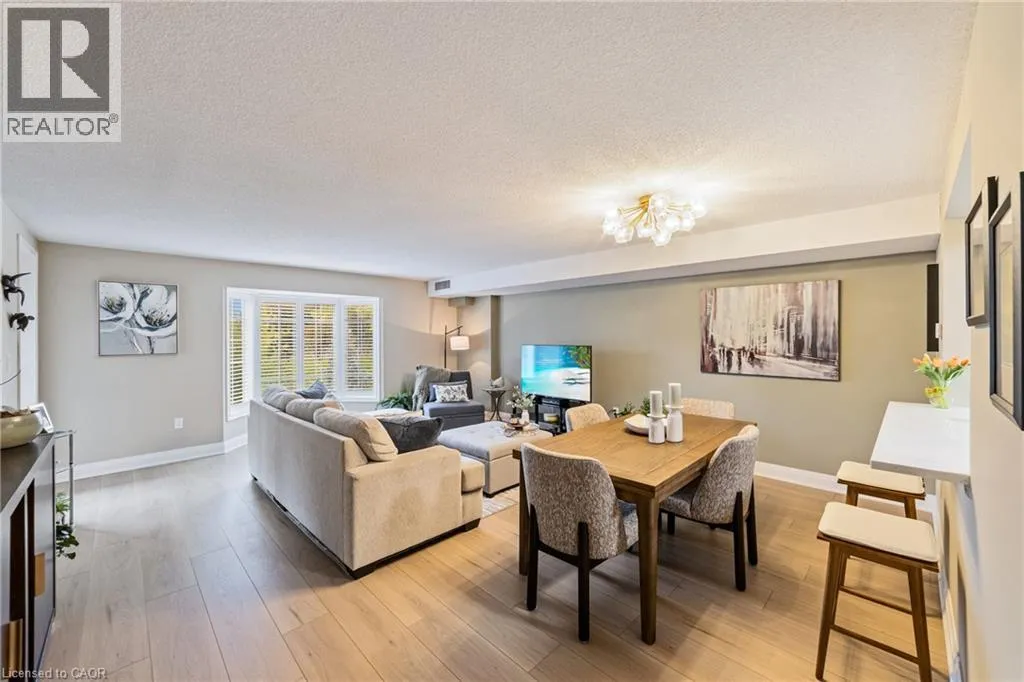 Waterdown Rd to Plains Rd W. Discover the perfect blend of comfort, style, and tranquility in this beautifully updated one-bedroom, one-bath condo. Located on the top floor of a quiet low-rise building, this suite has much to offer. The updated kitchen features timeless white cabinetry and a pass-through window to the dining area â perfect for entertaining or enjoying a cozy meal at home. Recent upgrades include brand-new stainless steel appliances, countertop, backsplash, and sink, along with elegant luxury vinyl flooring that flows seamlessly throughout. Every detail has been thoughtfully refreshed, from the custom doors and built-in bathroom vanity to the all-new lighting and fresh paint. The spacious primary bedroom offers a semi-ensuite bath, a walk-in closet plus a second double closet, and a custom window blind for added privacy and style. Enjoy the convenience of in-suite laundry with a full-size washer and dryer. Step out onto your private balcony and take in the calming view of mature trees â a perfect spot to enjoy your morning coffee or unwind at the end of the day surrounded by nature. Comes with one underground parking space located right across from the elevator and one locker. Donât miss your chance to call this spacious suite your home. (id:27476)
