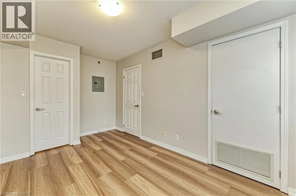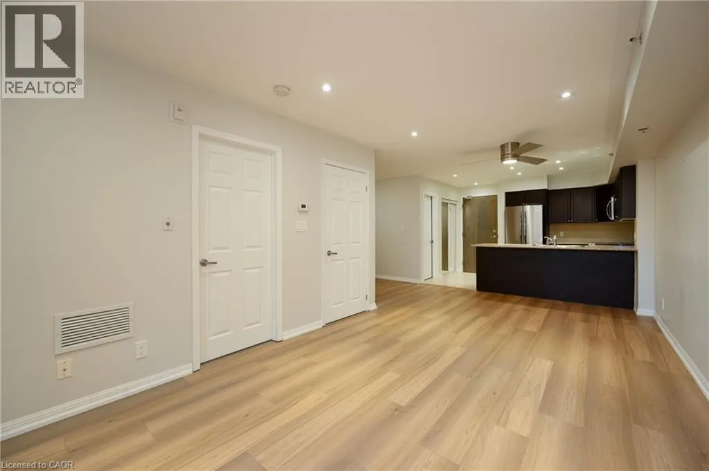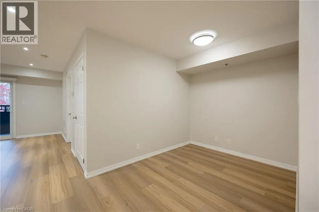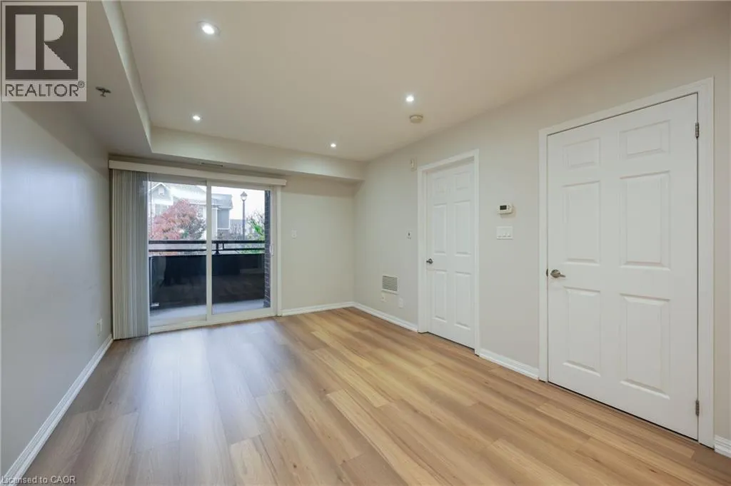 Dundas/ Rotary (East of Walkers Line) Stylish one-bedroom plus den condo in sought-after Alton Village. Offering approximately 706 square feet, this open-concept suite features a bright and spacious living area filled with natural light, a sleek kitchen with rich espresso cabinetry, full-size stainless steel appliances, ample storage, and a breakfast bar for casual dining. The bedroom offers a generous walk-in closet and an oversized window, while the four-piece bath includes a combined tub and shower. Additional highlights include in-suite laundry with a newer LG wash tower, LED pot lights, and a private balcony with northwestern exposure for late afternoon and evening sun. Recent updates include new hardwood flooring and a French door-style refrigerator (both Nov 2025). Ideally located steps from shopping, dining, and everyday conveniences, with easy access to transit and nearby parks. One underground parking space and one locker included. Tenant to pay all utilities. Credit check, rental application, references, and proof of employment required with all offers. (id:27476)