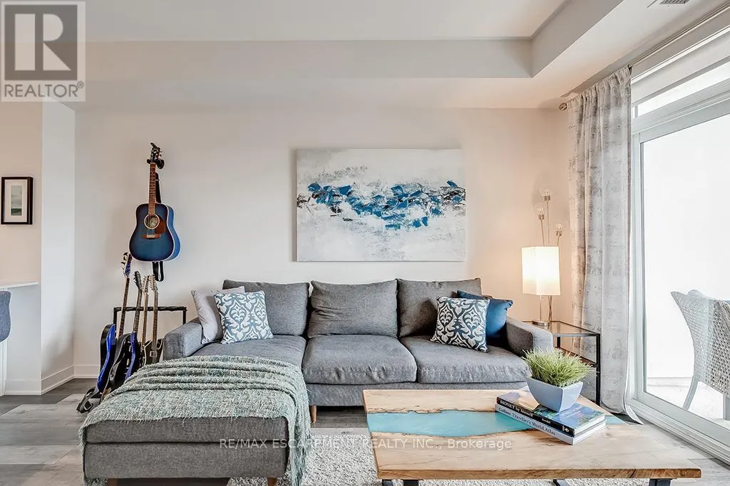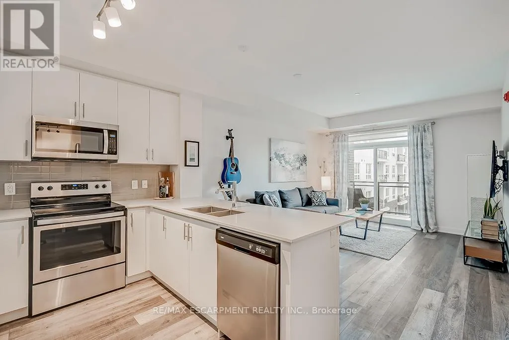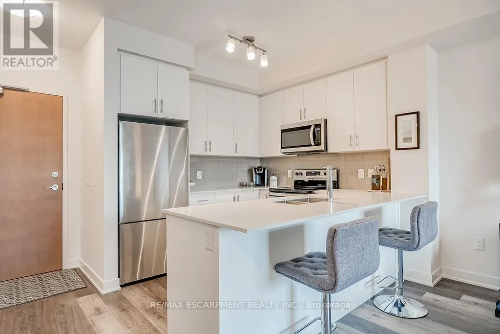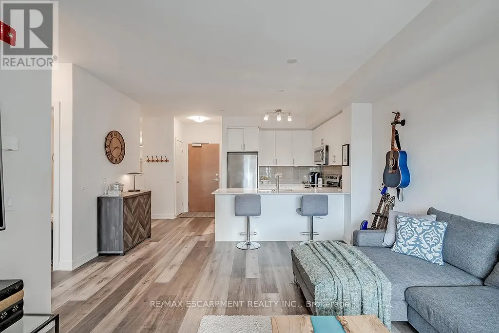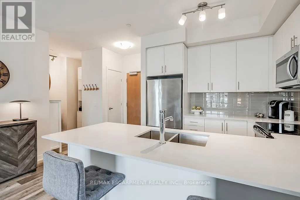 Cross Streets: Filmandale Road. ** Directions: Plains Road E/Filmandale Road. Stunning one bedroom + den suite at Affinity in Aldershot! Custom kitchen with quartz, stainless steel appliances, breakfast bar and glass subway tile backsplash. Open concept living with 9' ceilings, in-suite laundry, 4-piece bathroom and spacious private balcony. Steps to the GO station, RBG, marina, library, schools and Burlington Golf & Country Club. One underground parking space and one storage locker on unit level. Building amenities include loads of visitor parking, electric car charging station, rooftop terrace with BBQs, gym, yoga room and party room! (id:27476)