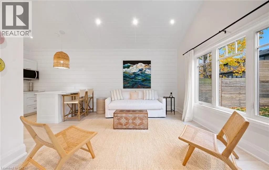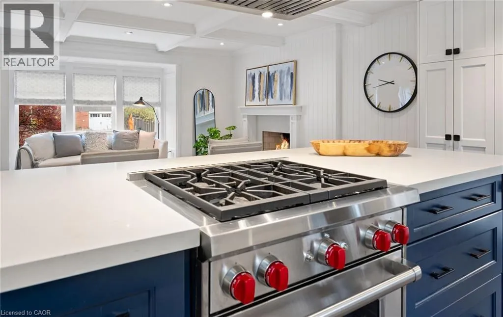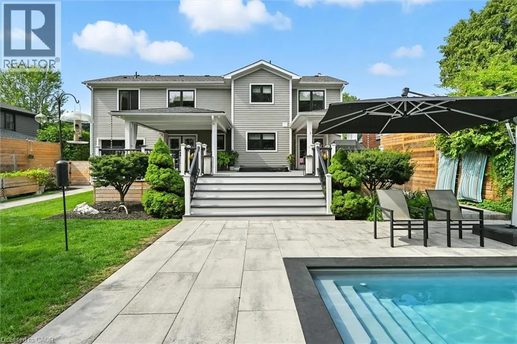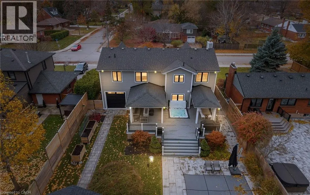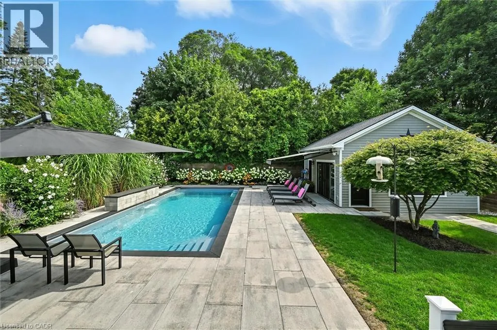 Prospect West of Drury Lane Stunning custom home on a 63' x 136' lot in downtown Burlington. Professionally landscaped yard with heated pool and detached year-round living space, ideal as a nanny suite, office, or guest houseâincludes kitchenette, 3-pc bath, and cozy lounge. Inside features coffered ceilings, 8 hand-scribed hardwood, custom millwork, and gourmet kitchen with quartz counters, bold blue island, premium appliances, and coffee bar. French doors open to a covered deck with sunken hot tub. Family room with wood-burning fireplace. Luxurious primary suite with spa-like ensuite and custom dressing room. Three additional bedrooms and stylish 4-pc bath upstairs. Finished lower level with rec room, 2-pc bath, and laundry/wet bar with granite and full-size fridge. (id:27476)