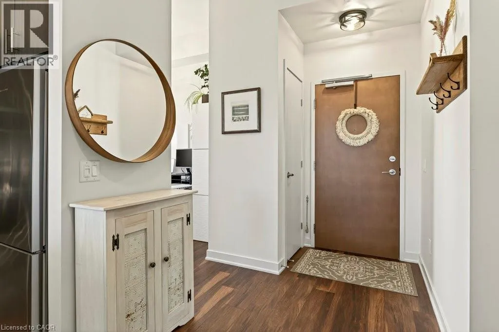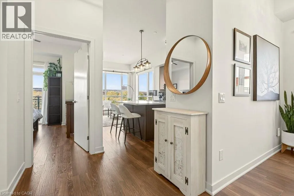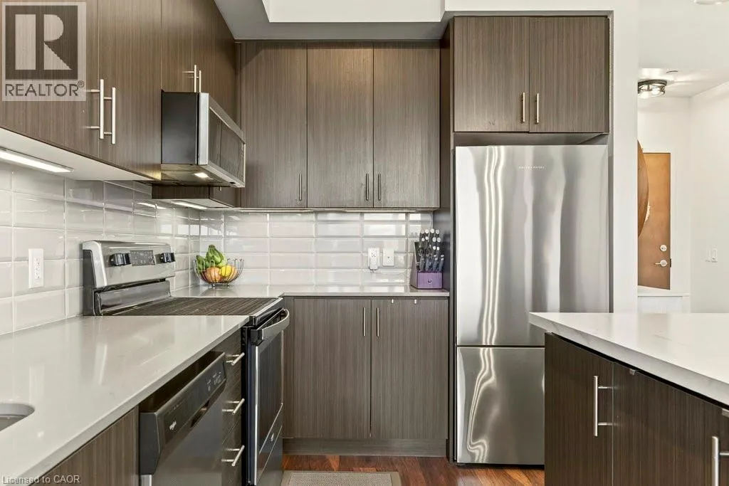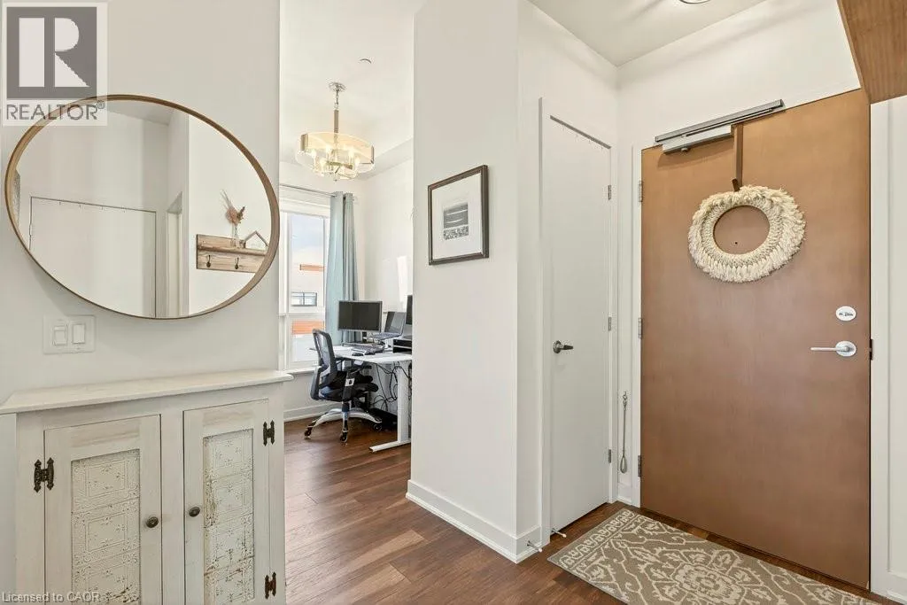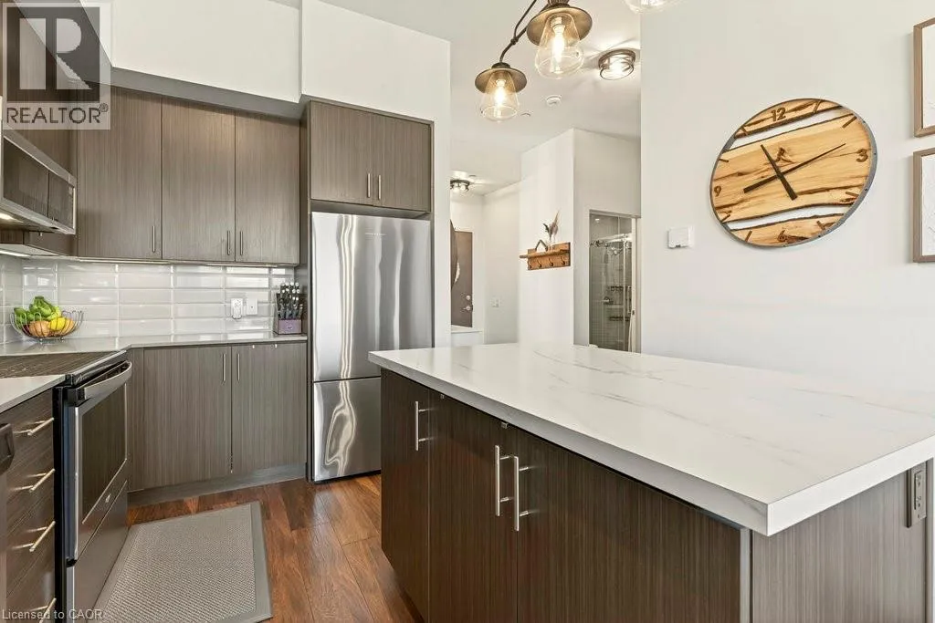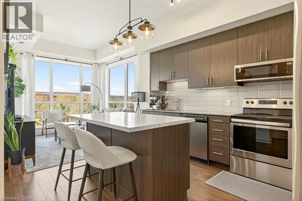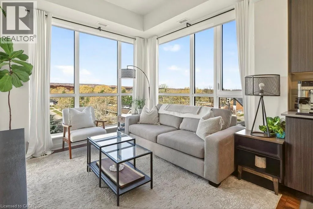 Plains Road E/Filmandale Road Unique opportunity to own a gorgeous one bedroom + den top floor corner suite at sought-after Affinity in Aldershot! Floor to ceiling windows with stunning views of the escarpment and beyond! Upgraded kitchen with stainless steel appliances, quartz countertop, island, subway tile backsplash and under-cabinet lighting. Open and extremely bright living space with 10' ceilings, upgraded wide plank flooring, upgraded lighting, in-suite laundry, 3-piece bathroom, walkout to a private balcony and a cozy den perfect for a home office. The spacious bedroom features a second walkout to the balcony and a large closet with built-ins and motion sensor lighting. Just steps to the GO station, RBG, marina, library, schools and Burlington Golf & Country Club. One underground parking space and one storage locker on unit level. Building amenities include an electric car charging station, rooftop terrace with BBQs, gym, yoga room, party room and loads of visitor parking! (id:27476)