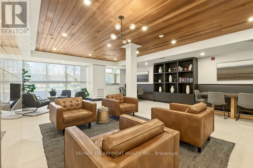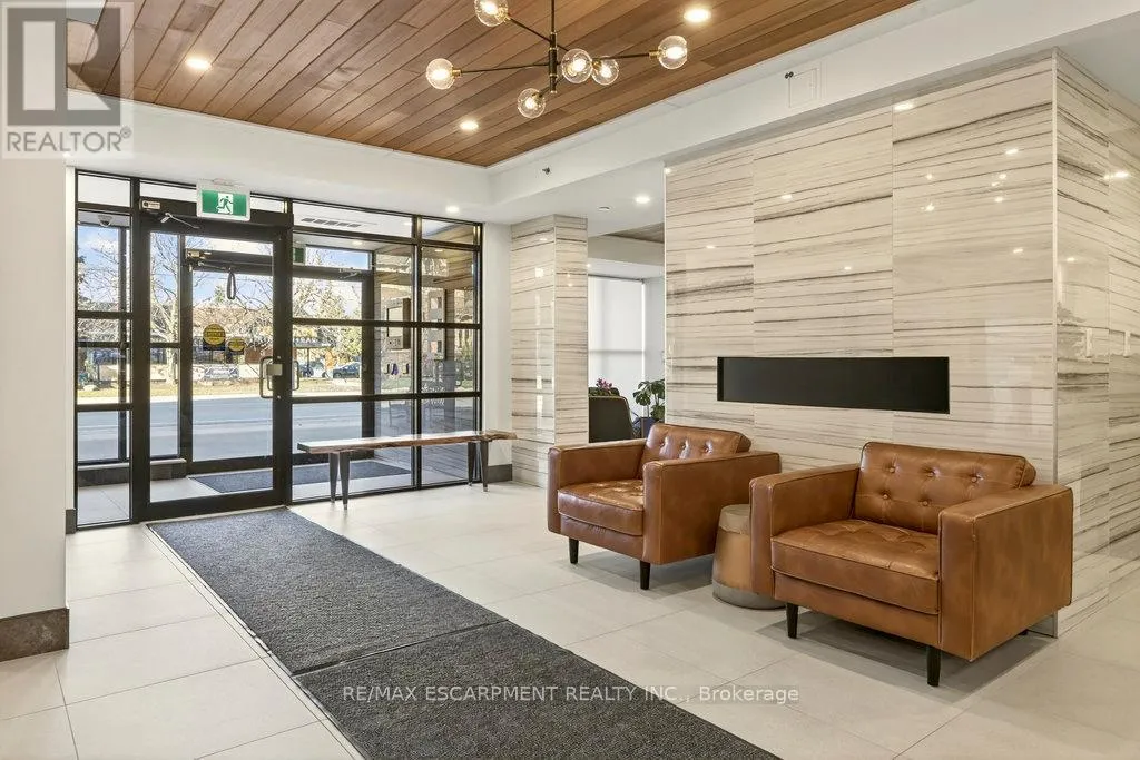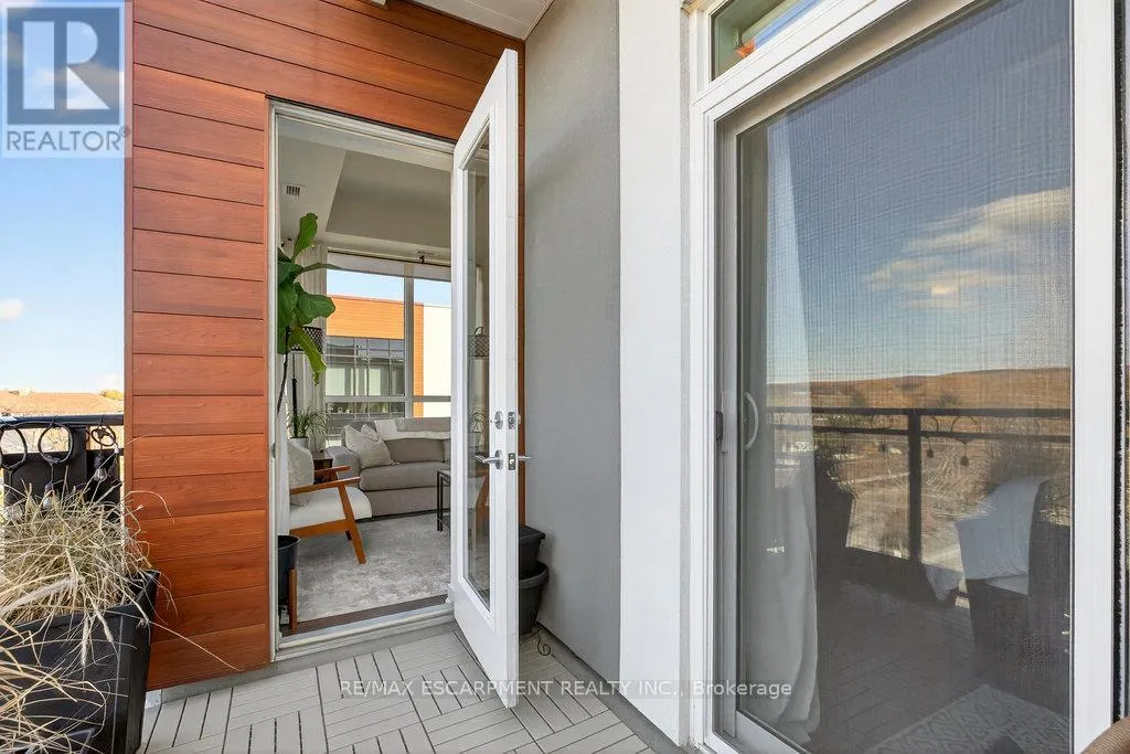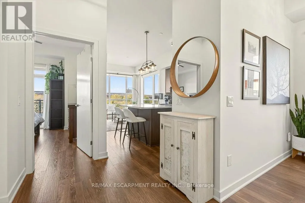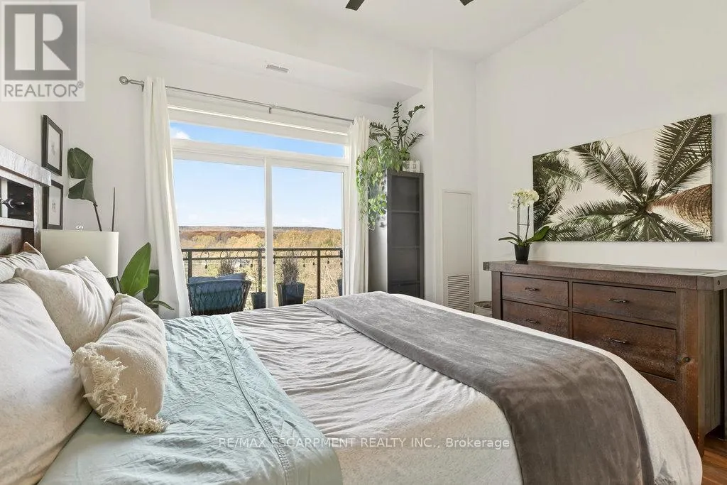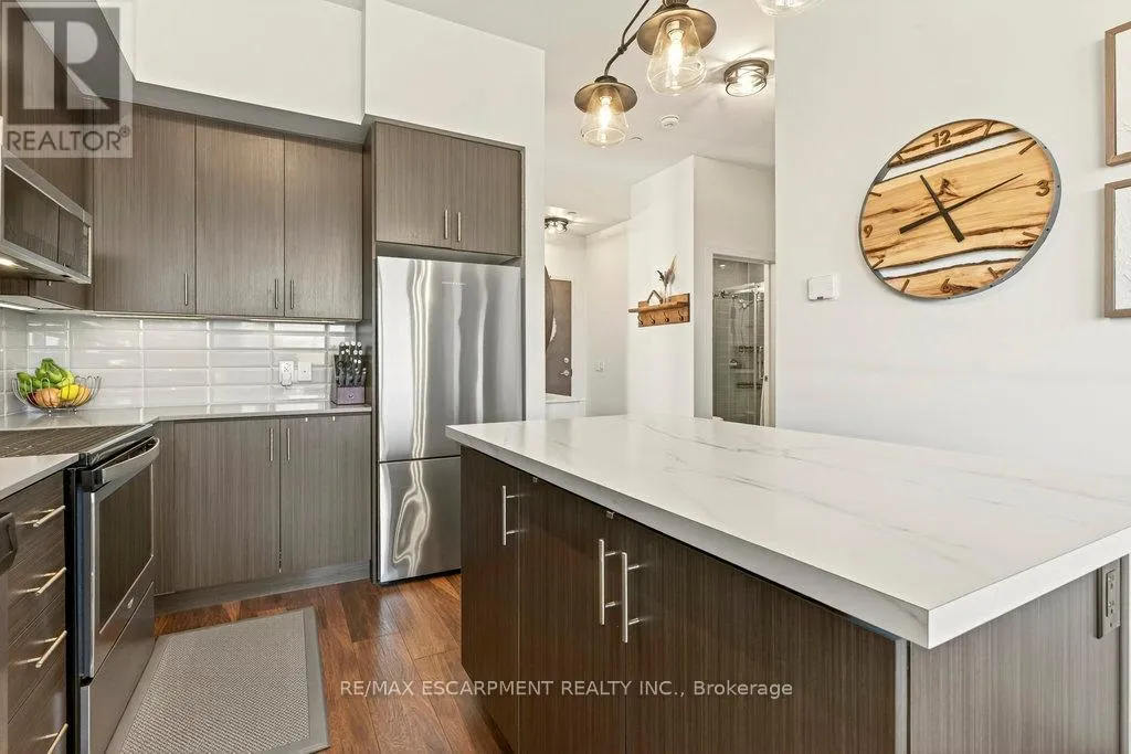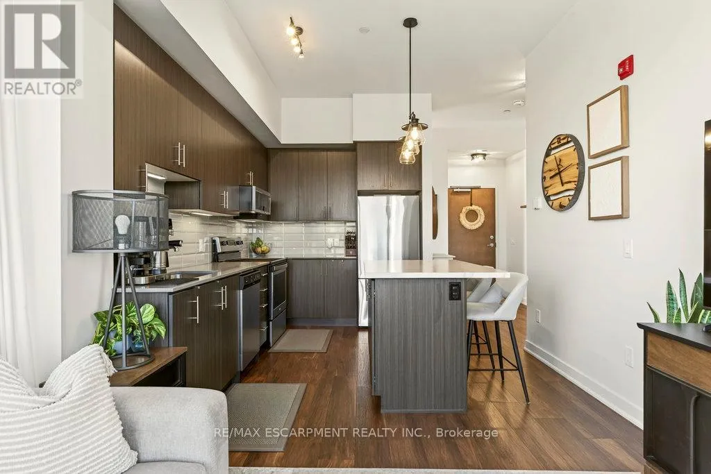 Cross Streets: Filmandale Road. ** Directions: Plains Road E/Filmandale Road. Unique opportunity to own a gorgeous one bedroom + den top floor corner suite at sought-after Affinity in Aldershot! Floor to ceiling windows with stunning views of the escarpment and beyond! Upgraded kitchen with stainless steel appliances, quartz countertop, island, subway tile backsplash and under-cabinet lighting. Open and extremely bright living space with 10' ceilings, upgraded wide plank flooring, upgraded lighting, in-suite laundry, 3-piece bathroom, walkout to a private balcony and a cozy den perfect for a home office. The spacious bedroom features a second walkout to the balcony and a large closet with built-ins and motion sensor lighting. Just steps to the GO station, RBG, marina, library, schools and Burlington Golf & Country Club. One underground parking space and one storage locker on unit level. Building amenities include an electric car charging station, rooftop terrace with BBQs, gym, yoga room, party room and loads of visitor parking! (id:27476)