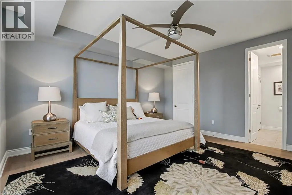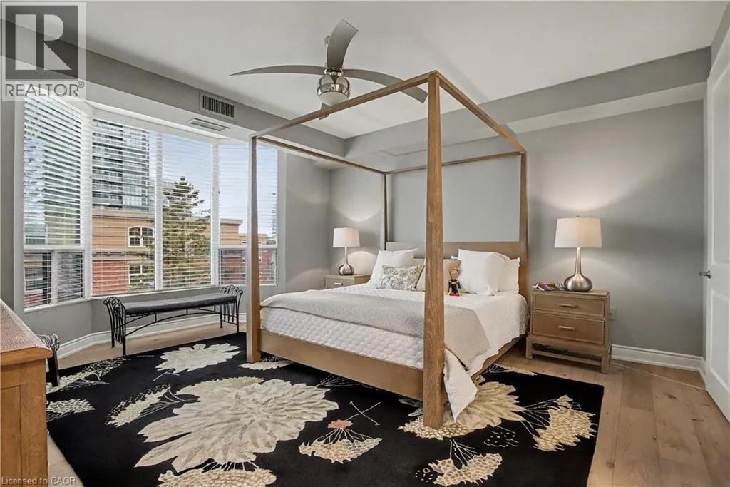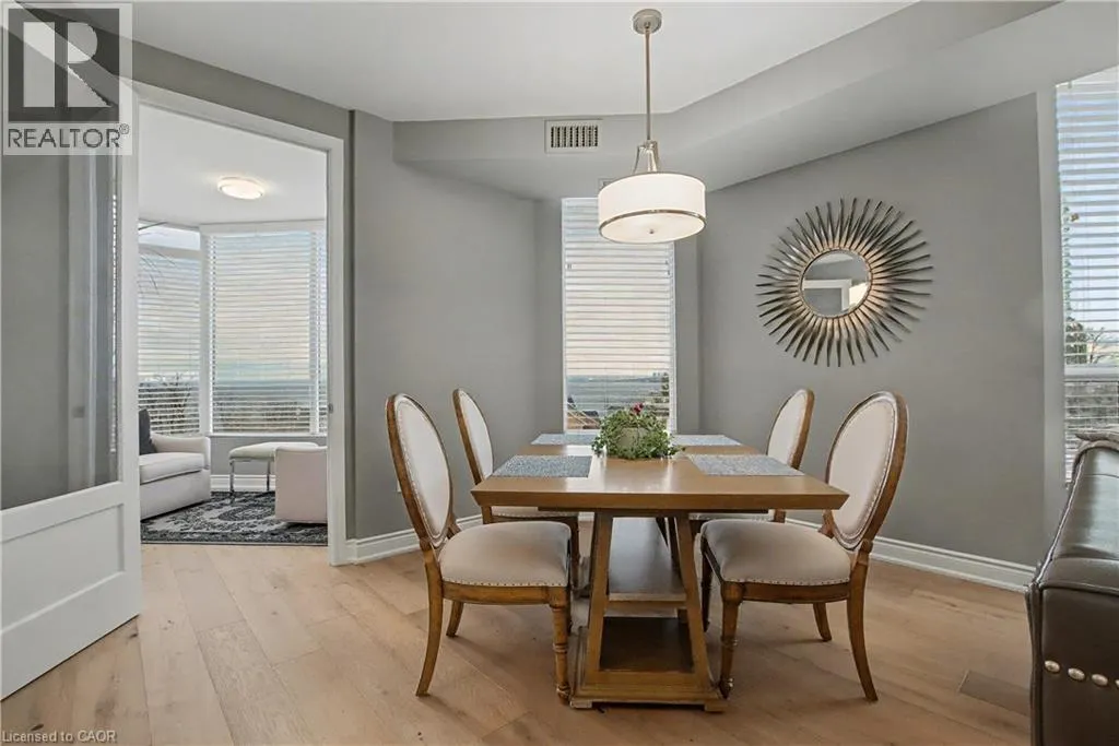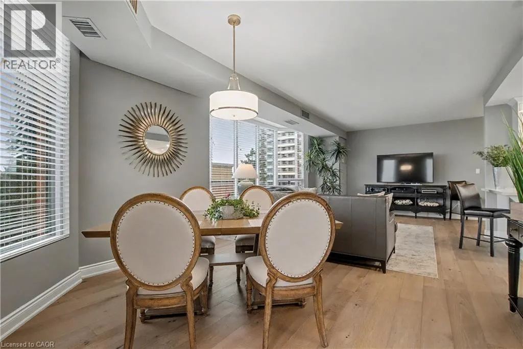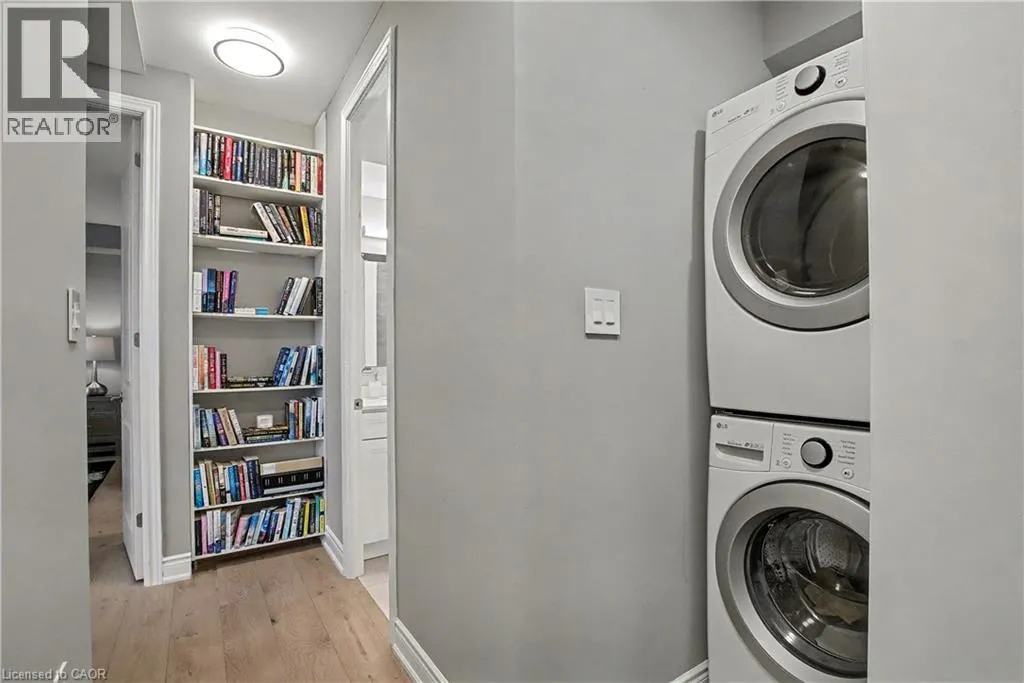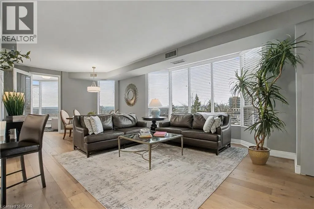 South on Brant; East on Lakeshore Road Location, Location! Within steps of Burlingtonâs vibrant downtown, 2121 Lakeshore Road â âVillage Gateâ â stands as an exclusive boutique condominium. Welcome to Unit 603, a distinguished corner suite where luxury, light and views define every room. Featuring 9' ceilings, expansive windows, and beautifully scaled principal rooms, this residence blends contemporary elegance with soft, refined décor. Every detail has been thoughtfully curated to offer a serene, elevated living experience. The open-concept Living & Dining Room is ideal for both lavish entertaining & intimate evenings at home. A separate Den provides a tranquil space to unwind while taking in the view. The custom Kitchen showcases white cabinetry, quartz surfaces, a breakfast bar, glass tile backsplash, LED pot lights, & stainless steel appliances. Tucked away from the main living area, the Bedroom Wing offers discretion & calm. A charming Hall Library welcomes you into the private quarters. The Principal Bedroom Retreat impresses with a cozy sitting area framed by a bay window, custom walk-in closet, a spa-inspired 3-piece Ensuite featuring heated tile floors, vanity w/quartz counters, step-in shower & linen closet. A spacious Second Bedroom, also highlighted by its own bay window & stunning views, ensures guests enjoy comfort & style. The Main Bath mirrors the luxe finishes of the ensuite w/heated flooring, white cabinetry, quartz counters & a step-in shower. Additional Appointments: In-suite Laundry w/ stacked washer/dryer & storage. Engineered hardwood floors; custom blinds; tall interior doors; closets w/custom organizers, two linen closets. Two Parking Spaces. Locker. The building offers FOB-secured lobby access, elevators & visitor parking. Unmatched Downtown lifestyle: cafés, boutiques, Performing Arts Centre, fine dining, Art Gallery, Waterfront Trail, plus nearby hospital, transit, recreation, shopping & major highways. Unit 603 at 2121 Lakeshore Road â âHoney, Iâm Home.â (id:27476)
