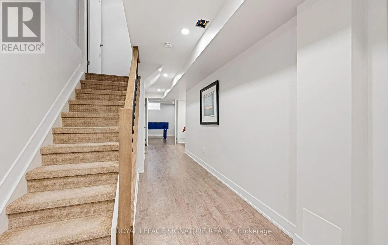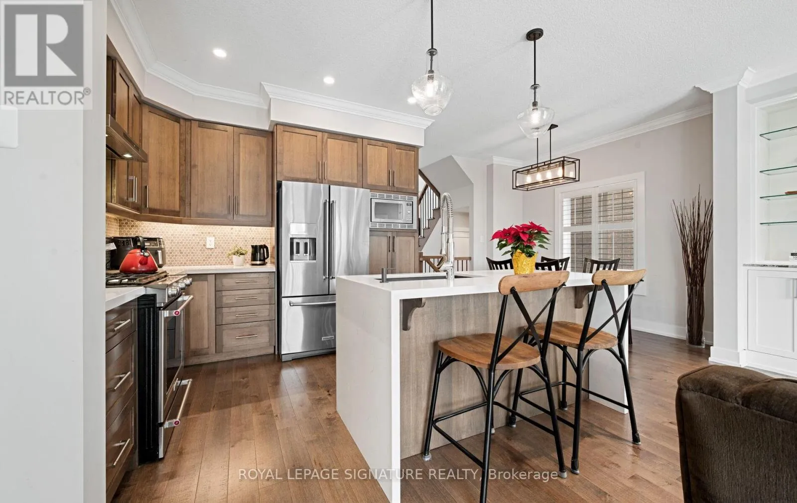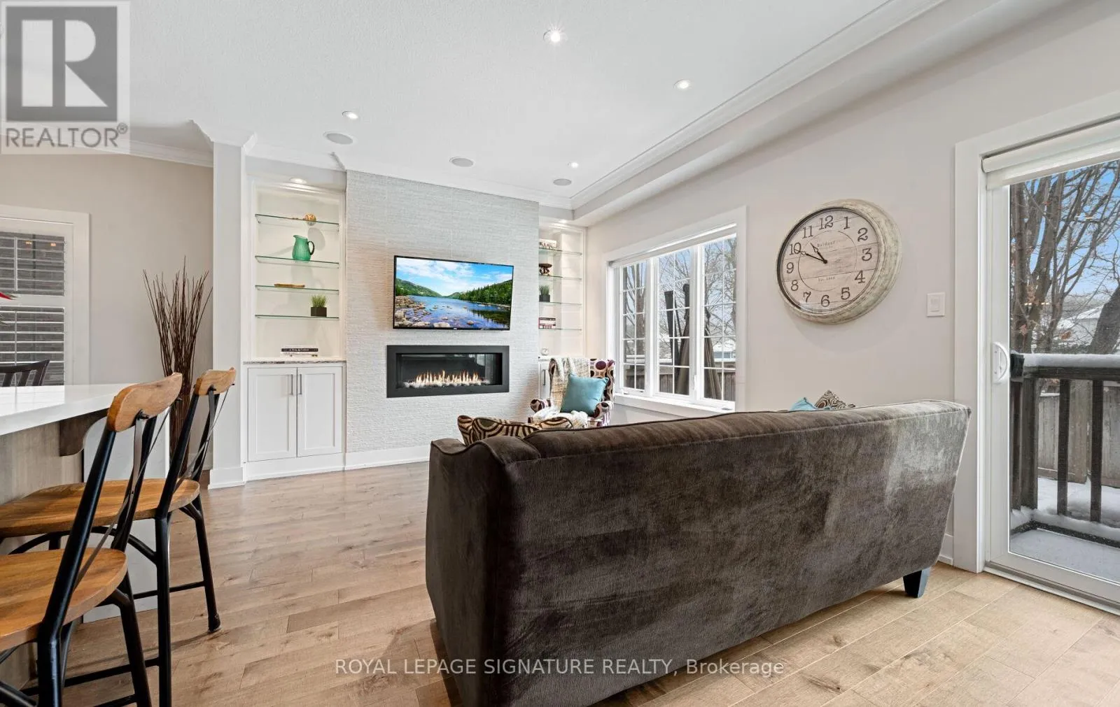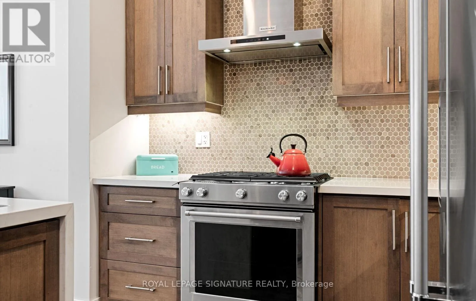 Brant St & Fairview St. Welcome to refined executive living just moments from Downtown Burlington and the vibrant Brant Street corridor. This rare end-unit condo townhouse offers approx. 2,000 sq. ft. of beautifully finished space (1,473 sq. ft. above grade + 527 sq. ft. below), blending upscale design with unmatched urban convenience near the lakefront, boutique shops, dining, Spencer Smith Park, GO Transit, and major highways.The bright, open-concept main level features 9-ft ceilings, rich flooring, designer lighting,and expansive windows that maximize natural light-an advantage of the premium end-unit location. The chef-inspired KitchenAid kitchen impresses with custom cabinetry, a waterfall quartz island, and a 5-burner gas range, all flowing into the elegant dining and living areas.A striking stone gas fireplace with custom built-ins, a convenient 2-piece powder room, and whole-home audio with integrated home theatre elevate the space for everyday comfort and high-end entertaining.Upstairs, three generous bedrooms include a serene primary retreat with walk-in closet and spa-like ensuite. A stylish 4-piece main bath and second-floor laundry add to the thoughtful executive design.The fully finished lower level extends the lifestyle with a refined recreation room featuring wood-look flooring, LED pot lights, frosted glass doors, and a spa-inspired 3-piece bath with heated floors-ideal for a media room, office, gym, or guest suite.Smart home upgrades include Lutron lighting and Google Nest controls, providing modern comfort and efficiency.Set within a top-rated school district and close to parks, trails, and Burlington's signature waterfront, this home delivers the perfect blend of luxury, location, and lifestyle-ideal for professionals, downsizers, and families seeking executive living near Burlington's most coveted amenities. (id:27476)