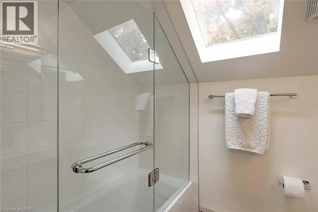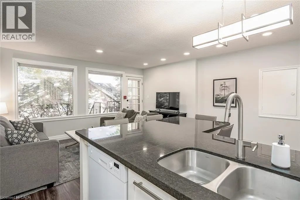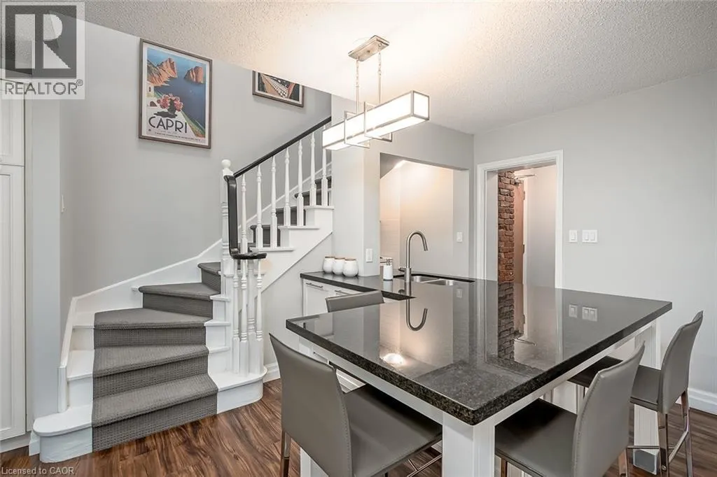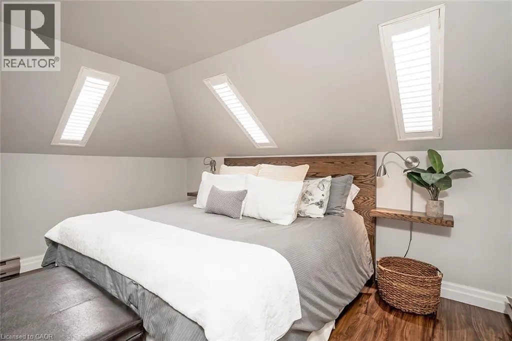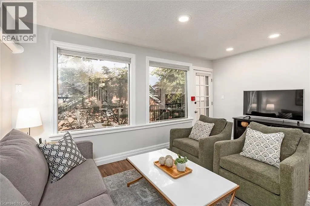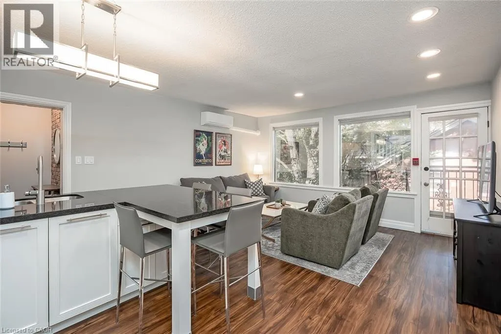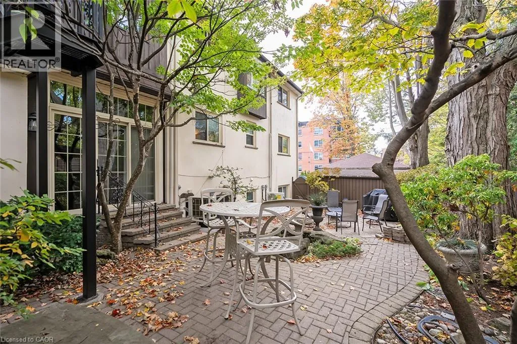Lakeshore Rd to Burlington Ave. This charming and cozy 1-bedroom, 1-bath, two storey (loft) suite located in a historic boutique building, just one block from the lake and Spencer Smith Park. Furnished or unfurnished, this bright and spacious suite offers a welcoming open-concept layout featuring a comfortable living space and modern kitchen with white cabinetry, granite counters, peninsula with seating for 4 and ample pantry storage. The living room includes large sofa, swivel chairs and Smart TV overlooking the private courtyard with mature gardens, shared BBQ and outdoor seating. Upstairs youâll find a serene primary bedroom with neutral colour palette, skylights, nightstands, and two walk-in closets, plus a cozy office nook and additional seating area. The spa-inspired bathroom includes a glass shower/tub combination and modern vanity. Additional features include shared coin laundry on the lower level and 1 dedicated parking space. Ideally located steps from Burlingtonâs waterfront, Spencer Smith Park, boutique shops, restaurants, and major highways (QEW, 403, 407) as well as the GO station. A 1-year lease is preferred. No smoking, no pets. (id:27476)
