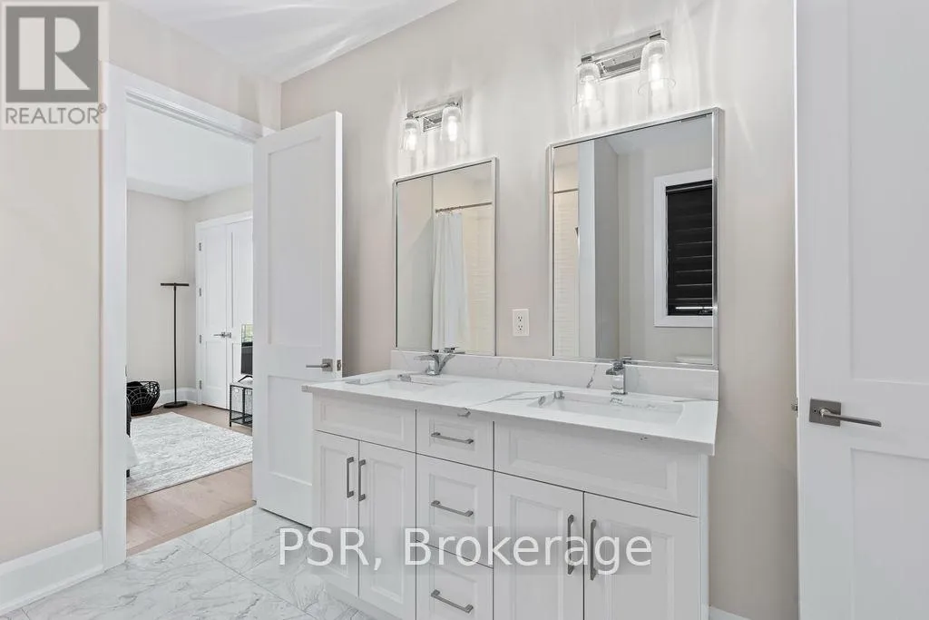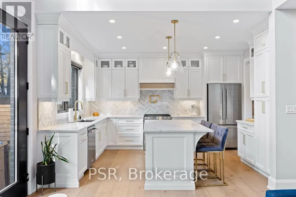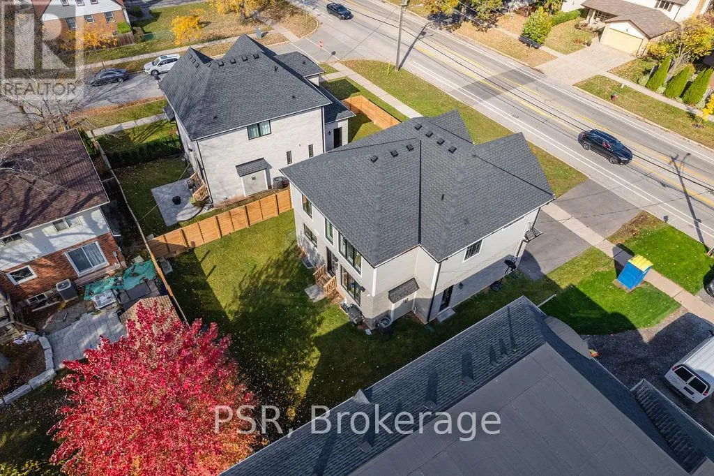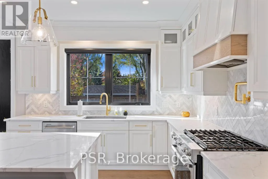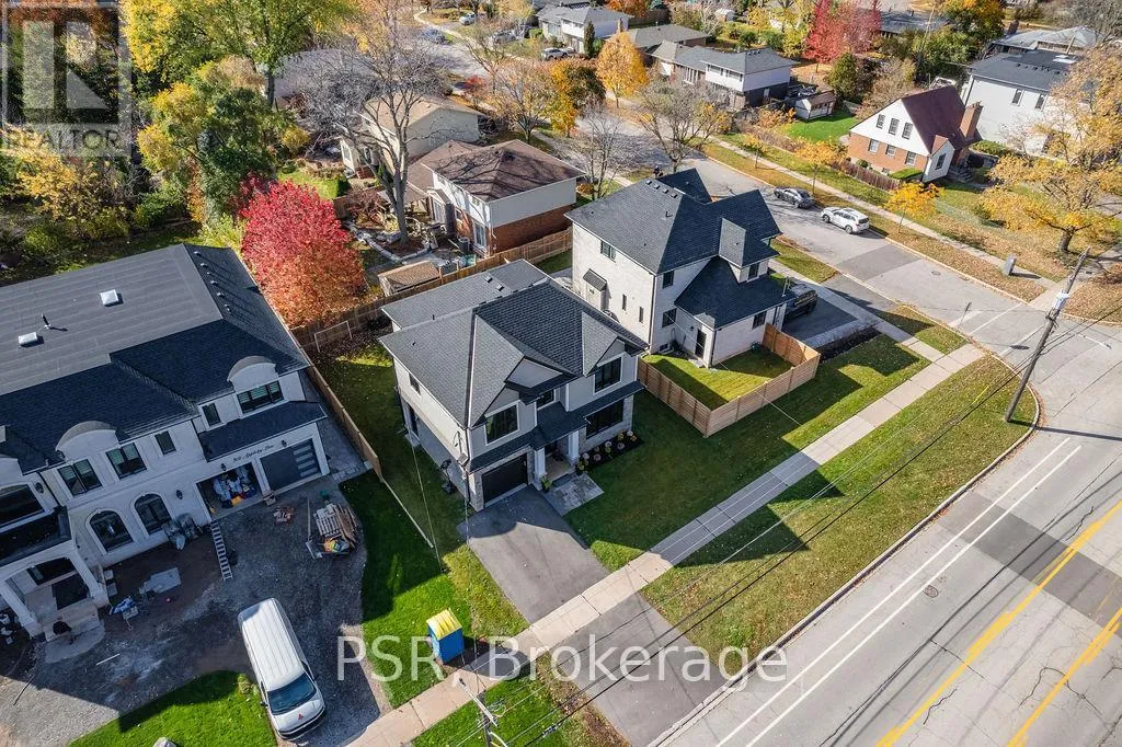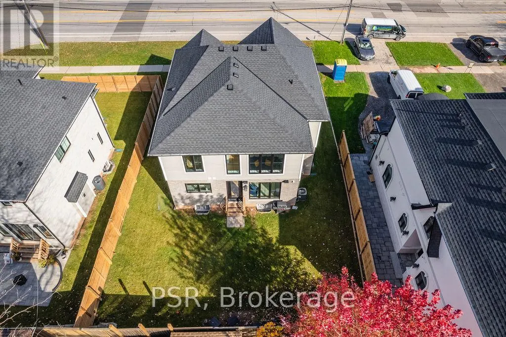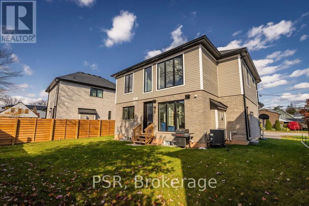 Appleby Line and Sylvana Cres Exceptional, custom-built home only 2 years new, located in the highly sought-after Shoreacres neighbourhood. This impressive 2-storey residence offers 3+1 bedrooms, 3.5 bathrooms and approx. 2,250 sq. ft. of living space plus a fully finished lower level. The main floor features a spacious foyer leading to a formal dining room with coffered ceilings and a convenient servery. The gourmet kitchen includes a large island, quartz counters, stainless steel appliances, custom white cabinetry and a beautiful backsplash. It opens to a bright family room with a soaring 2-storey ceiling, gas fireplace with feature wall and walkout to the backyard. A stylish powder room and functional mudroom with garage access complete the level. Upstairs are 3 generous bedrooms, including a primary suite with a large walk-in closet and spa-like 4-piece ensuite. The 5-piece main bath offers dual sinks and shared access for the additional bedrooms. Bedroom-level laundry provides added convenience. The fully finished lower level includes a 4th bedroom, spacious rec room, wet bar, 3-piece bath and ample storage. Exterior highlights include a 4-car driveway, irrigation system, excellent curb appeal and a large private backyard. Additional features: wide-plank engineered flooring on the main and upper levels, 9-ft smooth ceilings and pot lights throughout (id:27476)