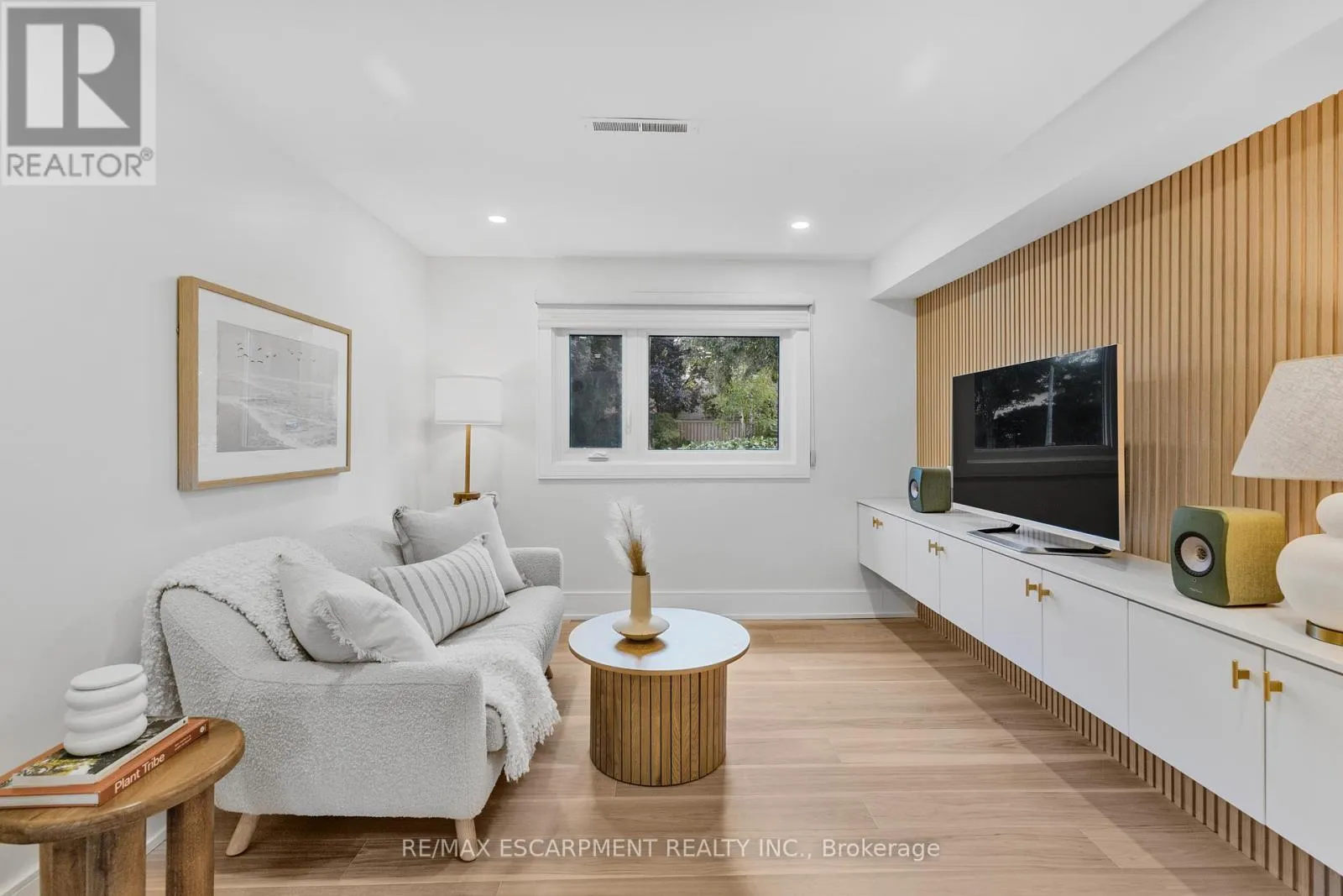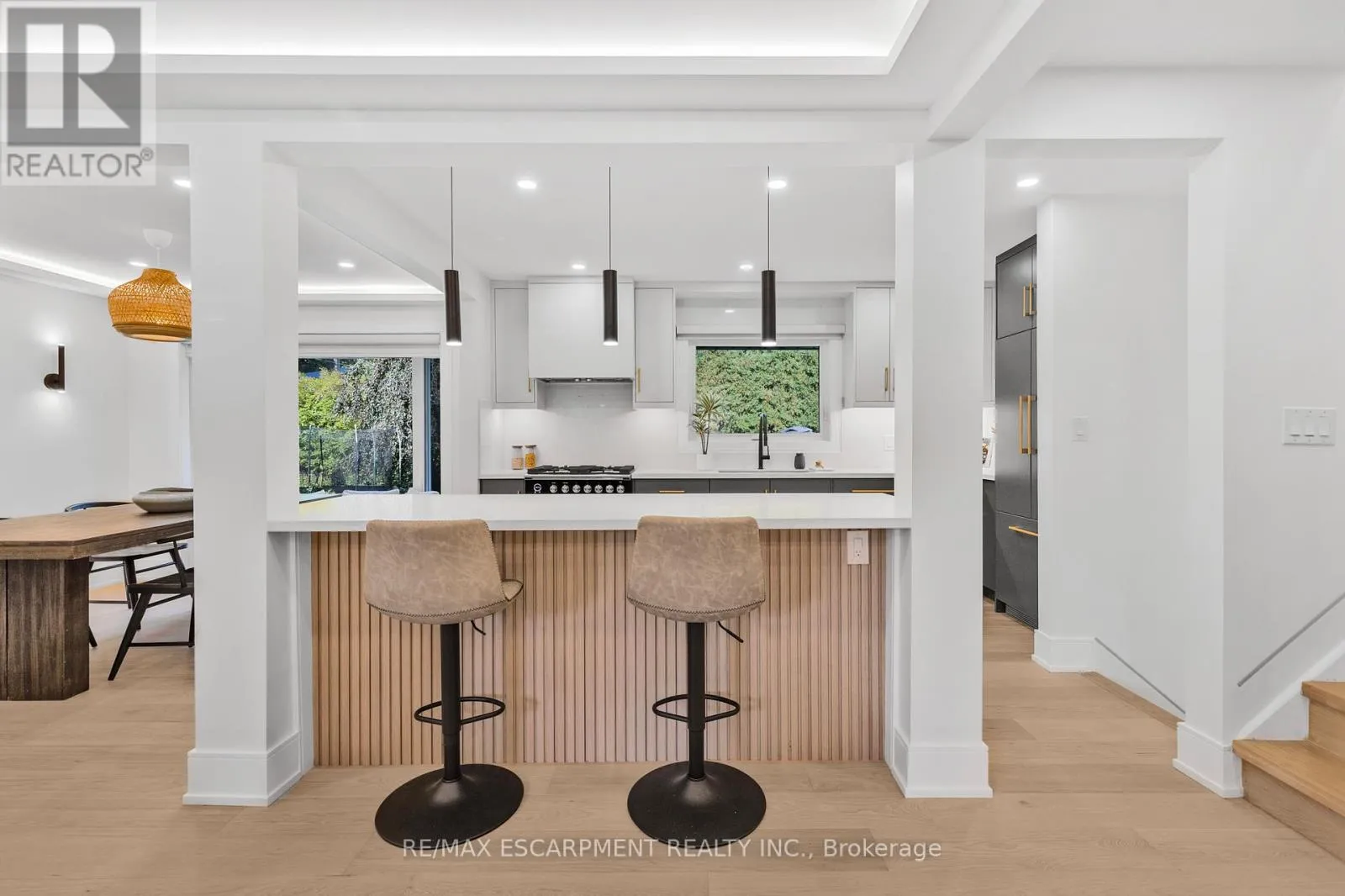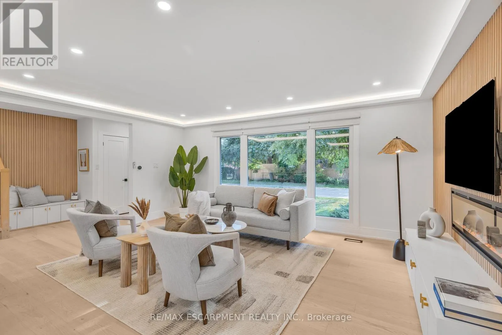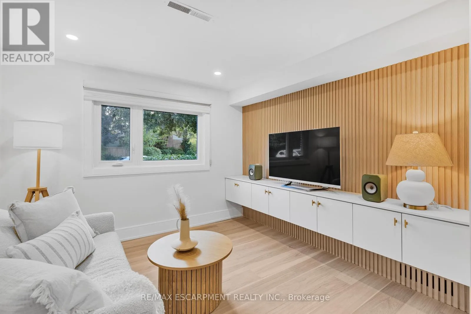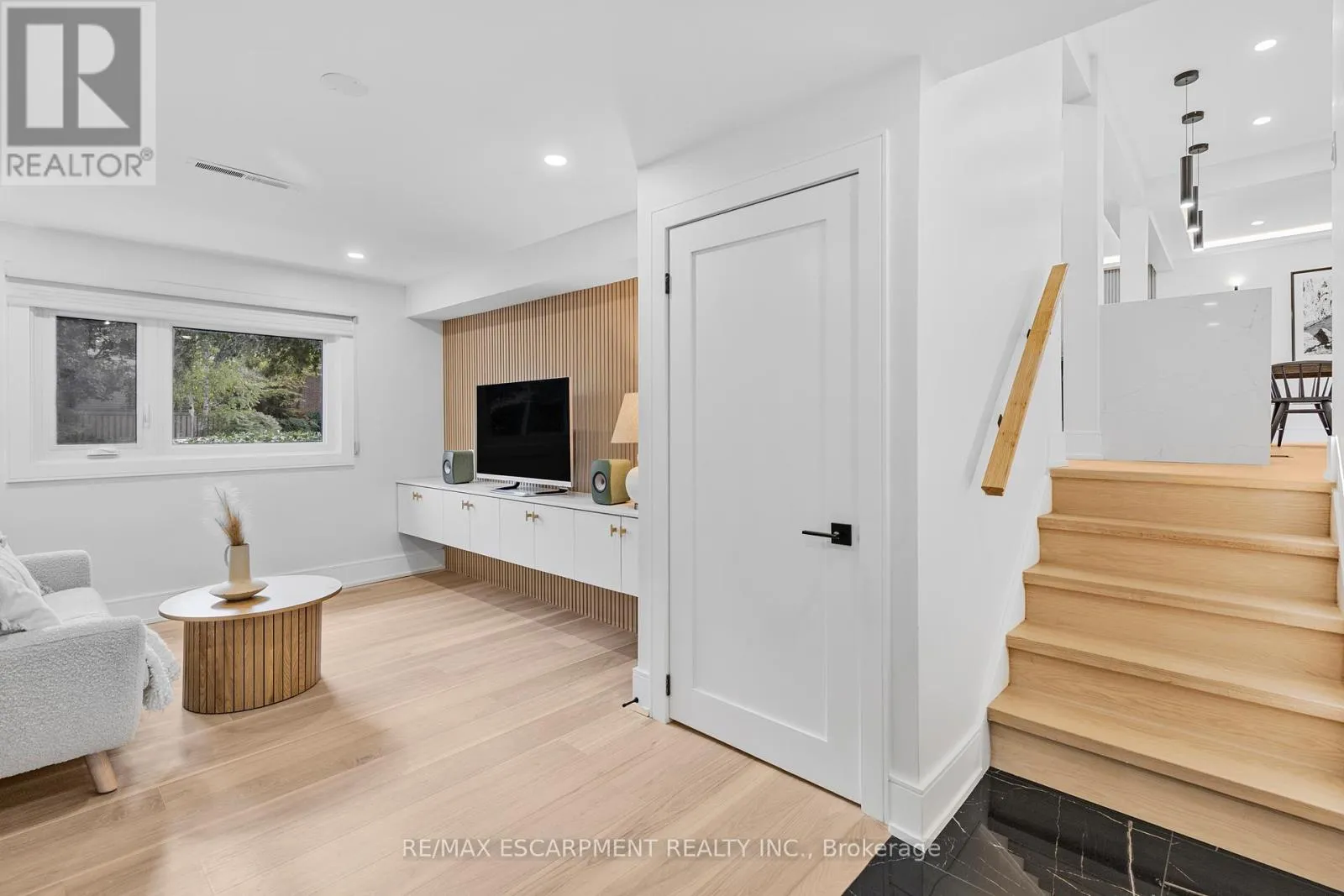 Cross Streets: LAKESHORE ROAD/WALKERS LINE. ** Directions: Lakeshore Road or Spruce Avenue to Strathcona Drive. Welcome to this updated family home in the heart of Shoreacres. RECENTLY ADDED JACK-AND-JILL BATH ON UPPER LEVEL and updated throughout in 2024 with over 2000 square feet of finished living space, this home has been transformed with custom finishes throughout. The open-concept main floor is greeted by a functional entrance with custom built-ins and storage (including closet with bench) that lead into the living room, dining area, and kitchen. The kitchen features paneled Fisher & Paykel appliances, a waterfall quartz island with seating, and sleek cabinetry offering ample counter and storage space. Upstairs, you'll find three spacious bedrooms , all with their own private ensuites. The lower levels extend your living space with two family/rec rooms, wet bar area, and in-wall wiring ready for a home theatre setup - ideal for movie nights or a teen hangout space. This level also includes a fourth bedroom with a 4-piece ensuite, perfect for teens, extended family, and guests. Updates include engineered hardwood floors, fluted feature walls, built-in fireplace, custom and motorized blinds, and integrated wall lighting, newer windows throughout, refreshed landscaping, garage door (2025), & owned hot water heater. Just steps to the lake, this is an opportunity to move into a turnkey, designer-finished home in a true family-friendly neighbourhood. Welcome to one of South Burlington's most sought-after neighbourhoods, known for its top-rated schools, parks, and strong community feel. (id:27476)