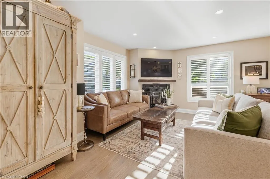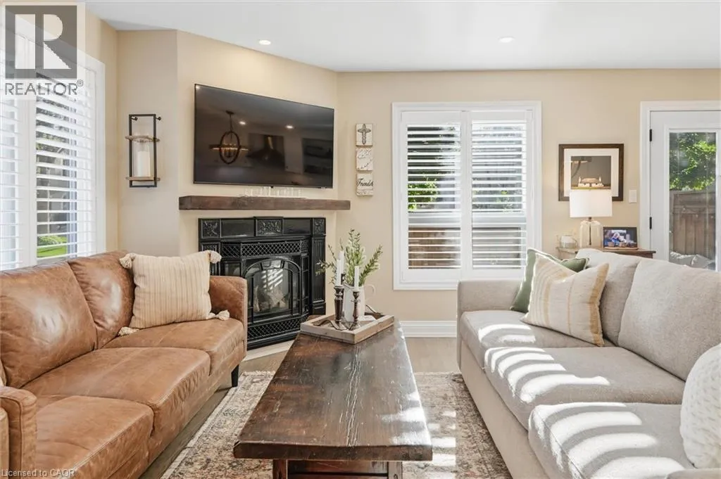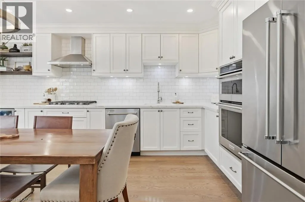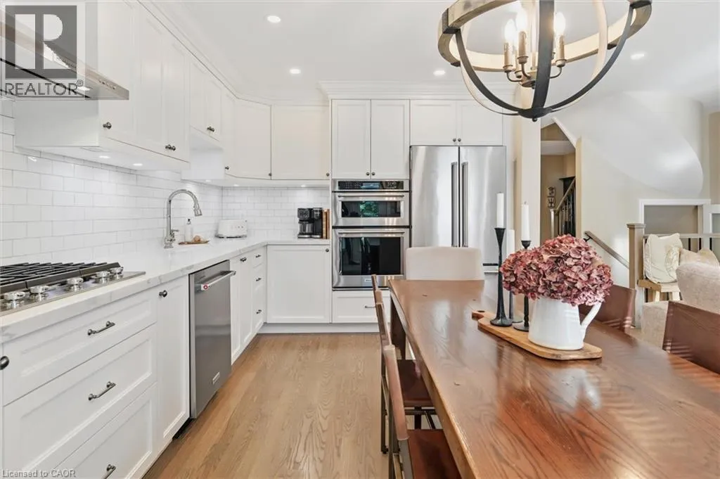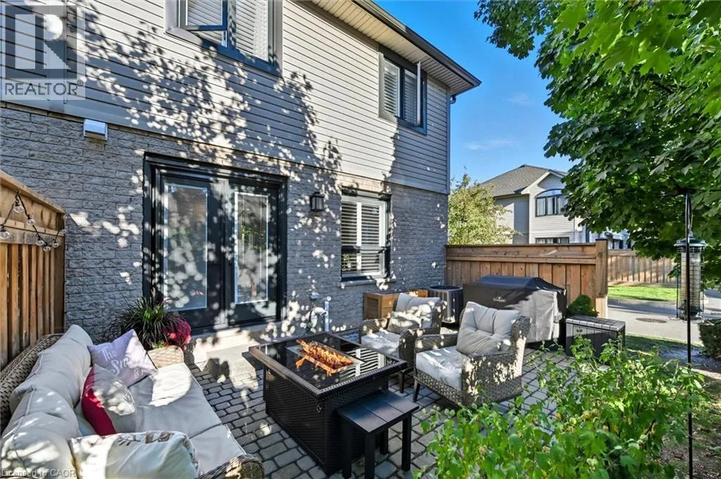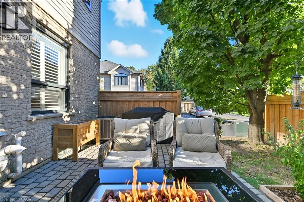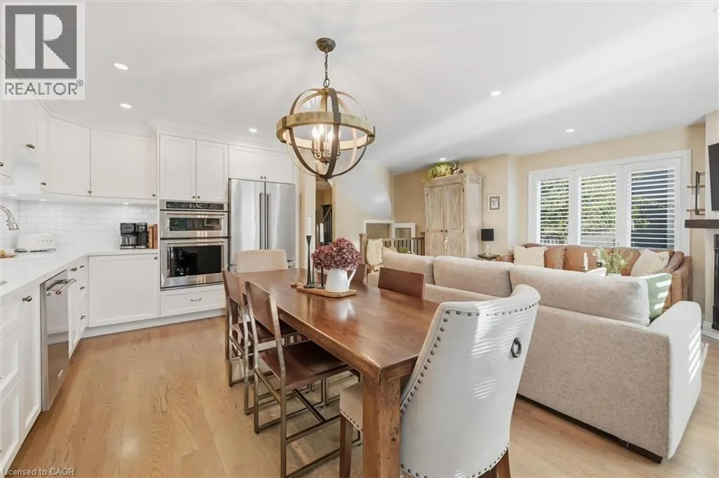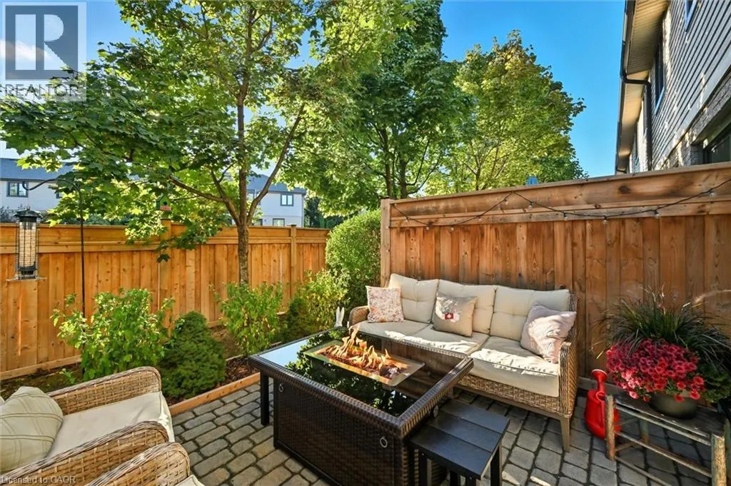Upper Middle to Headon Rd Welcome to this beautifully updated End-Unit townhome in sought-after Headon Forest. Perfect for the busy professional or those looking to downsize. This home combines timeless style, modern upgrades, and maintenance-free living just minutes from parks, shops, restaurants, and major commuter routes. Step inside to discover a fully renovated kitchen with an elegant extension featuring granite counters, gas cooktop, built-in oven/microwave combo, range hood, bar fridge, and under-cabinet lighting designed for entertaining and everyday ease. The open-concept main floor offers refinished hardwood floors, modern pot lighting, California shutters, and an inviting dining and living area that opens to a private, extended patio with upgraded stonework and a natural gas line for outdoor cooking. Upstairs, youâll find three spacious bedrooms with new hardwood throughout, a spa-inspired main bath with stand-alone soaker tub, and a renovated two-piece powder room on the main level. Attention to every detail, updated interior doors and hardware, upgraded ceramic tile, a custom stair runner, all new exterior windows, doors, eaves and downspouts, plus patio doors with glass-enclosed blinds. Enjoy the convenience of two-car parking in the driveway, ample visitor parking nearby, and the peace of mind that comes with a maintenance-free exterior. This exceptional property delivers style, substance, and a prime Burlington location move right in and start living! (id:27476)