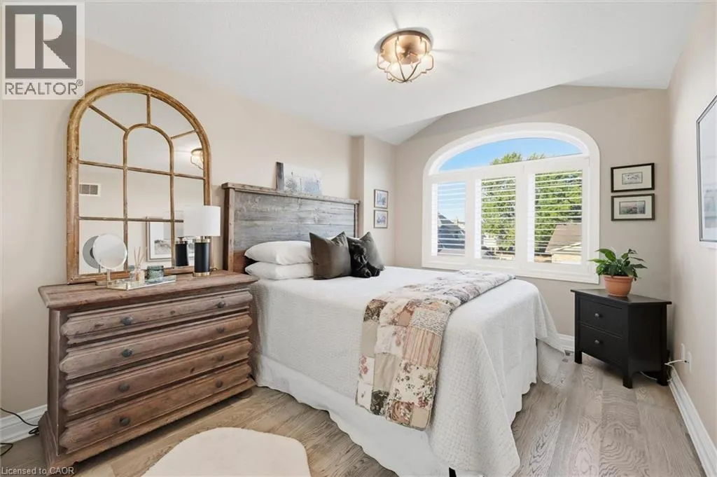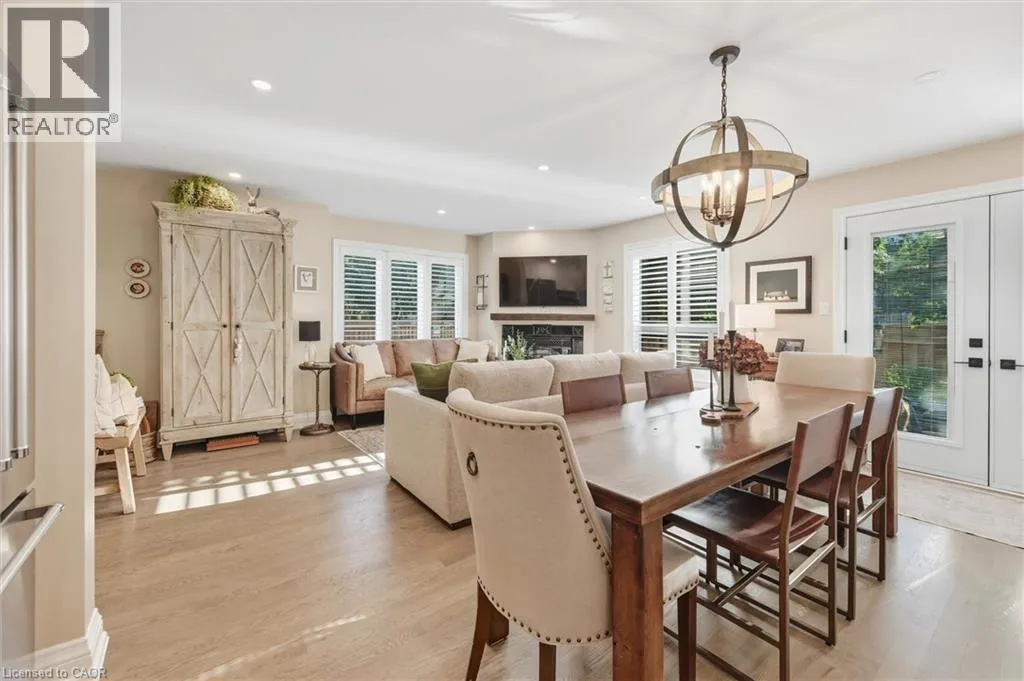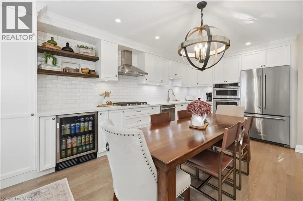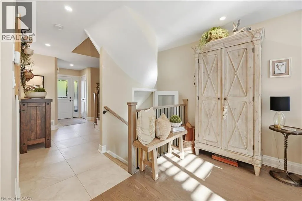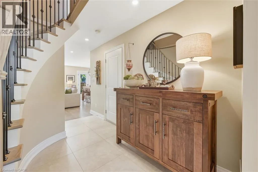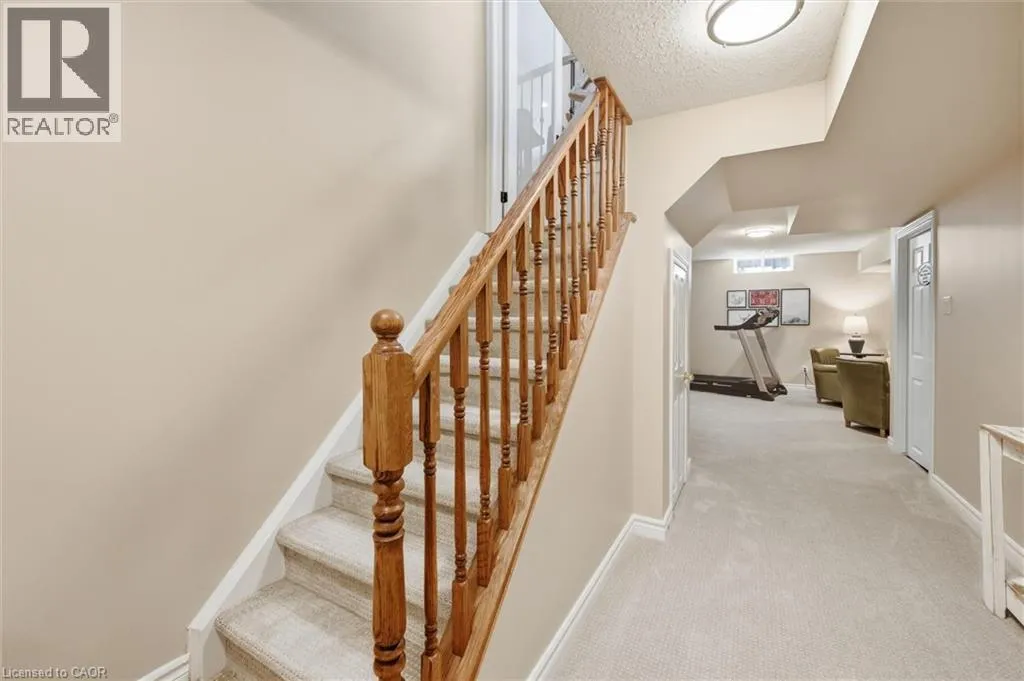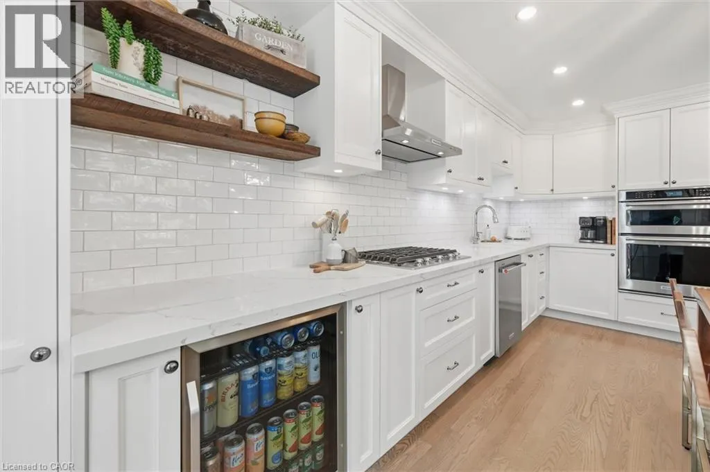 Upper Middle to Headon Rd Welcome to this beautifully updated End-Unit townhome in sought-after Headon Forest. Perfect for the busy professional or those looking to downsize. This home combines timeless style, modern upgrades, and maintenance-free living just minutes from parks, shops, restaurants, and major commuter routes. Step inside to discover a fully renovated kitchen with an elegant extension featuring granite counters, gas cooktop, built-in oven/microwave combo, range hood, bar fridge, and under-cabinet lighting designed for entertaining and everyday ease. The open-concept main floor offers refinished hardwood floors, modern pot lighting, California shutters, and an inviting dining and living area that opens to a private, extended patio with upgraded stonework and a natural gas line for outdoor cooking. Upstairs, youâll find three spacious bedrooms with new hardwood throughout, a spa-inspired main bath with stand-alone soaker tub, and a renovated two-piece powder room on the main level. Attention to every detail, updated interior doors and hardware, upgraded ceramic tile, a custom stair runner, all new exterior windows, doors, eaves and downspouts, plus patio doors with glass-enclosed blinds. Enjoy the convenience of two-car parking in the driveway, ample visitor parking nearby, and the peace of mind that comes with a maintenance-free exterior. This exceptional property delivers style, substance, and a prime Burlington location move right in and start living! (id:27476)
