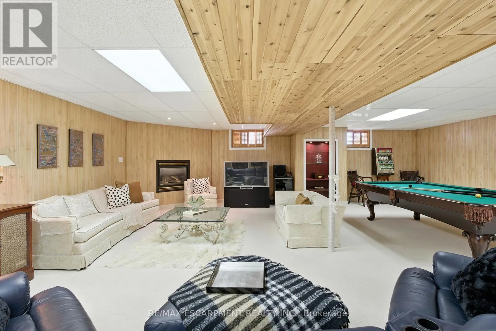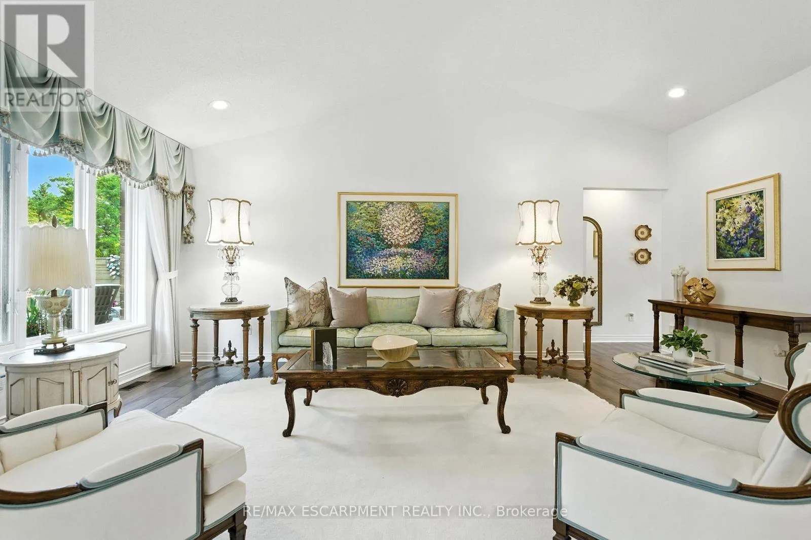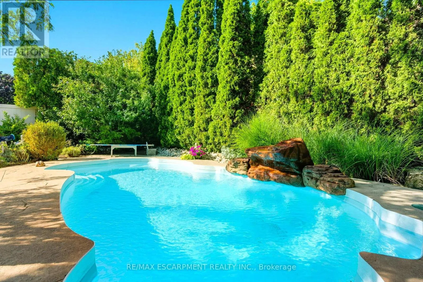 N Service Rd to Skyview Dr to Colton Way Welcome to this beautiful 1872 square foot bungalow on one of the most desirable streets in Tyandaga. Located close to all amenities and with easy highway access, this home combines tranquility with convenience. With fantastic curb appeal, this home welcomes you with its classic charm. Step inside to the wide-open great room, featuring vaulted ceilings and massive windows that fill the space with natural light. The kitchen boasts solid-surface countertops and a convenient walk-out to the yard, making outdoor entertaining a breeze. The main level features a master retreat complete with a walk-in closet, a fourpiece ensuite, and a private walk-out to the yard. A spacious second bedroom and a den (easily converted into a third bedroom) provide plenty of space for family or guests. The fully finished basement offers a huge rec room, perfect for movie nights or family gatherings. You'll also find a dedicated hobby room, ample storage, and a three-piece bathroom. Outside, the spectacular and extremely private backyard is your personal oasis. Surrounded by mature trees, it features an inground pool and multiple seating areas, creating the perfect setting for summer fun and relaxation. RSA. (id:27476)