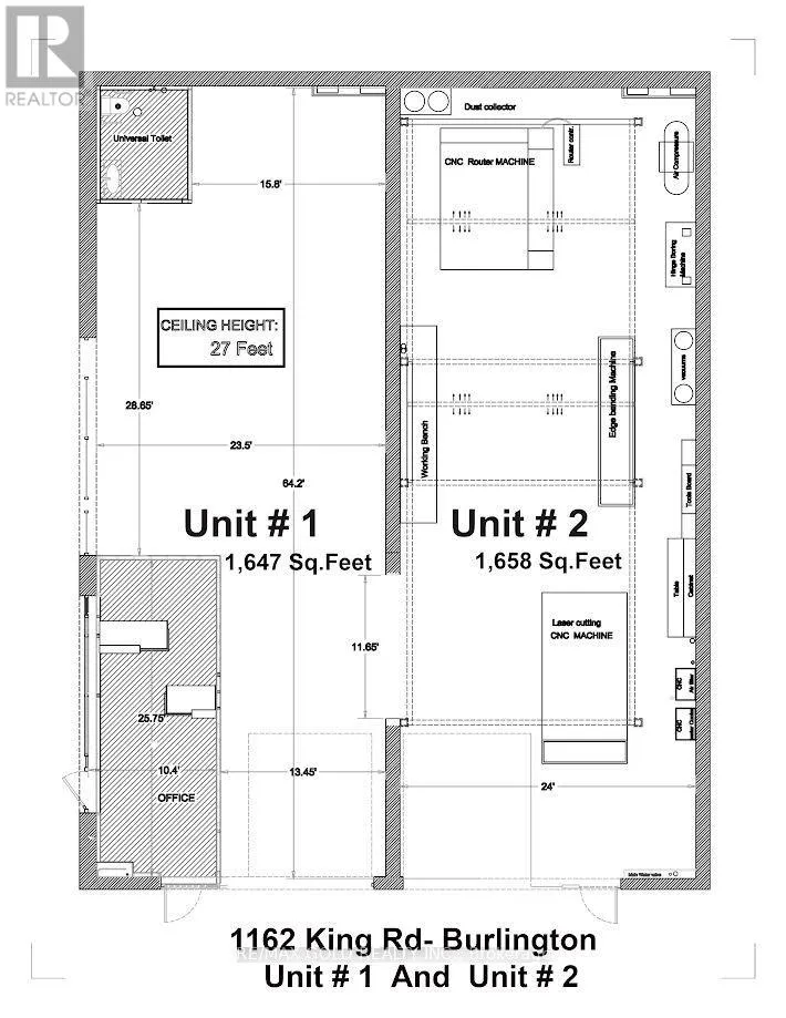 Plains Rd & King St Location-Location-Location, corner units located on a main street, at the main andthe only entrance of a commercial/Industrial condominium located in a hot SpotNext to BURLINGTON IKEA on the KING's RD side, These attached 2 Units arecombined with an opening in between to function as 1 Unit with a total are of3,305 Square feet but still with separated DEEDs, with a BC1-471 zoning whichallows a variety of USE for many kinds of businesses, fully furnished with HVAC,Sewage, epoxy flooring, water proof walls painting, well distributed Powersupplies 2PH and 3Phase electricity, Including a fully furnished 230 Sq.F Office anda Universal ToiletA less than 3 years old fully equipped Millwork machineries legally permitted setup with $ 120,000 Value Can also be Added to the price (Optional) (id:27476)