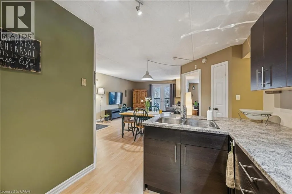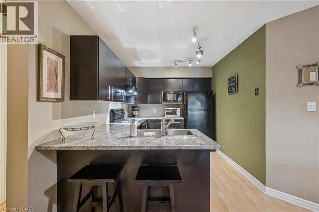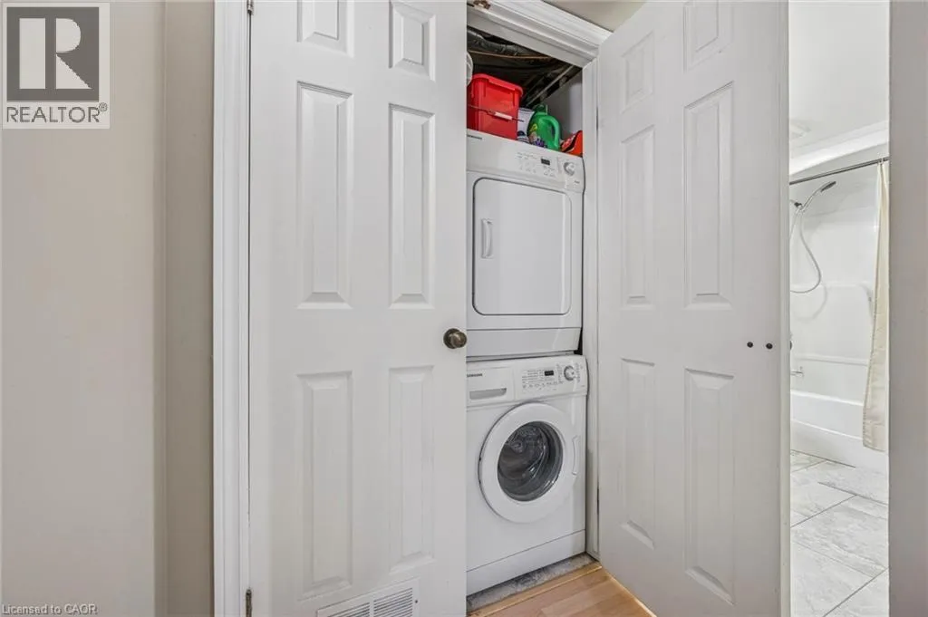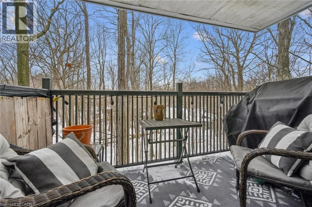 Upper Middle and Cleaver Great value! Discover this 2 bedroom 1 bath condo with rare private forest-facing balcony in Burlingtonâs sought-after Forest Chase community in the heart of Headon Forest. The bright, open-concept living space includes a dining area, and features light laminate flooring, upgraded trim and casings and is painted in modern neutral colours. The modern and upgraded kitchen features dark hardwood-style cabinets, a built-in range hood, and an overhanging counter for a convenient breakfast bar. The spacious primary bedroom has a double closet and a large picture window overlooking the treetops. The 2nd bedroom also includes a large window and closet. The custom-refinished 4 pc bathroom features quartz counters, ceramic floors, a clean vinyl surround tub & shower insert, lots of cabinet space and modern floor and under-cabinet lighting acting as perfect night-lights. The bright living area walks out to a private balcony that faces west and gets the afternoon sun, beautiful views of a quiet forested ravine, and gorgeous sunsets in the winter months. And there is ample space for chairs and a BBQ. Other features include a new bedroom window, new French balcony door and front door, newer balcony railing, a hideaway stacked washer/dryer closet and stylish overhead lights. A large locker is included and the underground parking space is privately owned. Great location in central Burlington, close to shopping, parks and highway access! (id:27476)