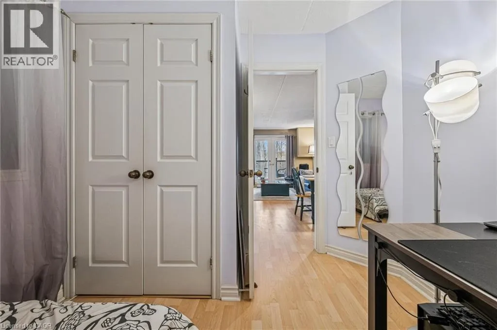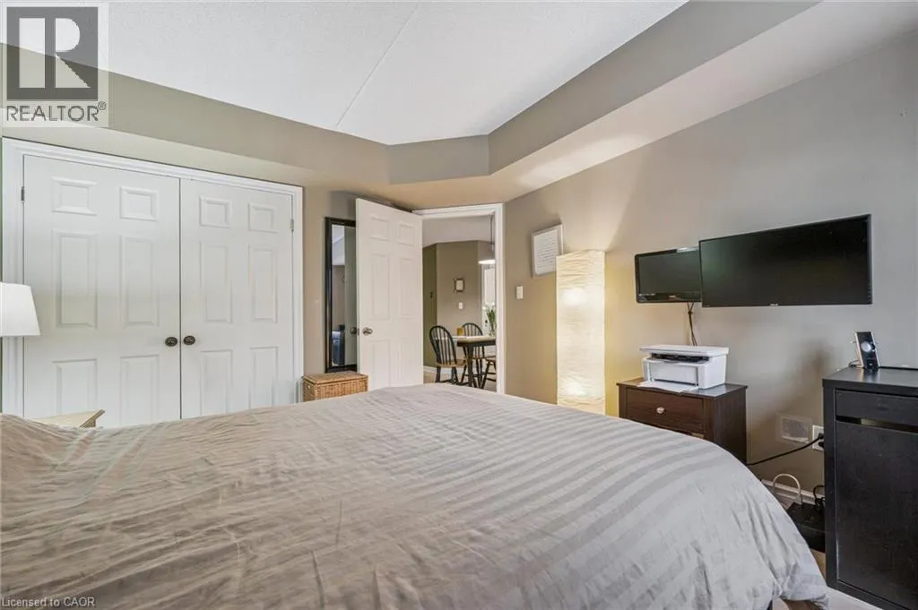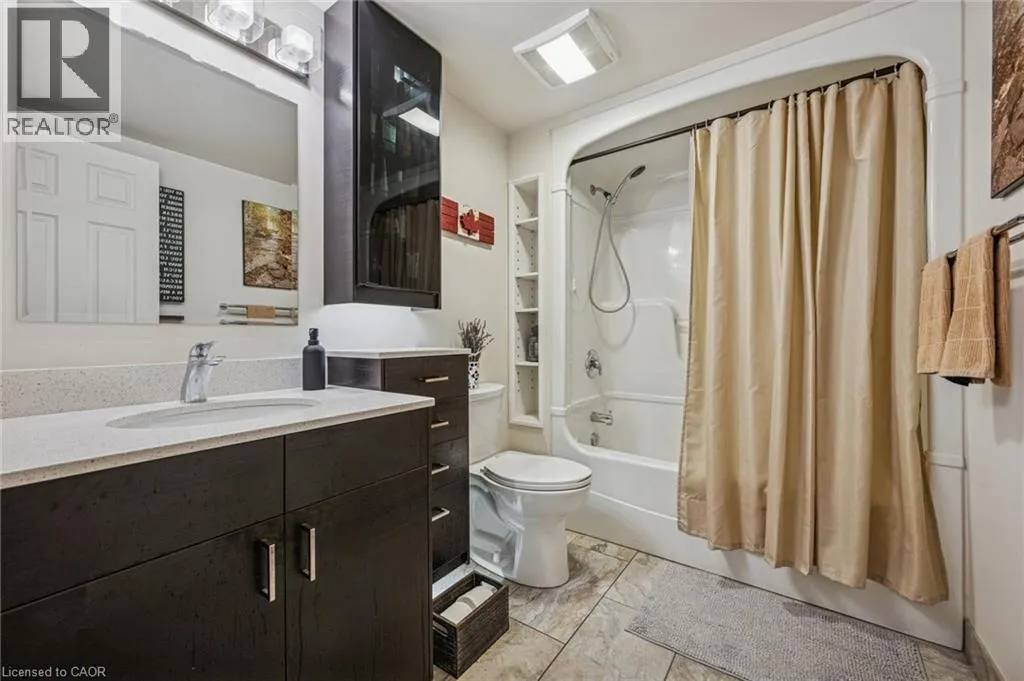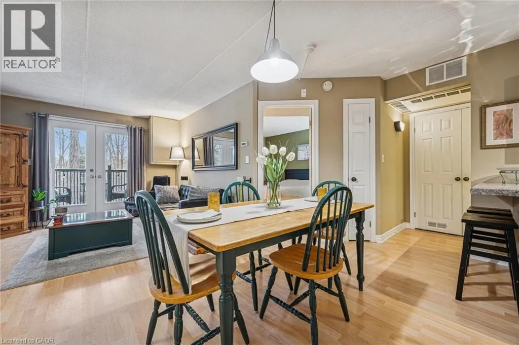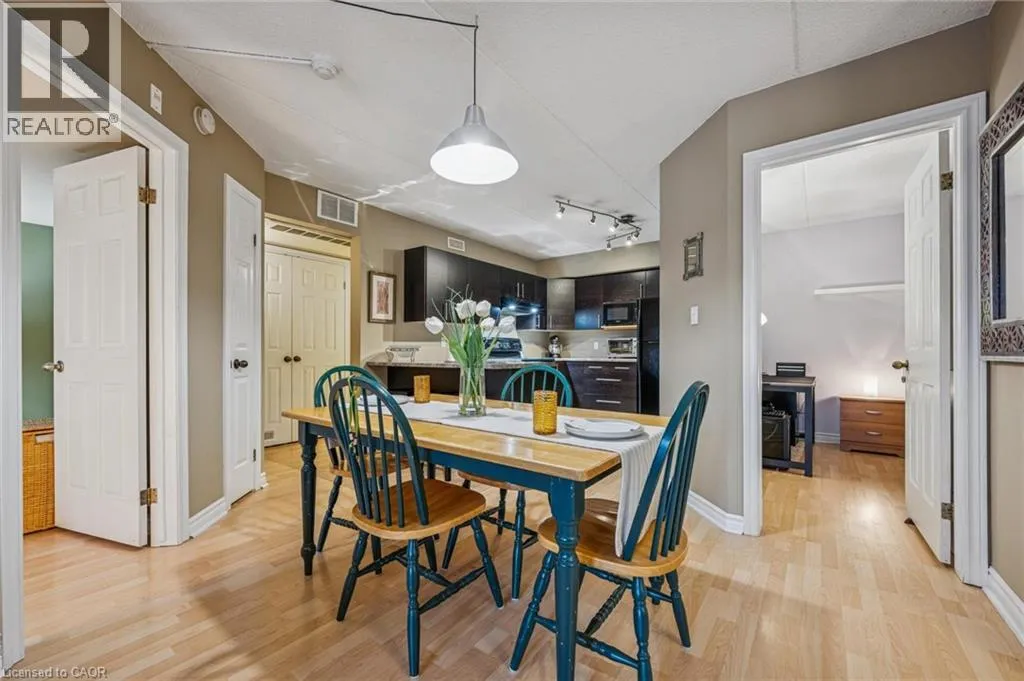 Upper Middle and Cleaver Great value! Discover this 2 bedroom 1 bath condo with rare private forest-facing balcony in Burlingtonâs sought-after Forest Chase community in the heart of Headon Forest. The bright, open-concept living space includes a dining area, and features light laminate flooring, upgraded trim and casings and is painted in modern neutral colours. The modern and upgraded kitchen features dark hardwood-style cabinets, a built-in range hood, and an overhanging counter for a convenient breakfast bar. The spacious primary bedroom has a double closet and a large picture window overlooking the treetops. The 2nd bedroom also includes a large window and closet. The custom-refinished 4 pc bathroom features quartz counters, ceramic floors, a clean vinyl surround tub & shower insert, lots of cabinet space and modern floor and under-cabinet lighting acting as perfect night-lights. The bright living area walks out to a private balcony that faces west and gets the afternoon sun, beautiful views of a quiet forested ravine, and gorgeous sunsets in the winter months. And there is ample space for chairs and a BBQ. Other features include a new bedroom window, new French balcony door and front door, newer balcony railing, a hideaway stacked washer/dryer closet and stylish overhead lights. A large locker is included and the underground parking space is privately owned. Great location in central Burlington, close to shopping, parks and highway access! (id:27476)