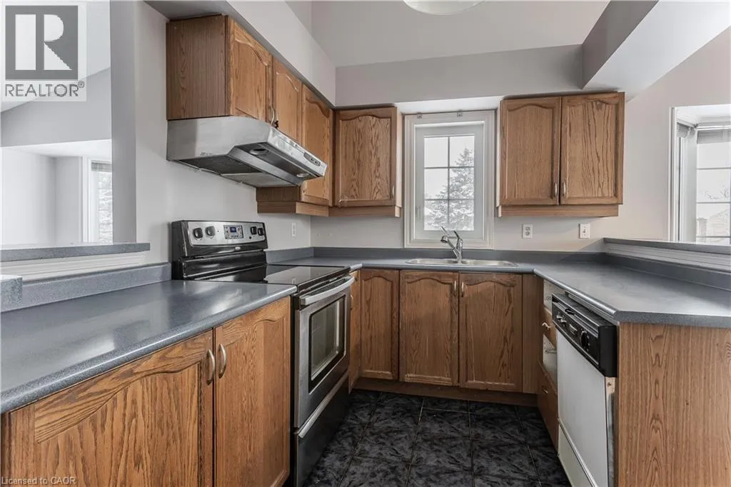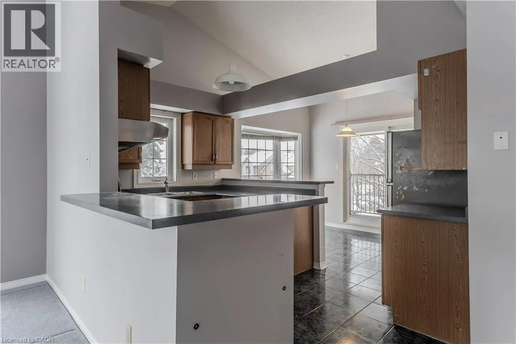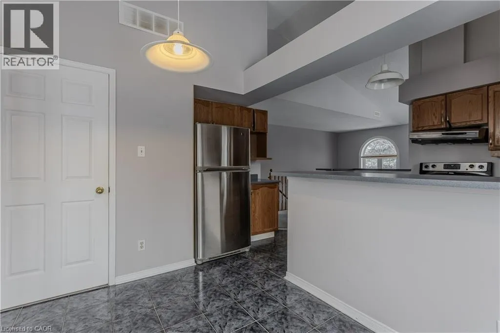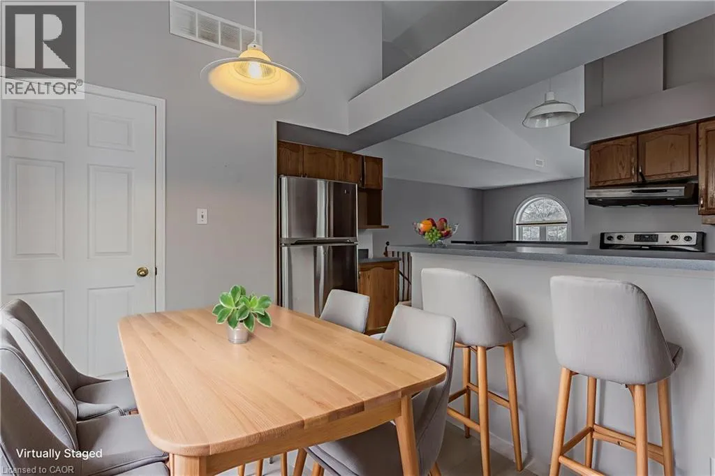 New Street and Woodview Road Welcome to a well-located opportunity in one of south Burlingtonâs most sought-after enclaves. This upper-level, end-unit stacked townhouse is nestled within a quiet, well-maintained community and offers a solid foundation for buyers looking to make a space their own. The single-level layout is functional and family-friendly, with an end-unit configuration that allows for additional natural light and added privacy. The open-concept living area features soaring vaulted ceilings and a large bay window, creating a bright, airy space with plenty of potential to personalize and transform into a warm family hub. The eat-in kitchen is thoughtfully laid out with ample cabinetry, stainless steel appliances, ceramic tile flooring, and a breakfast bar thatâs ideal for busy mornings or casual meals. A dedicated dining area offers space for family dinners, while a walkout leads to a private balconyâperfect for enjoying your morning coffee or winding down at the end of the day. The primary bedroom is generously sized with a bright window, complemented by a second bedroom ideal for a childâs room, nursery, home office, or guest space. A full 4-piece bathroom and in-suite laundry complete the layout. Set close to schools, parks, shopping, transit, and all daily amenities, this home is being offered as-is and presents an excellent opportunity for buyers ready to add their personal touch in a family-friendly neighbourhood they will love to call home. (id:27476)