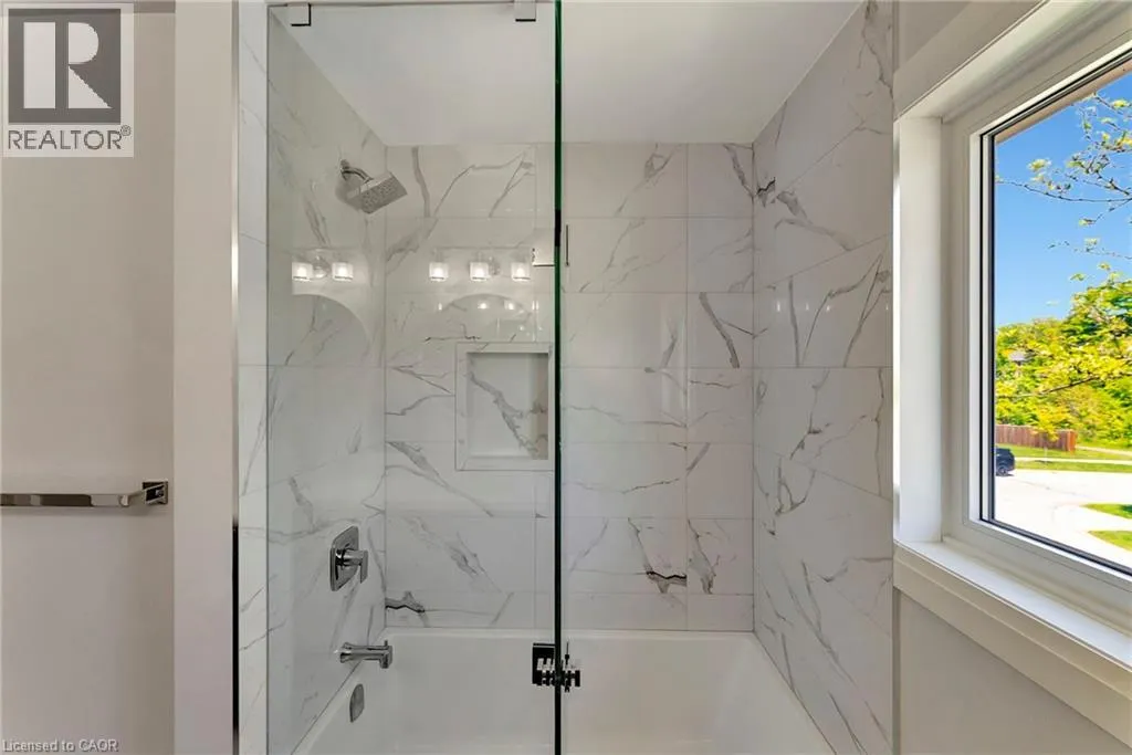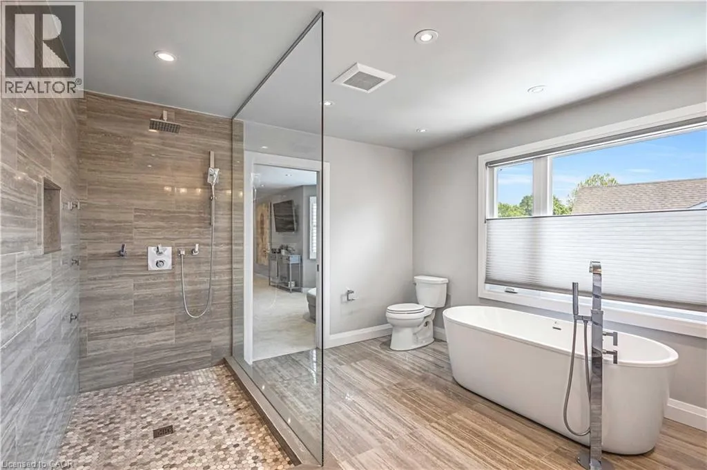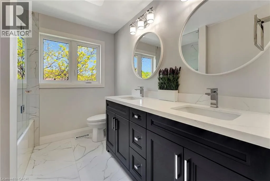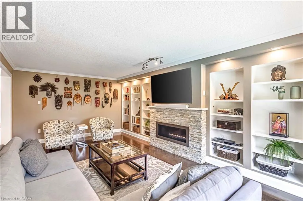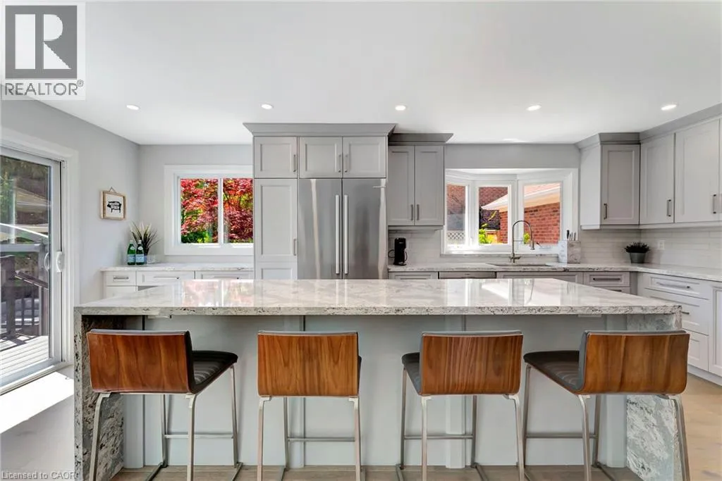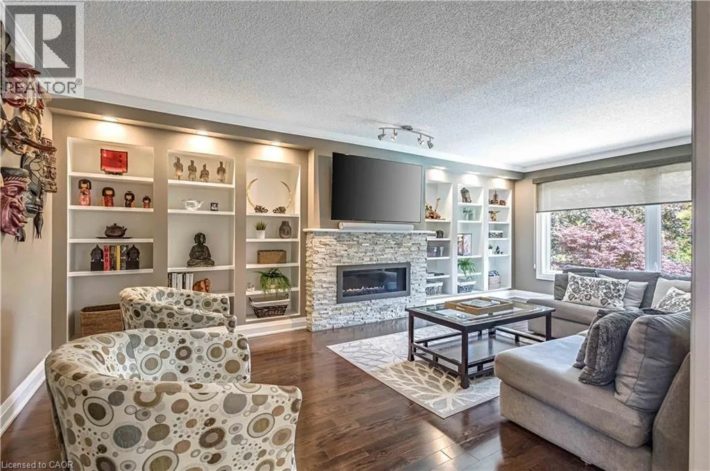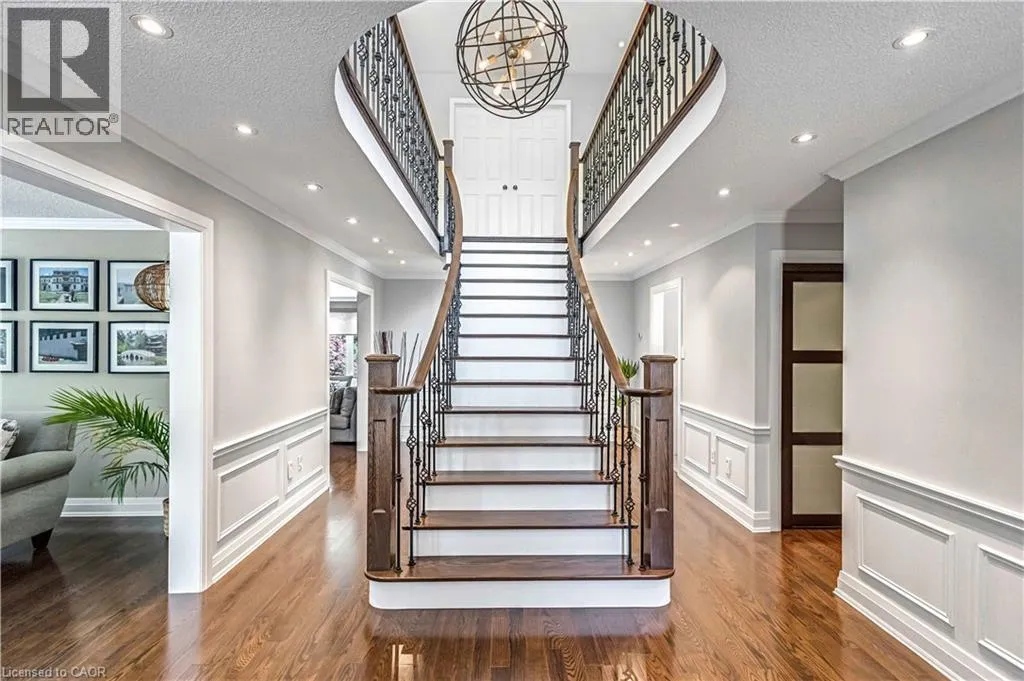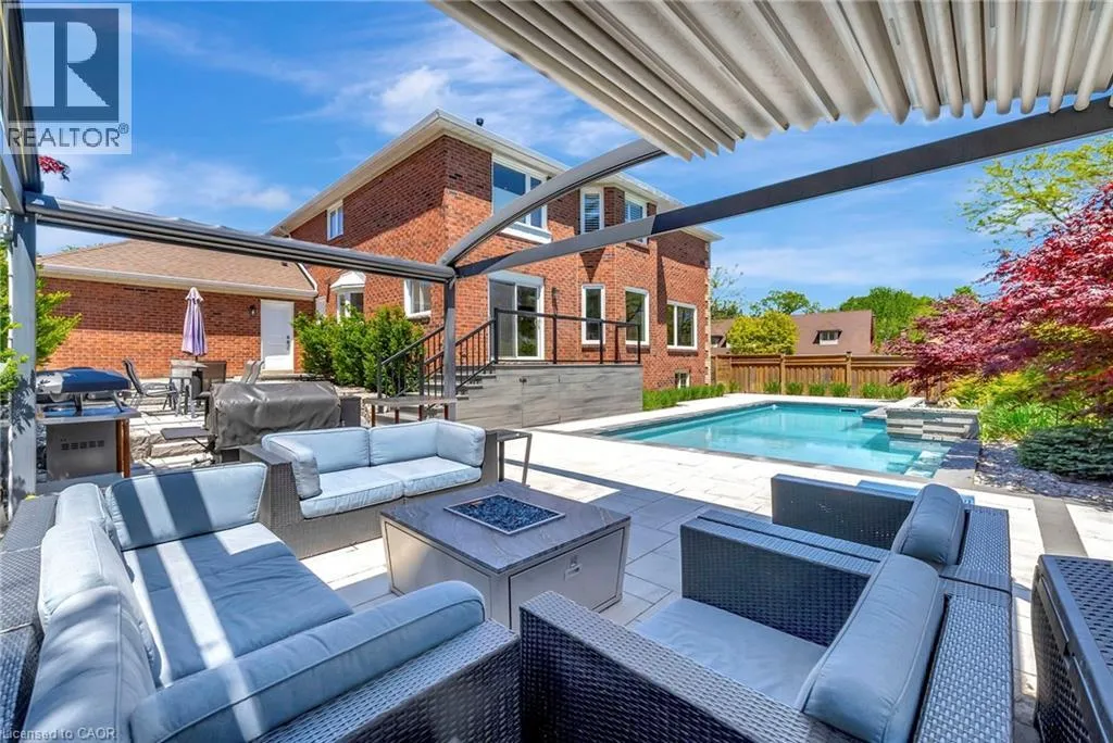 North Service Road to Kerns Road to Winterberry Where timeless elegance meets modern luxury in the heart of Burlingtons prestigious Tyandaga neighbourhood. This fully renovated, four-bed home offers an exceptional blend of sophistication, comfort, and style making it the perfect place to call home. From the moment you arrive, the professionally landscaped front yard sets the tone with its lush perennial gardens, stately armour stones, and inviting stone patio - an ideal spot to enjoy your morning coffee under the shade of mature trees. Step inside to a grand foyer highlighted by a sweeping Scarlett OâHara staircase. The open-concept kitchen/dining area is the heart of this home, designed for both everyday living and elegant entertaining. Featuring a nine-foot island, cocktail bar with beverage fridge. The main floor also offers a cozy family room with custom built-ins and a sleek, stone-surround fireplace, a spacious formal living room perfect for quiet gatherings, and a large office ideal for working from home. A stylish two-piece bathroom and laundry room complete the main level. Upstairs, the luxurious primary suite features a spa-inspired 5-piece ensuite with a large walk-in shower, a cozy reading nook, and two walk-in closets. Three additional generously sized bedrooms and a beautifully renovated 5-piece bathroom complete the upper level. Step out from the kitchen into your private backyard oasis. Relax beneath the modern pergola with retractable roof perfect for enjoying sunshine or shade all season. The showstopper of the yard is the custom saltwater pool, complete with built-in stairs, a sleek stone water feature, and dual waterfalls make for your very own resort-style escape. Additional highlights include a double car garage with inside entry and backyard access, double driveway with ample parking, irrigation system, soffit lighting, hardwood flooring, Lutron SMART lighting system, California shutters, central vacuum, pot lights, and new carpet (2025). Experience luxury living in Tyandaga (id:27476)