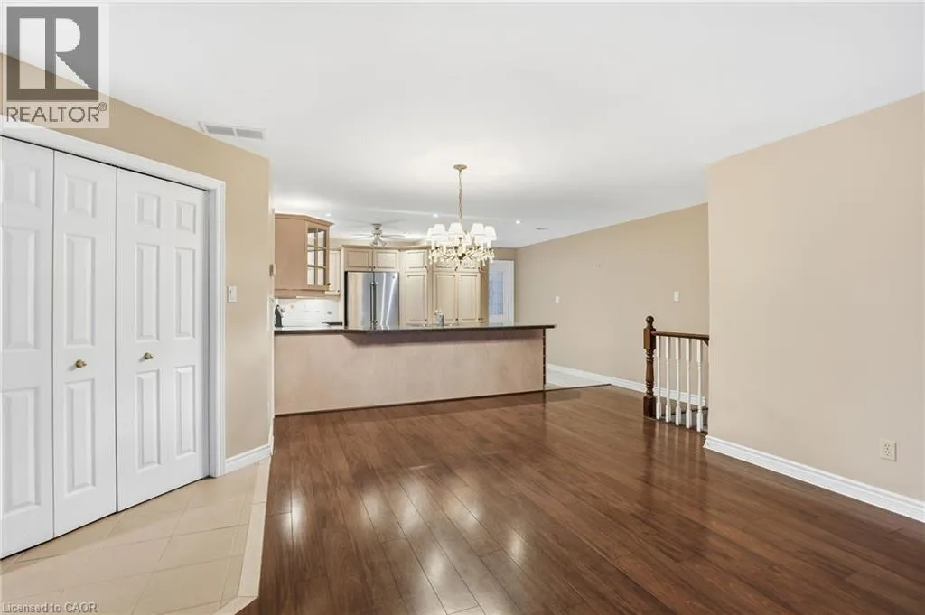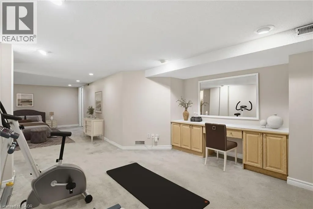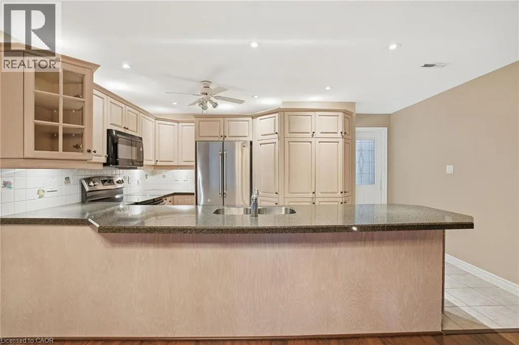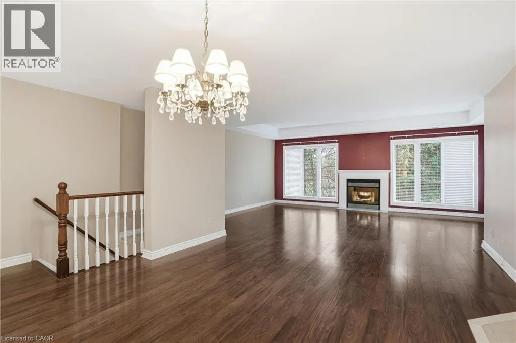 Walkers Line south to New Street BUNGALOW main-floor-living STACKED townhome with spectacular private setting backing onto GREENSPACE with walkout to gazebo and brand-new extended deck. Amazing outdoor privacy tucked away in solitude at the rear of this exclusive complex, yet mere moments from everything, this centrally located, well maintained MAIN LEVEL stacked end unit offers a low maintenance lifestyle for folks who donât want to compromise on size, style or comfort. Snow removal for driveway and steps, landscaping and exterior upkeep are all part of the comprehensive maintenance program; and if freedom to travel is a requirement, this home is completely âLOCK AND LEAVEâ. This unit enjoys a spacious and comfortable open concept living area, easy-care flooring with a multitude of windows that embrace the outdoors, and a lovely GAS FIREPLACE sitting at the heart of it all. The gourmet kitchen features stone counters, breakfast bar, and stainless appliances. Located strategically on the main level is a large primary bedroom with stunning newly finished 3-piece ensuite with granite and marble tile in the huge walk-in shower. A new stackable washer & dryer combo completes âeverything-you-needâ in main level convenience and is adjacent to the DIRECT GARAGE ENTRY. The finished lower level is ready to be claimed as your office, den, gym, or bed-sitting room with 3 pc ensuite, large shower and AMPLE STORAGE throughout. There is a sump pump with battery back-up in the unit for moisture/flood security. Features include windows and doors (â25), Ensuite bath (â23), Washer/Dryer (â25), newer high-efficiency furnace and A/C (2015 approx), and gazebo plus retractable awning. This unique home is walking distance to restaurants, cafes, shopping, banks, library, park, the WATERFRONT, and great access to highways 407, QEW, 403 and 401. Simply, a location with convenience that cannot be beat. Please note some photos are virtually staged. All inclusions in 'as in' condition. (id:27476)