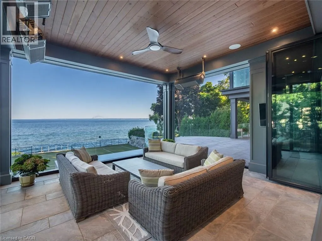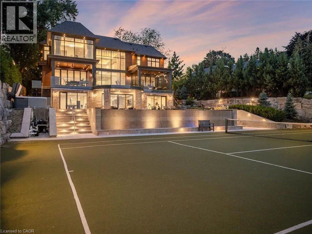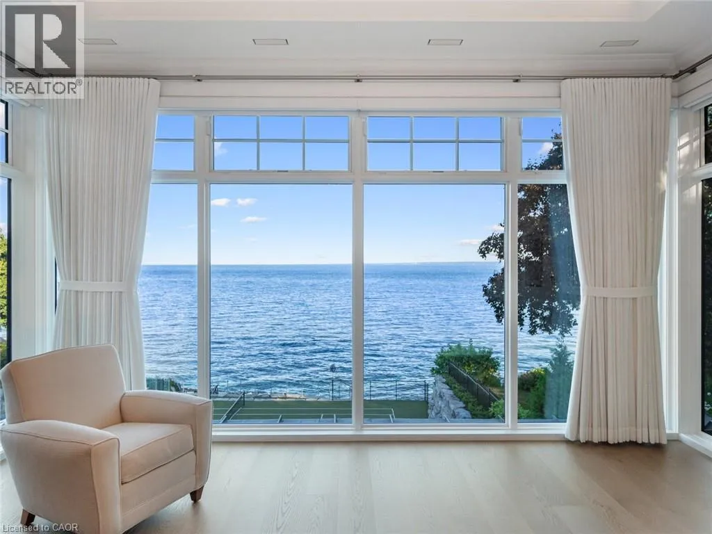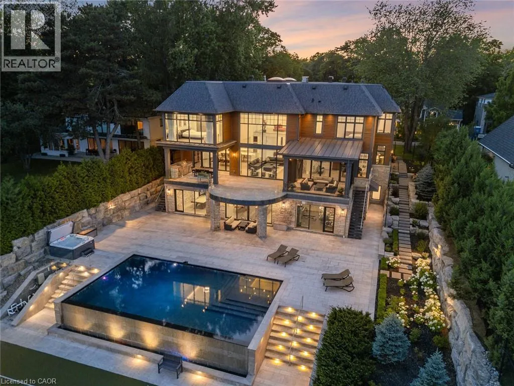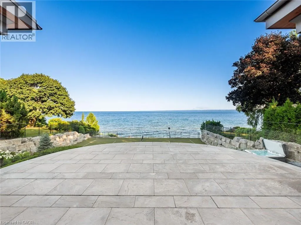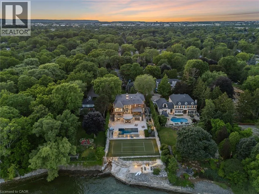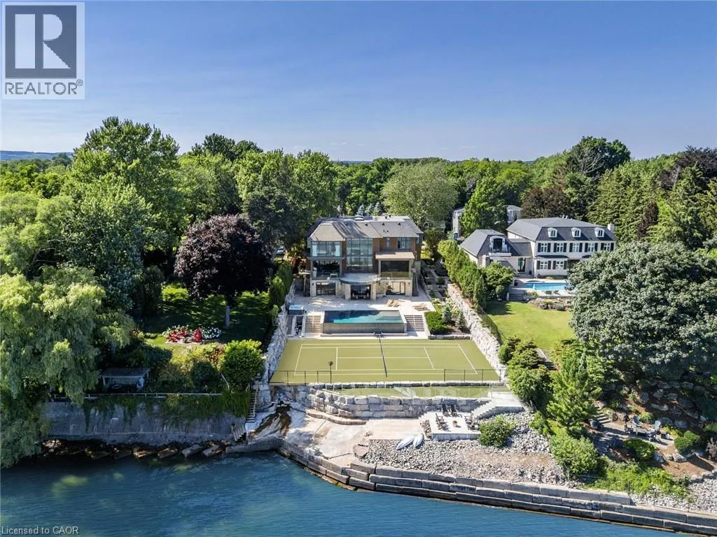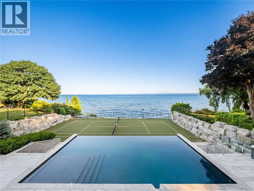 Lakeshore Road to Secord Lane The Haven. A rare waterfront estate on a private laneway in South Burlington. Set on nearly ¾ of an acre with 103 ft of shoreline and full riparian rights, this property offers privacy, direct lake access, 11,417 Sqft of living space and a lifestyle that feels like a luxury resort without leaving home. Inside, the lake takes centre stage. Floor to ceiling windows in the great room frame the view, anchored by 22 ft ceilings, a dramatic full-height stone fireplace, and a skylight that floods the space with light. A second living room provides another place to unwind, while a private office with 18 ft beamed ceilings and a stone feature wall inspires focus. Designed by architect David Small and built by Rock Cliff Custom Homes, this home is a masterclass in craftsmanship and elegance. Details like radiant heated floors throughout and heated driveway ensure year-round comfort. Three outdoor terraces extend the living space. One includes a full outdoor kitchen with built-in BBQ, fridge, and bar sink; another is heated and screened for cooler nights. An additional custom stone patio sits at the waterâs edge. The backyard is a showstopper. An infinity edge pool appears to spill into the lake, while a private tennis court adds to the resort feel. Inside the kitchen features a large quartz island, Sub- Zero, Miele, and Wolf appliances, and custom cabinetry. A generous mudroom and main-floor laundry offer everyday function. Upstairs are four bedrooms, each with an ensuite. The primary suite enjoys panoramic lake views, a spa-like ensuite, and a custom dressing room with center island. A second laundry room is also on this level. The w/o lower level includes a lounge and bar, wine cellar, golf simulator, gym with lake views, sauna, tiered theatre, guest suite, and 3 additional bathrooms. An oversized 4-car tandem garage completes the home. Just minutes to downtown Burlington and a short drive to Toronto and Niagara, this is lakeside living without compromise. Luxury Certified. (id:27476)