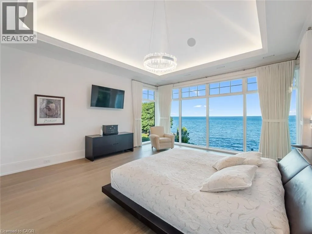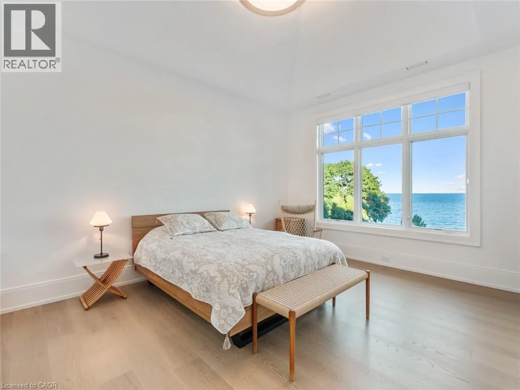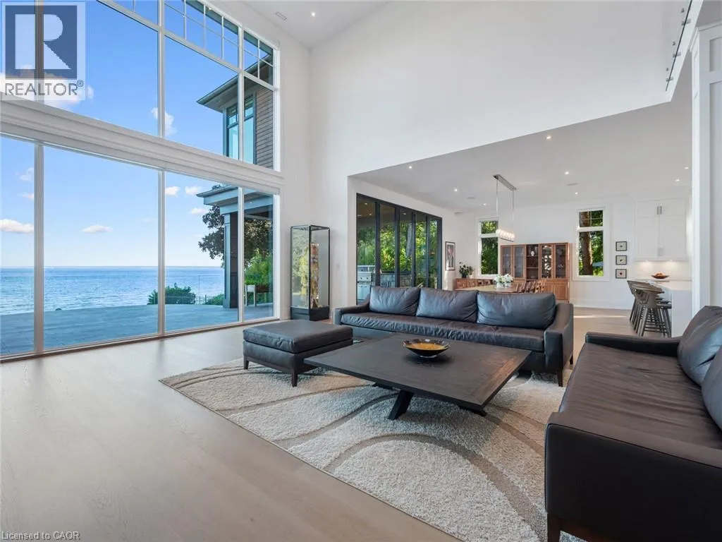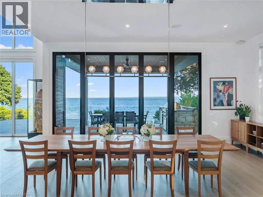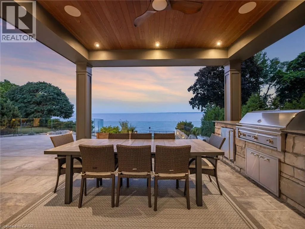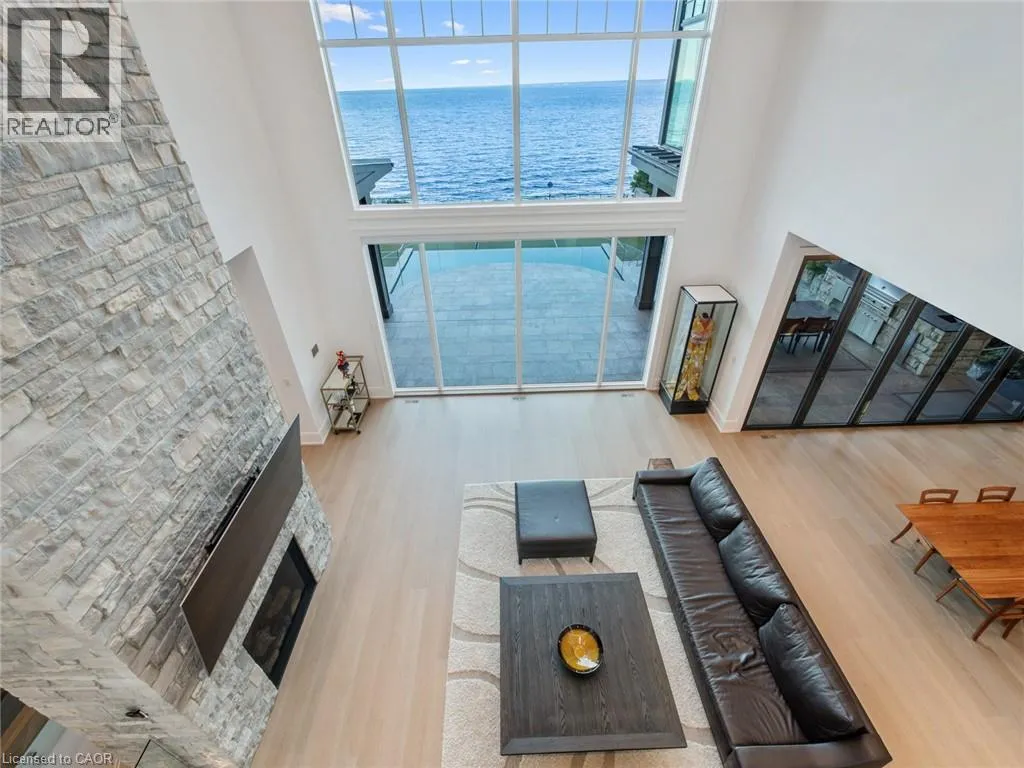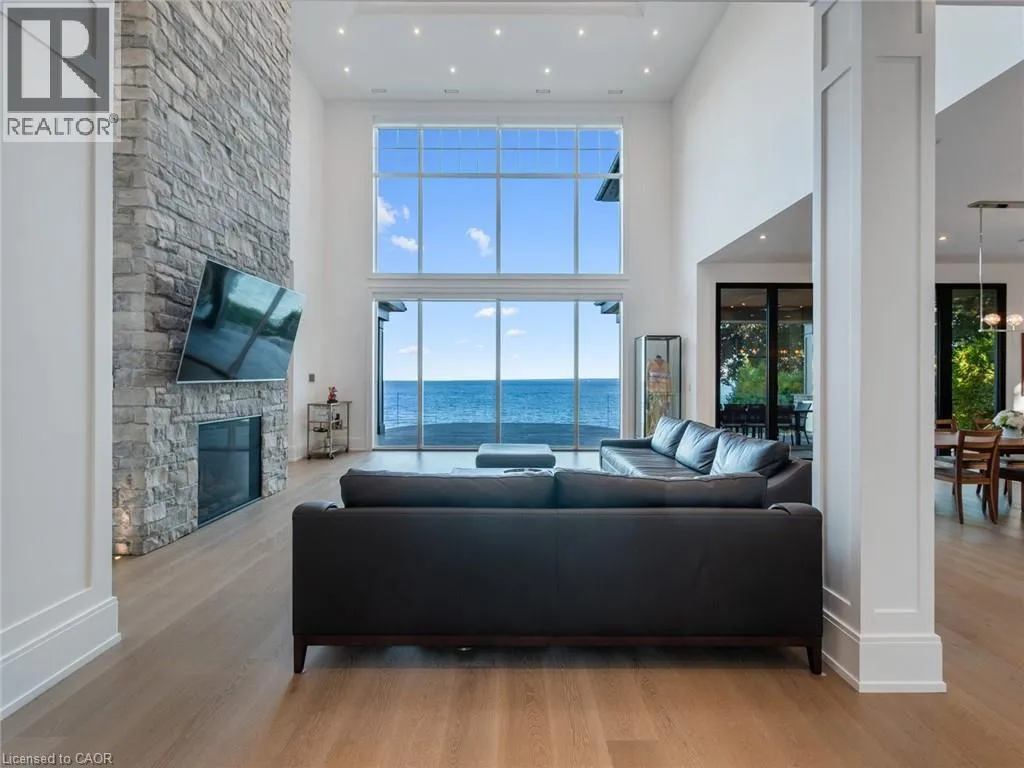 Lakeshore Road to Secord Lane The Haven. A rare waterfront estate on a private laneway in South Burlington. Set on nearly ¾ of an acre with 103 ft of shoreline and full riparian rights, this property offers privacy, direct lake access, 11,417 Sqft of living space and a lifestyle that feels like a luxury resort without leaving home. Inside, the lake takes centre stage. Floor to ceiling windows in the great room frame the view, anchored by 22 ft ceilings, a dramatic full-height stone fireplace, and a skylight that floods the space with light. A second living room provides another place to unwind, while a private office with 18 ft beamed ceilings and a stone feature wall inspires focus. Designed by architect David Small and built by Rock Cliff Custom Homes, this home is a masterclass in craftsmanship and elegance. Details like radiant heated floors throughout and heated driveway ensure year-round comfort. Three outdoor terraces extend the living space. One includes a full outdoor kitchen with built-in BBQ, fridge, and bar sink; another is heated and screened for cooler nights. An additional custom stone patio sits at the waterâs edge. The backyard is a showstopper. An infinity edge pool appears to spill into the lake, while a private tennis court adds to the resort feel. Inside the kitchen features a large quartz island, Sub- Zero, Miele, and Wolf appliances, and custom cabinetry. A generous mudroom and main-floor laundry offer everyday function. Upstairs are four bedrooms, each with an ensuite. The primary suite enjoys panoramic lake views, a spa-like ensuite, and a custom dressing room with center island. A second laundry room is also on this level. The w/o lower level includes a lounge and bar, wine cellar, golf simulator, gym with lake views, sauna, tiered theatre, guest suite, and 3 additional bathrooms. An oversized 4-car tandem garage completes the home. Just minutes to downtown Burlington and a short drive to Toronto and Niagara, this is lakeside living without compromise. Luxury Certified. (id:27476)