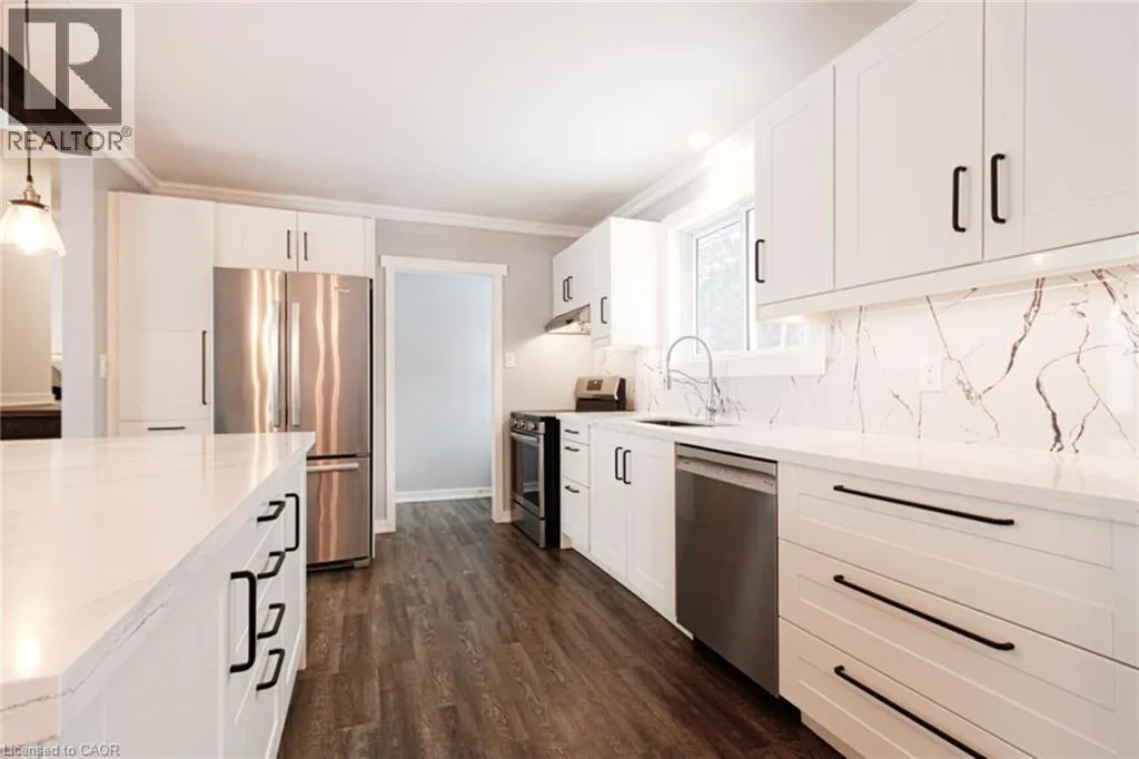 New St/Pinedale/Mullin/Cindy Elegant 3 level sidesplit with professionally completed stucco exterior elevation adding curb appeal to this family home! Modern open concept main floor Living Room, Dining Room & the renovated Kitchen comes complete with centre island, quartz counters, SS appliances, custom backsplash & crown moulding. Upper level features 3 good sized bedrooms & renovated 4pc bath. The lower level, with separate entrance, expands your living space with a large/bright Rec Room, 3pc bath & laundry room. Professionally landscaped front & backyard. The fully fenced rear garden with inviting entertainment deck & garden shed. Parking for 7 cars (2 in garage & 5 on the driveway). The oversized (24'x 23') double car garage with woodburning fire stove & windows is great for workshop or studio. (id:27476)
