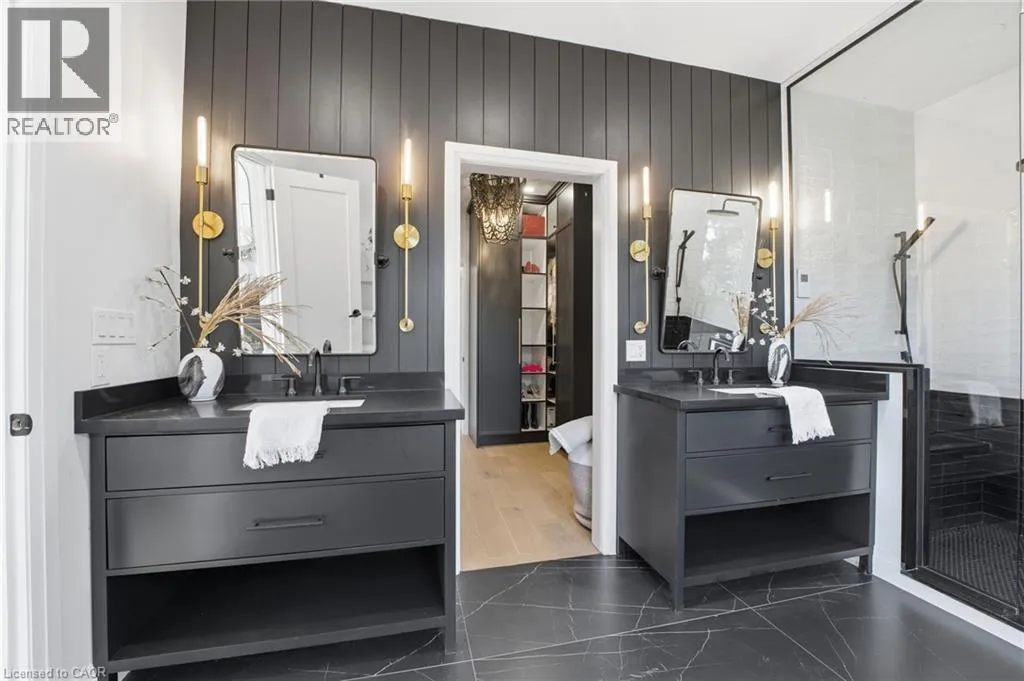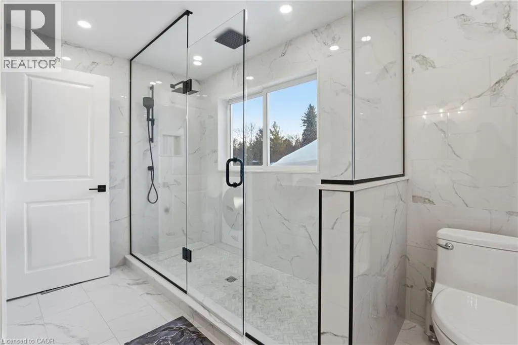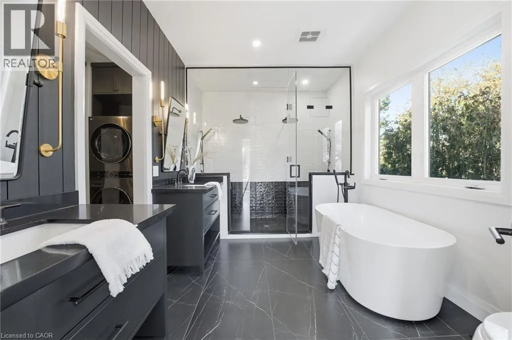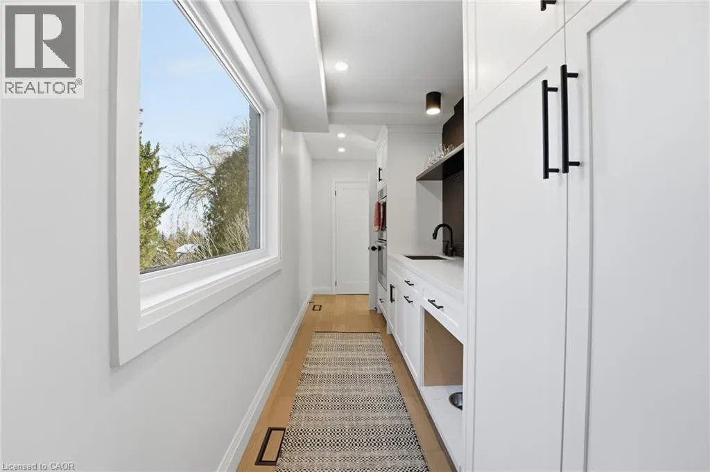 Dundas St., west of Brant St., halfway up the hill. This stunning two-storey home is the definition of modern luxury. Extensively renovated over the past four years, it sits on a rare half-acre lot, offering a peaceful, country-like feel right in the heart of Burlington. Inside, youâll find 4 bedrooms, 3.5 bathrooms, with 4,323 sq. ft. of living space. Engineered hardwood throughout, solid panel interior doors, pot lighting, and premium finishes in every room. Oversized windows and thoughtful design allow natural light to flood the home throughout the day. A spacious formal dining room sits just off the chefâs kitchen, which showcases high-end Thermador appliances, Venetian porcelain countertops on island, backsplash, and custom range hood. A completely hidden butlerâs area includes a second oven, build-in microwave, additional sink, and a walk-in pantry, perfect for seamless entertaining. Custom sliding doors off the living room open to a large deck and a beautifully private, fully fenced-in backyard, ideal for hosting or future pool plans. The main floor also offers a dedicated office, perfect for working from home. A separate hallway off the living room leads to two additional bedrooms that share a spacious Jack & Jill bathroom. Upstairs, the private primary wing includes a large bedroom, spa-inspired ensuite with heated floors, a walk-in closet with washer and dryer, and a private balcony with city views overlooking the backyard. All full bathrooms feature heated floors. A self-contained in-law suite offers its own entrance, full kitchen, living room with coffered ceilings, large bedroom with ensuite, in-suite laundry, and a private deck, ideal for multigenerational living or guests. The finished basement adds flexible space for a playroom, gym, media lounge, or sauna. An attached 1-car garage with inside entry completes this exceptional home. Luxury, space, and sophistication, this home truly has it all. (id:27476)