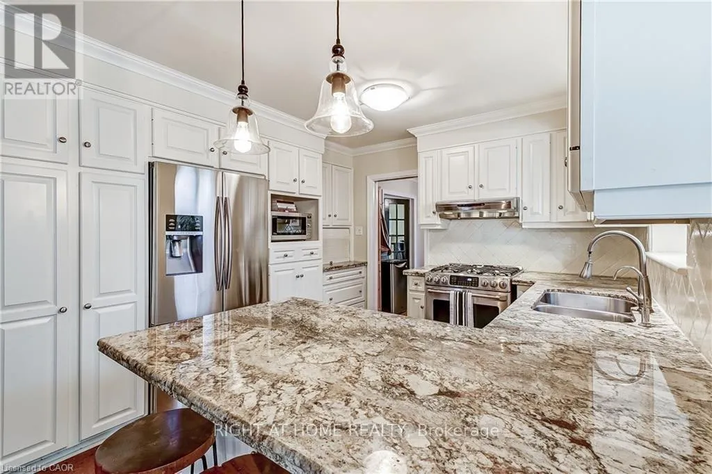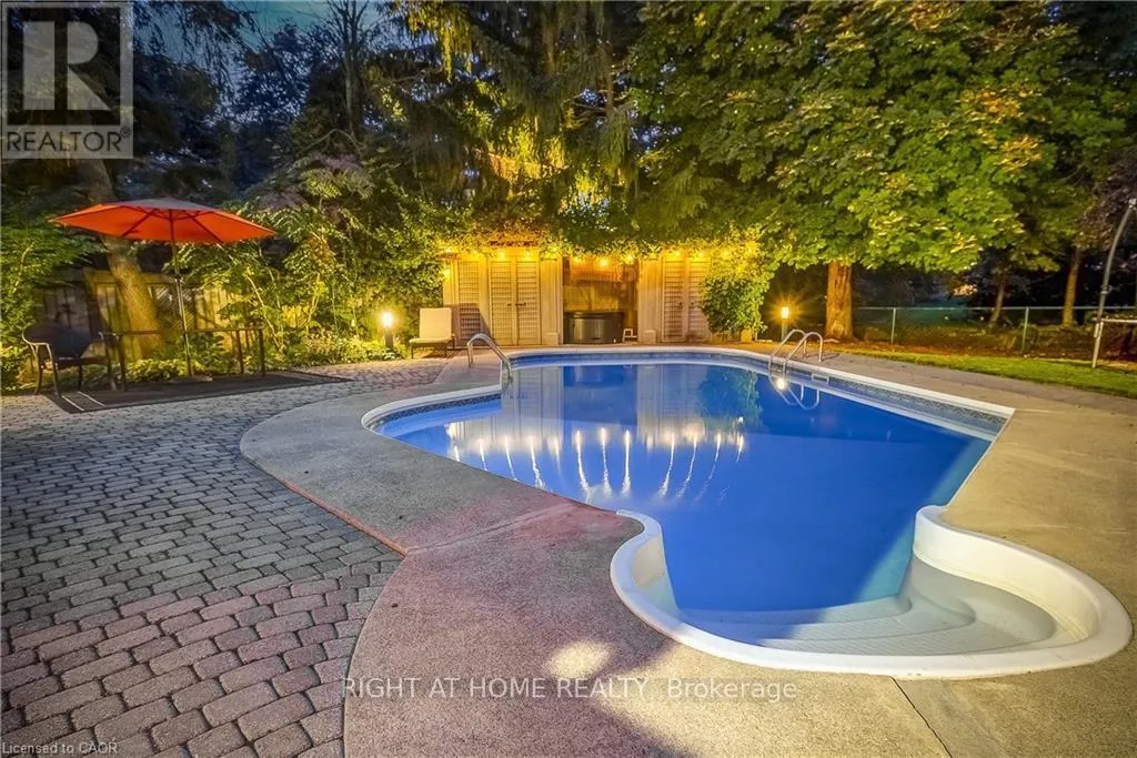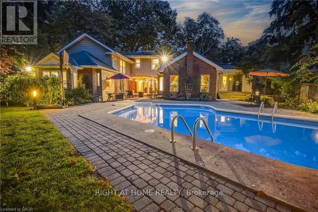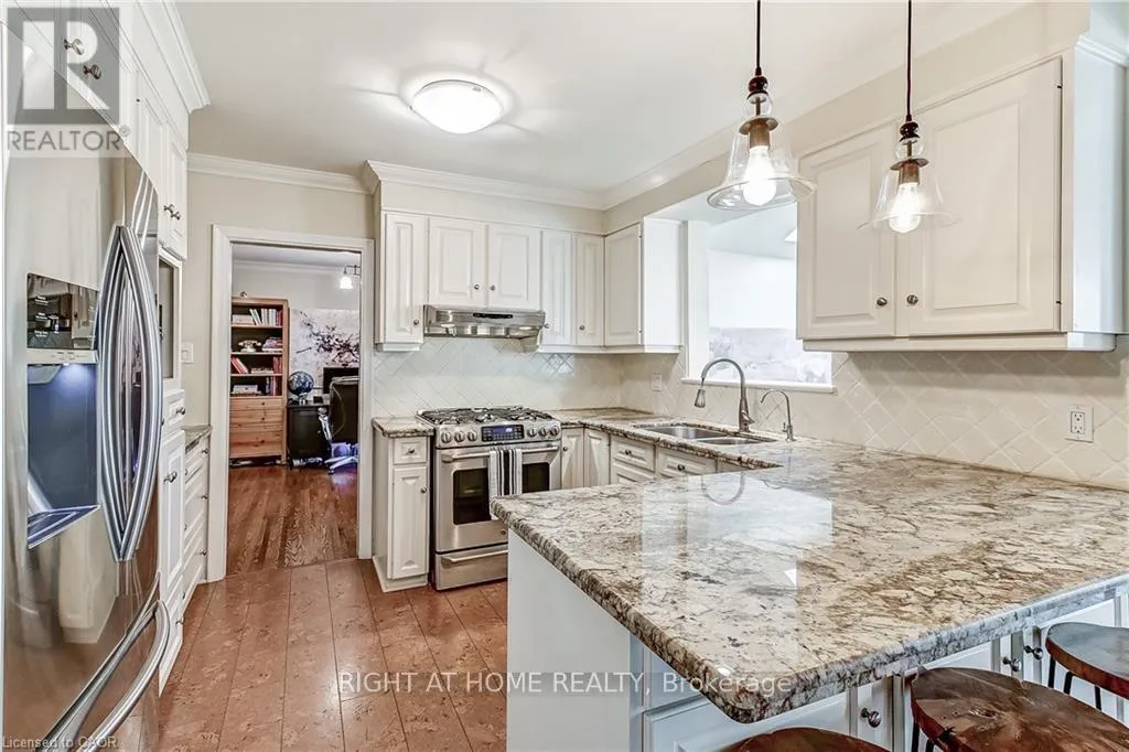 Guelph Line/Lakeshore Welcome to this sprawling executive 4 level home in the coveted Roseland community. Just steps away from vibrant downtown Burlington, the lake and within sought after school catchment. From the moment you arrive, you will be impressed with the lovely curb appeal this home offers on a premium 80 foot wide lot, double car garage and parking of up to 5 cars. Once inside the spacious foyer, you'll step up to a large welcoming living room perfect for entertaining and enjoying the warmth of the wood burning fireplace. The kitchen featuring stainless steels appliances and stone countertops flow effortlessly to the main floor office, dining room and grand family room with vaulted ceilings, skylights and wood burning fireplace. Convenient main floor primary bedroom suite features an atrium ceiling, a 5 piece ensuite, walk-in closet, gas fireplace & walkout to private, park-like grounds with heated in-ground pool.Second storey offers four spacious bedrooms, one featuring a 5pc ensuite and an additional 4pc bathroom. Lower level recreation room has a wood-burning fireplace, wet bar & built-in bar fridge.Relax in style within the massive backyard and perfect sanctuary for gatherings & extending outdoor enjoyment with the heated in-ground pool and serene views of the mature landscaping and perennial gardens. Enjoy the convenience of being within walking distance to downtown Burlington with its array of shops, restaurants, the arts center, Spencer Smith Park, and much more. Experience the vibrant lifestyle this community has to offer right at your doorstep. (id:27476)