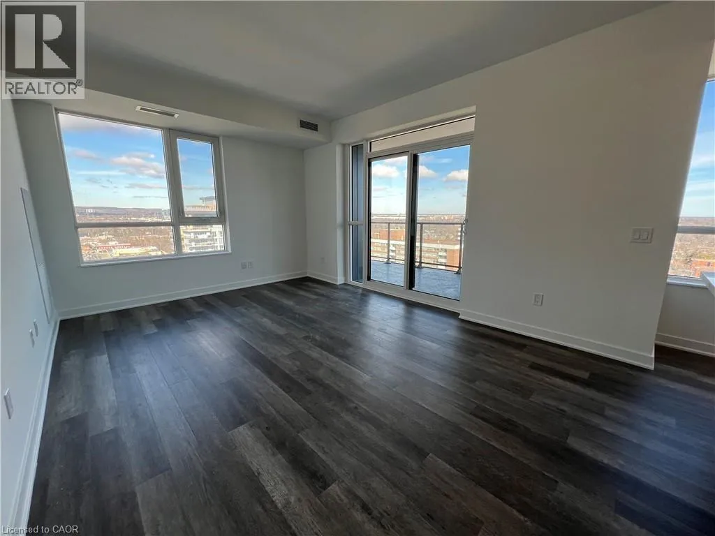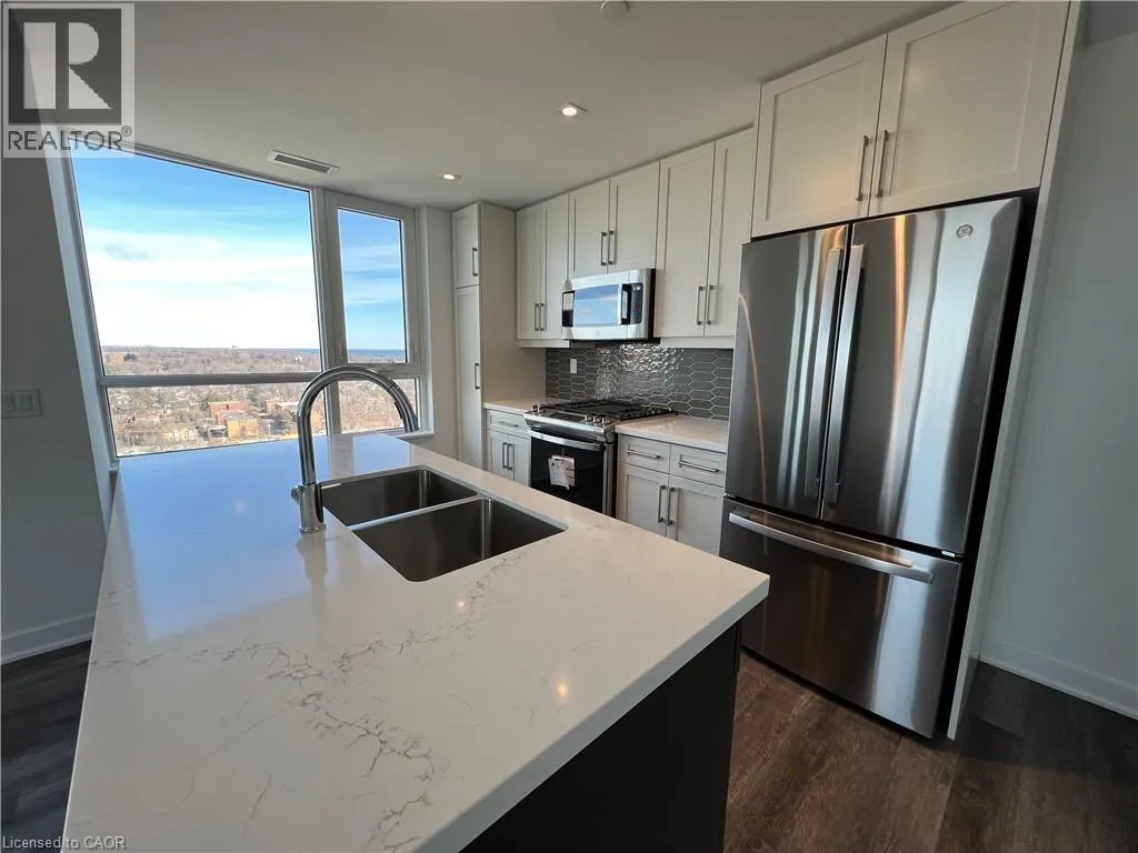 Located on the north east corner of James Street & Brant Street, downtown Burlington. Directly across from City Hall. Experience modern downtown living at Gallery Condos & Lofts with this stylish 939 sq ft Hermitage model offering 2 bedrooms, 2 full baths, wide-plank flooring, and a sleek high end kitchen with a large island, quartz counters, stainless steel appliances, and upgraded soft close cabinetry. The primary bedroom features a contemporary ensuite with a glass shower and walk-in closet, while the bright second bedroom is steps from the main 4-piece bath and in suite laundry. Step outside to a generous sized covered balcony with both a lake view and escarpment view. The Residents enjoy 24-hour concierge service and 14,000 sq ft of amenities including a party lounge, games area, fitness studio, indoor pool, yoga spaces, bike storage, guest suite, and a rooftop terrace with BBQs and sweeping views of Lake Ontario. Located across from City Hall and moments from Spencer Smith Park, restaurants, shops, transit, and the QEW, this 22-storey building also includes a storage locker and 2 underground parking spots for added convenience. This is an absolute must see. (id:27476)