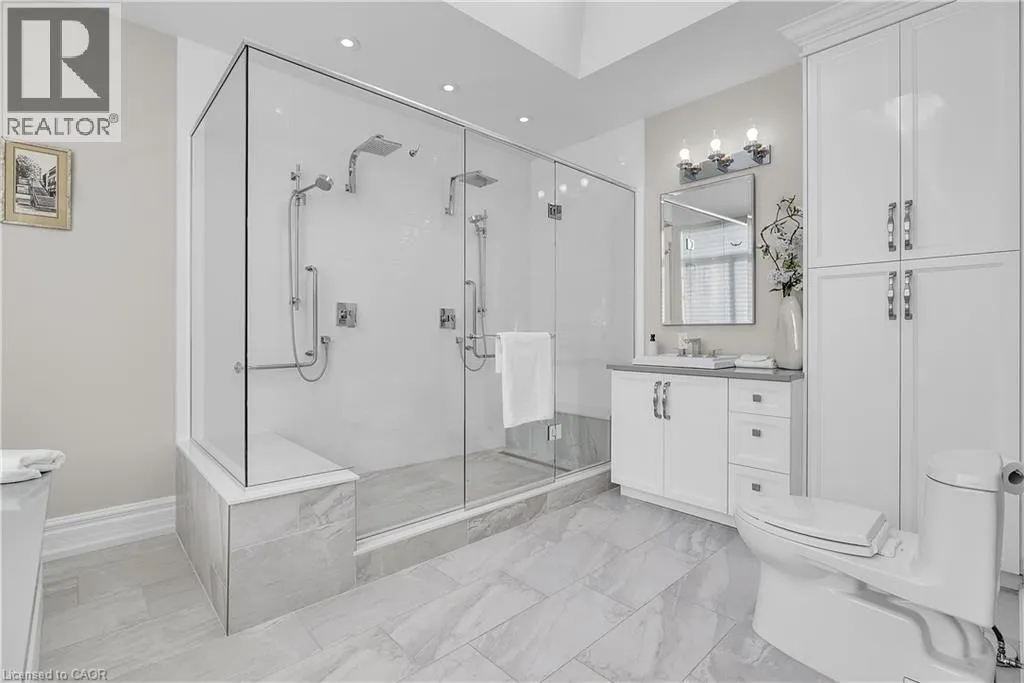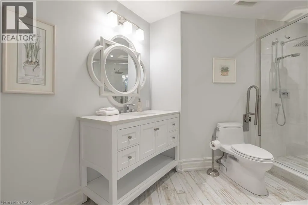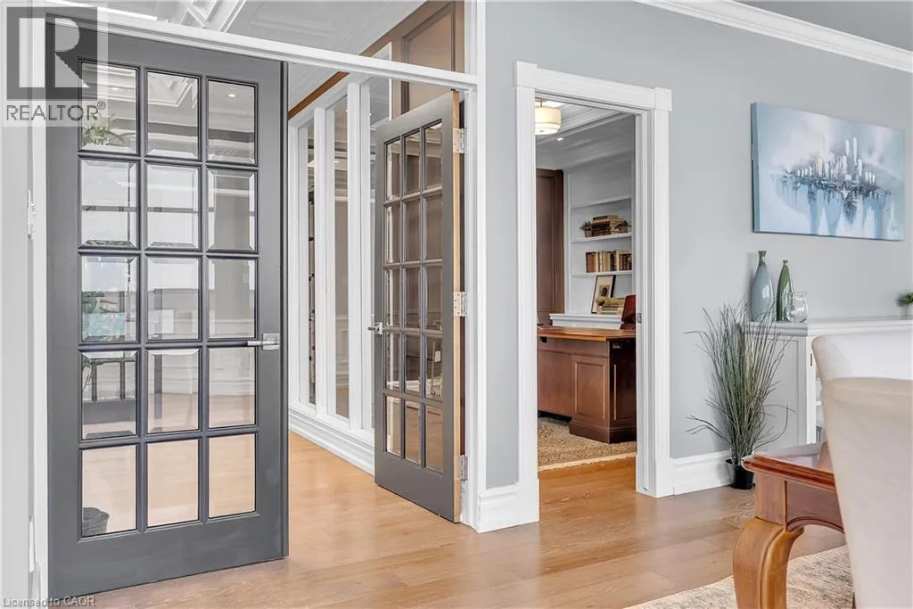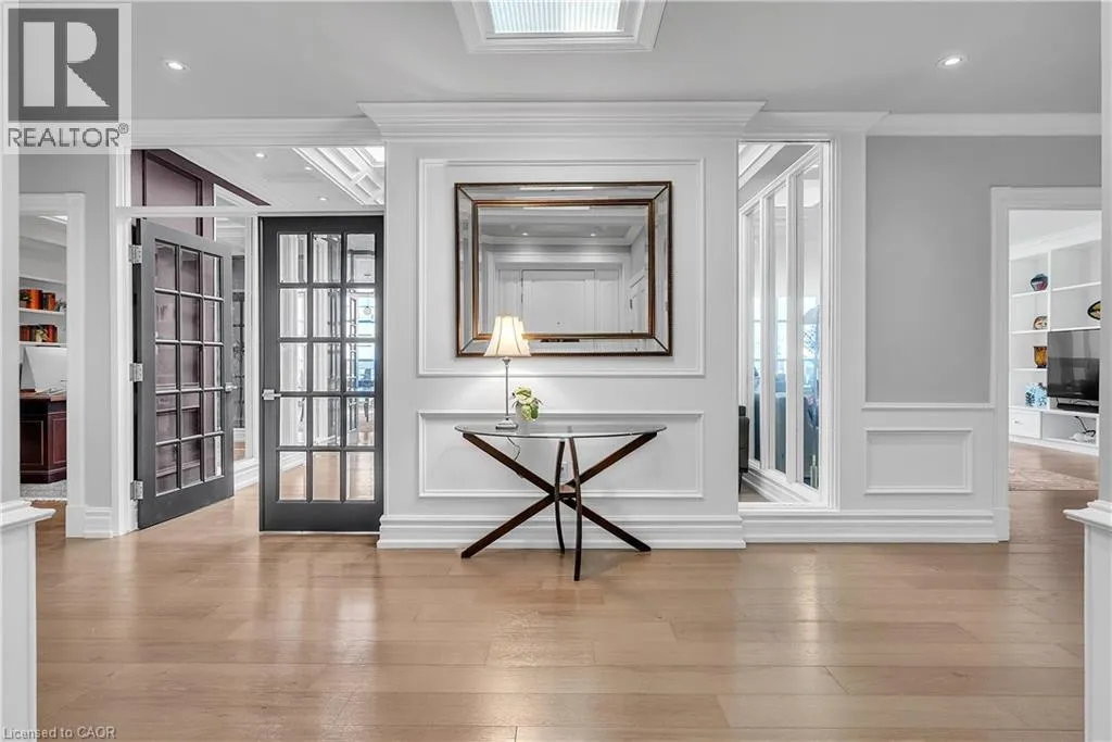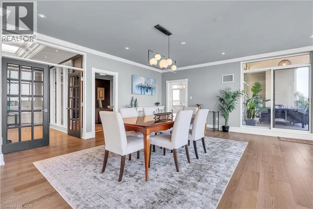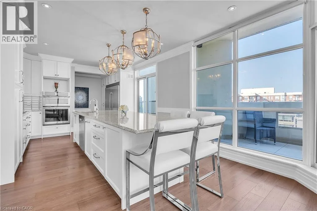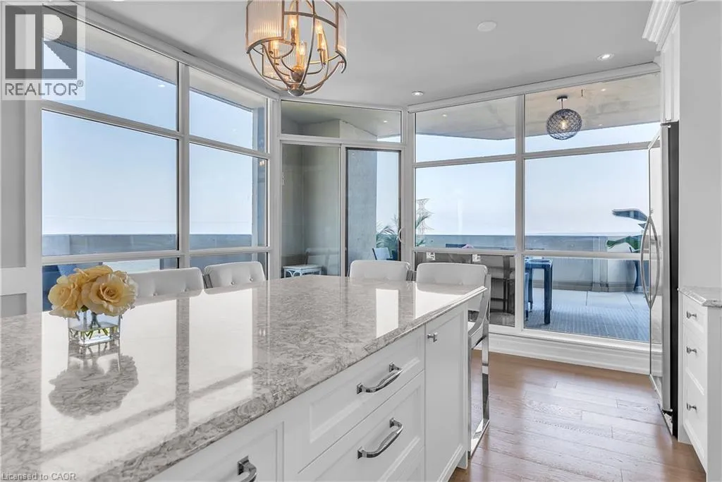 Located on the North side of North Shore Blvd East to the northeast of Joseph Brant Hospital This extraordinary penthouse is the only residence on the top floor of this fabulous tower, offering unmatched privacy and exclusivity. With more than 4,000 sq ft of refined single-level living and nearly 1300 sq ft wraparound terrace, it captures breathtaking views of Lake Ontario, the Burlington skyline, and the Skyway Bridge. Through the grand unit door, the impressive entry foyer sets the tone with its skylight, custom millwork, and generous closets. Beyond, the home unfolds with soaring ceilings, engineered hardwood floors, and luminous natural light streaming through walls of spectacular windows and multiple skylights. Expansive principal rooms flow seamlessly, ideal for both grand entertaining and intimate everyday living. The open-concept living and dining areas are complemented by a fireplace and sophisticated wet bar, and offer easy access to the terrace for effortless indoor-outdoor living. The gourmet kitchen blends style and function, featuring stone counters, a dining island, stainless appliances, and windows on two sides framing captivating lake views. Two sprawling, stately bedrooms each enjoy lavish ensuites, walk-in closets, and their own private terraces. A richly appointed office with custom built-ins and a skylit den with coffered ceiling add elegance and versatility. Practicality is equally considered in this exquisite home with a powder room, ample in-suite storage, a large locker, and three premium underground parking spaces. Monthly condo fees include all utilities except hydro, offering simplicity and peace of mind. The building itself is impeccably maintained, with on-site superintendent, outdoor pool, gym, party room, workshop, underground visitor parking, and a warm wood-panelled lobby. Steps from Spencer Smith Park, the waterfront, hospital, and downtown Burlingtonâs shops and restaurants, this remarkable residence is among the cityâs most prestigious offerings. (id:27476)