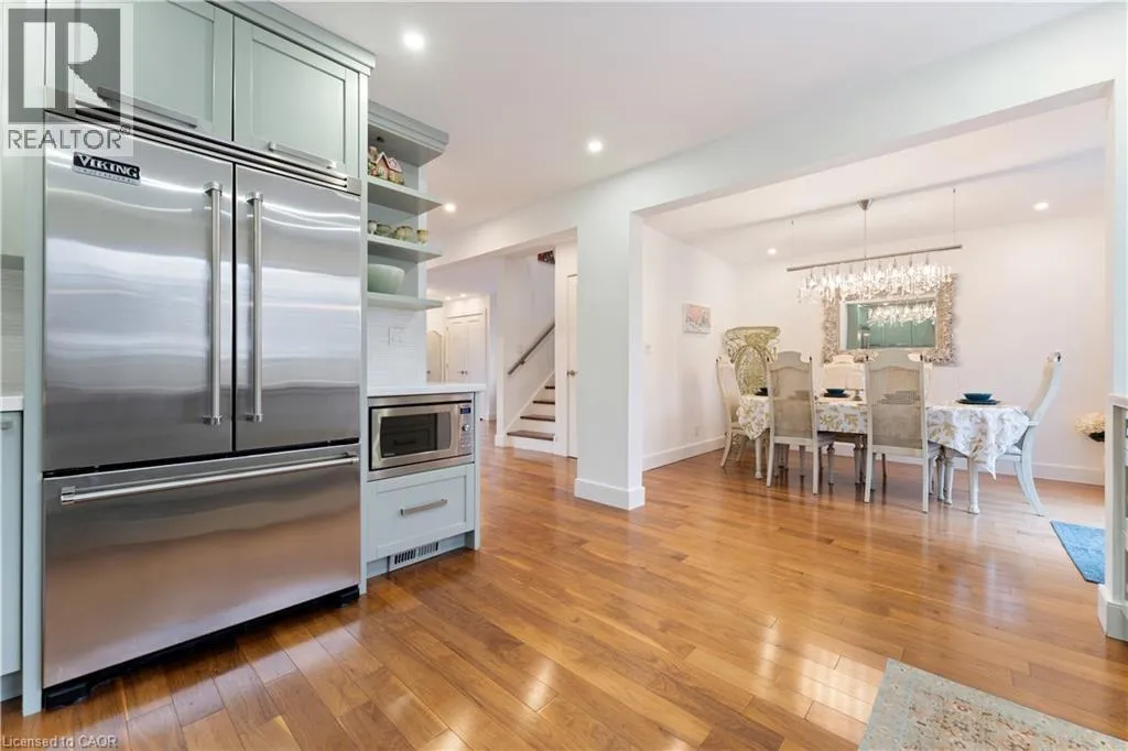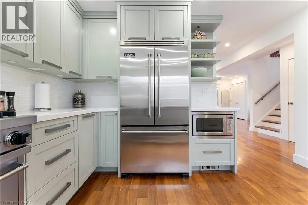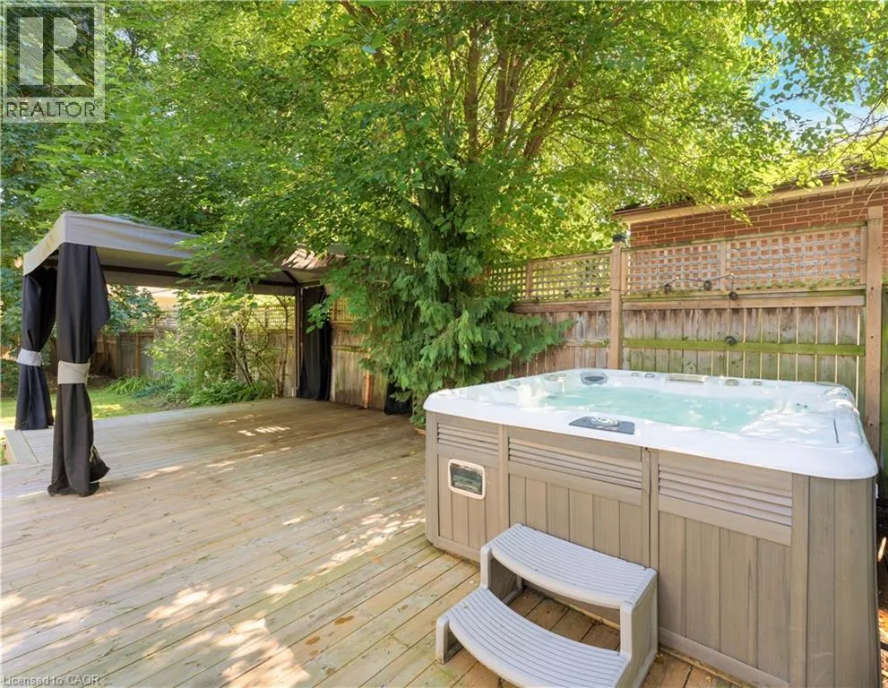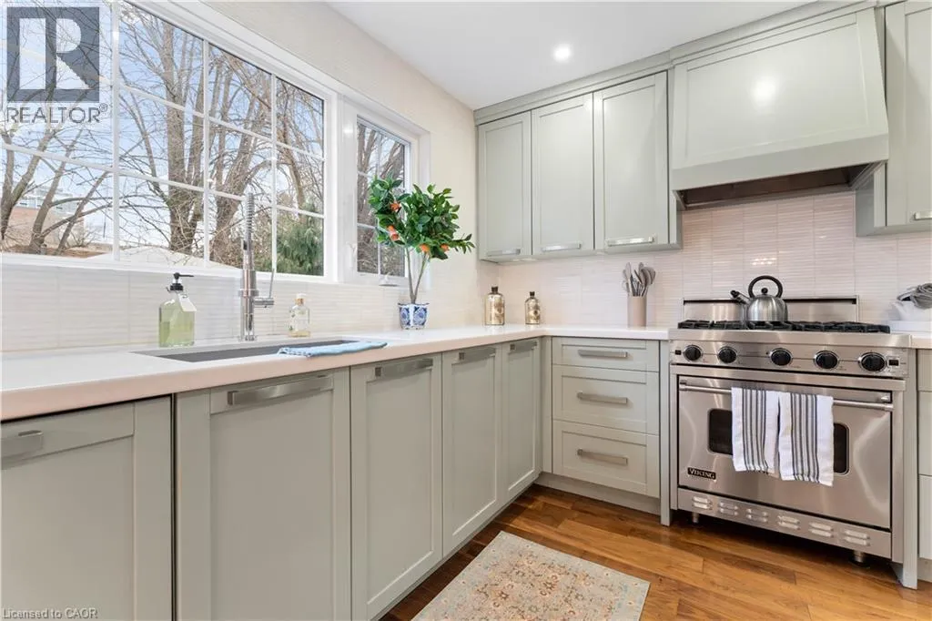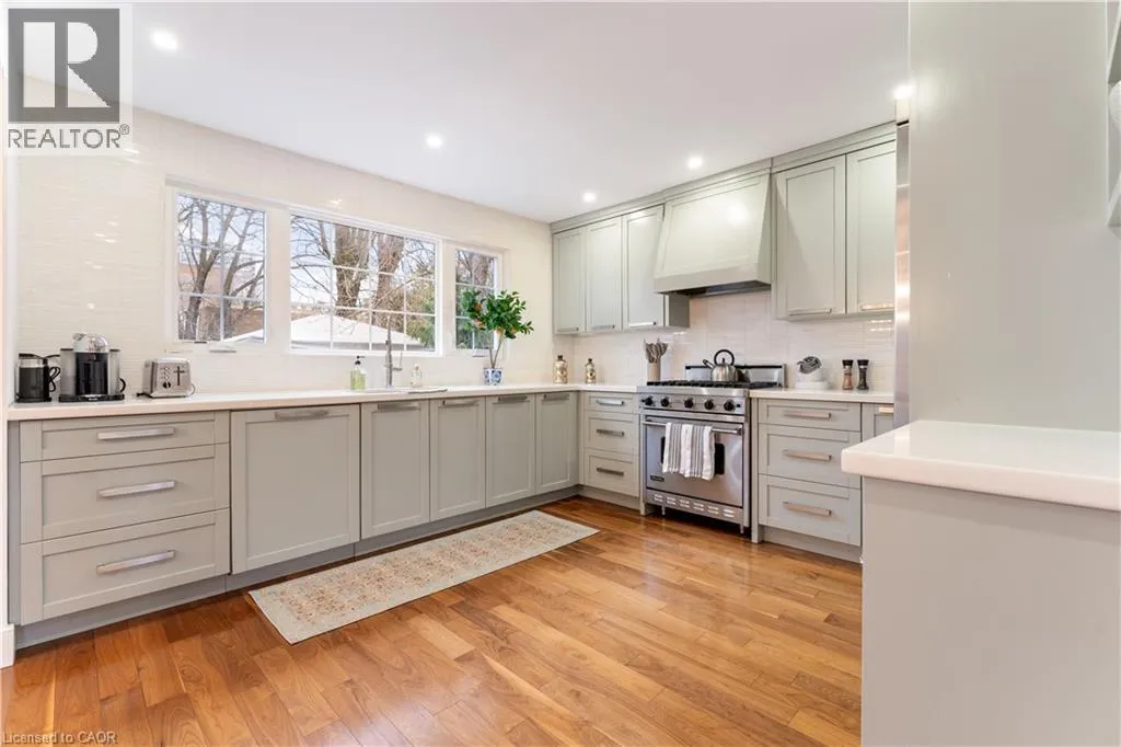 Maple Ave to Lockhart Rd to Regina Dr Walk to downtown and the lake from this beautifully renovated home on a quiet cul-de-sac. Set on an oversized 150-ft deep private lot, the property features mature perennial gardens and an interlock walkway leading to the front entrance. The open-concept main floor offers large windows, a gas fireplace, and a custom kitchen equipped with premium Viking appliances, including a gas range, dual-door refrigerator, panelled dishwasher, and built-in microwave. Patio doors off the dining area open to a private backyard with a custom wood deck and generous lawn surrounded by mature trees. Upstairs are two spacious bedrooms and a fully renovated 4-piece bathroom. The finished basement includes a separate entrance, kitchen space, open layout, and laundry, offering excellent flexibility. Ideally located within walking distance to Spencer Smith Park and Brant Street's shops and restaurants, with quick access to the QEW, Mapleview Mall, and daily amenities. (id:27476)